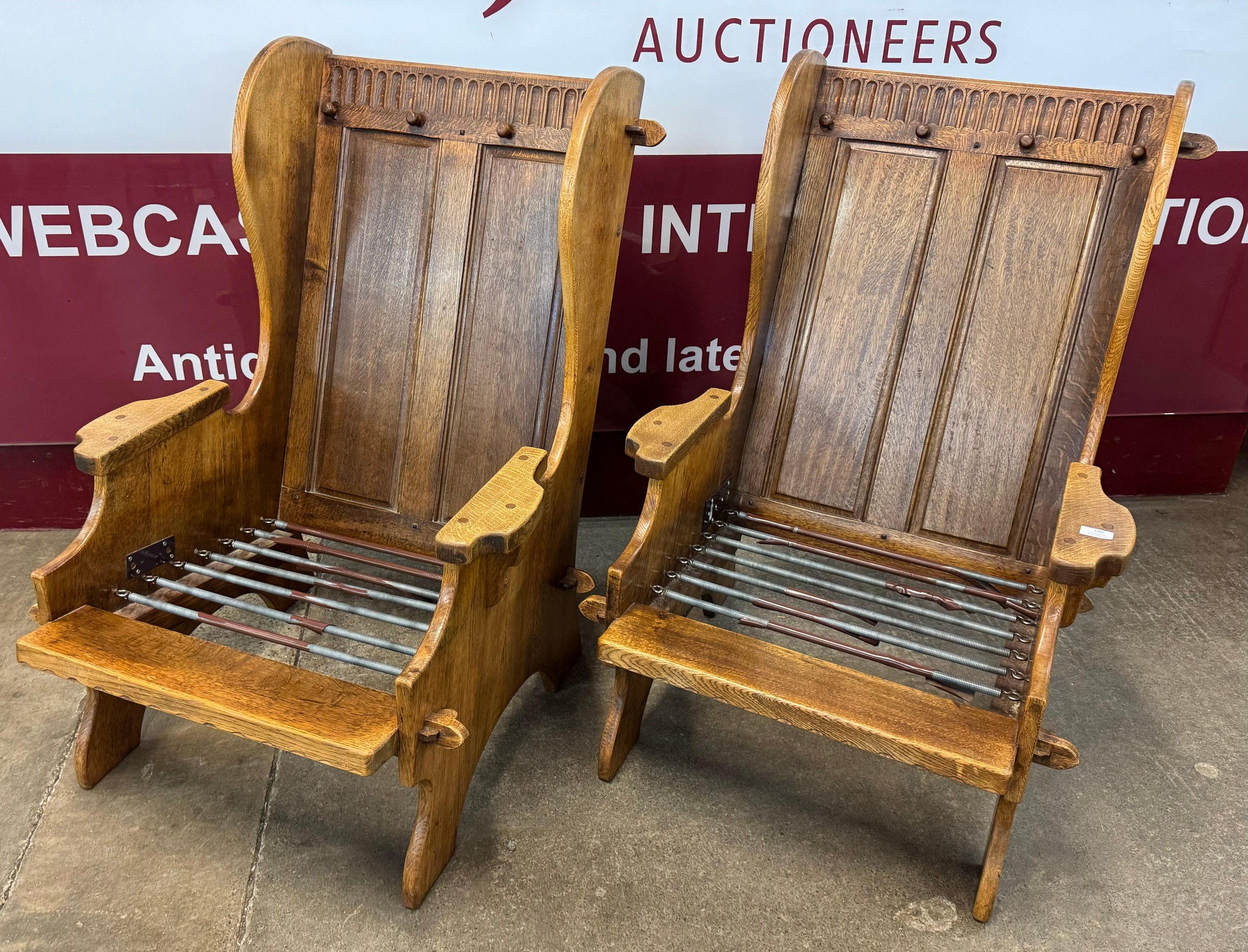 A pair of Nigel Griffiths carved oak fireside chairs
