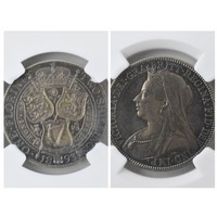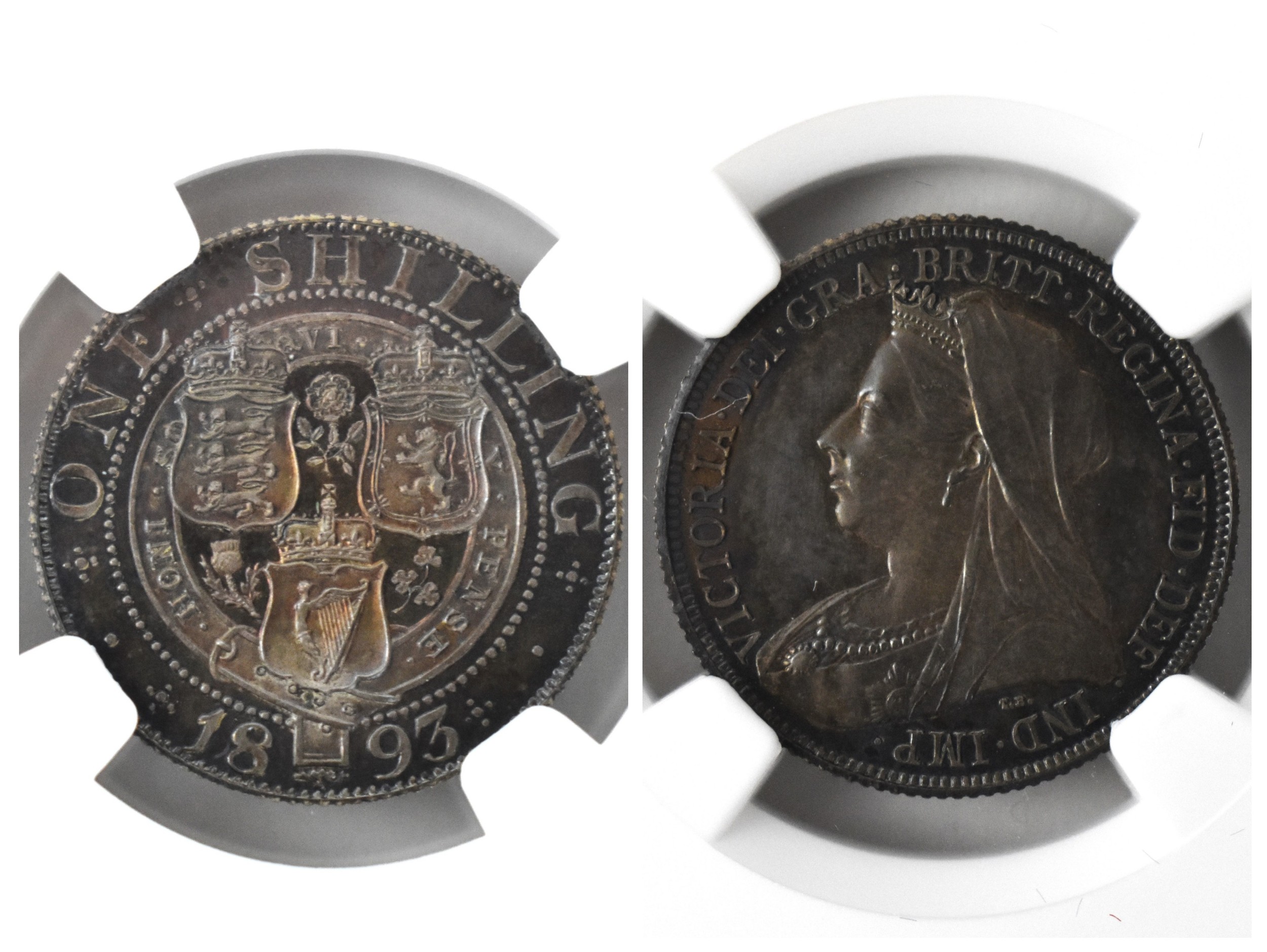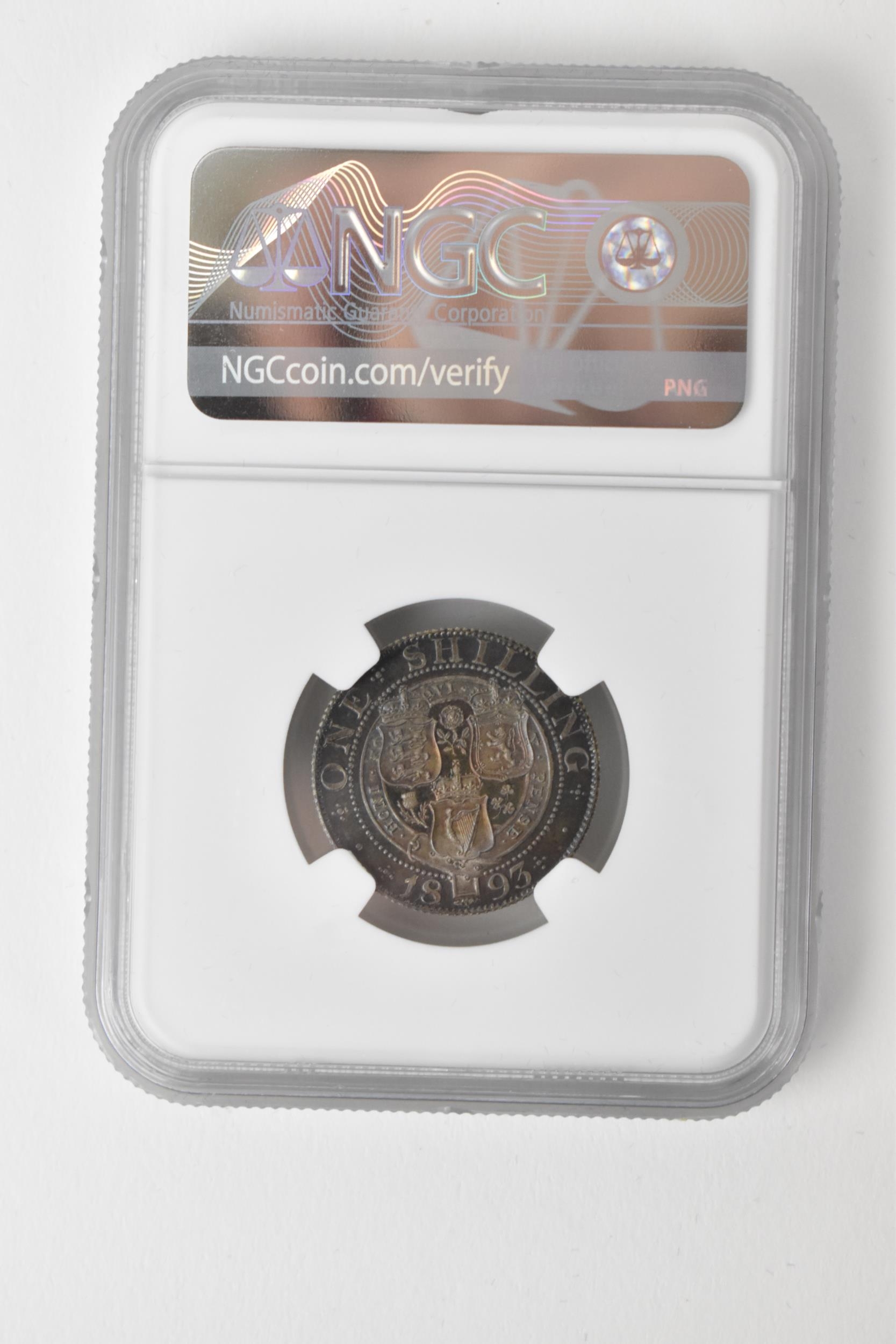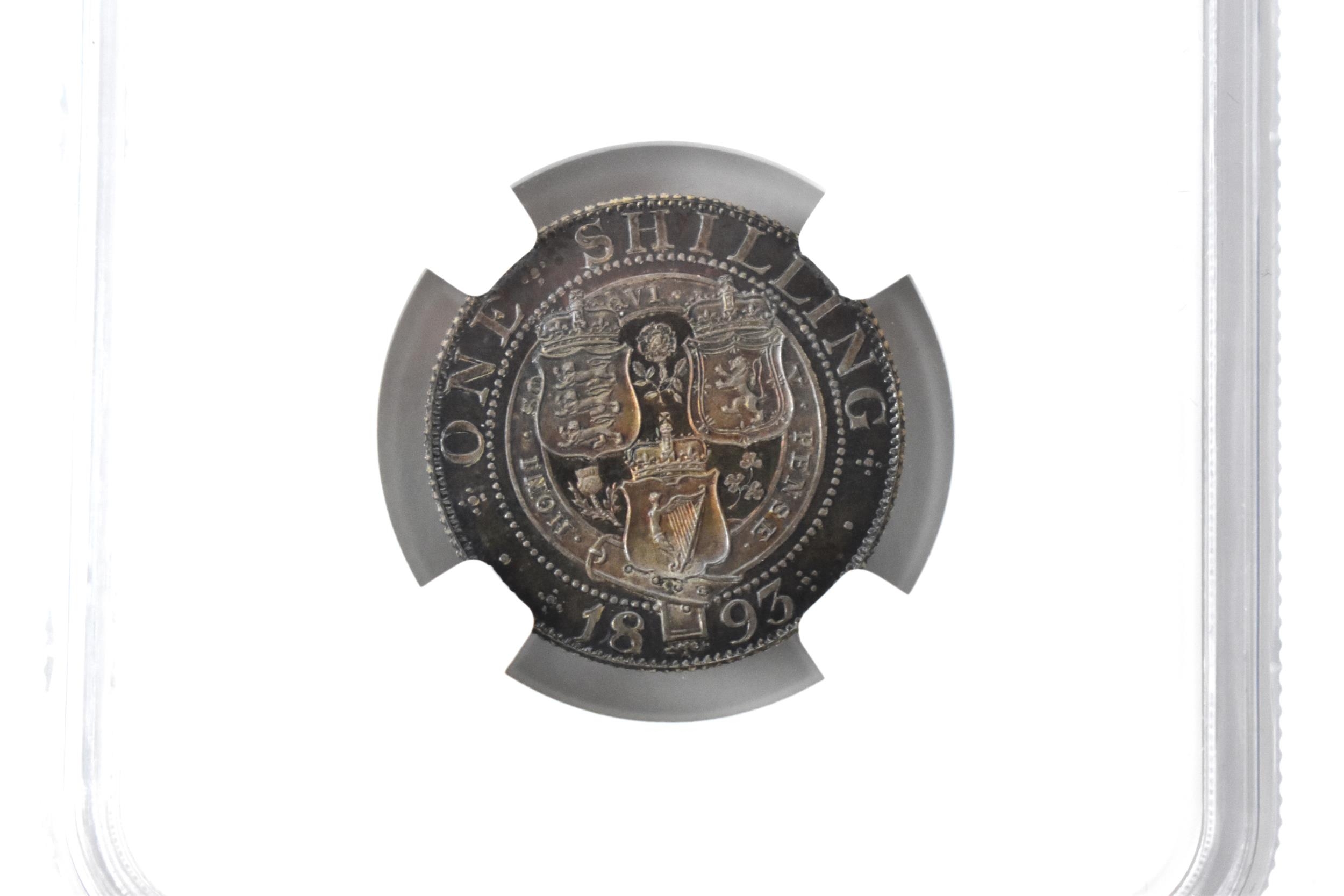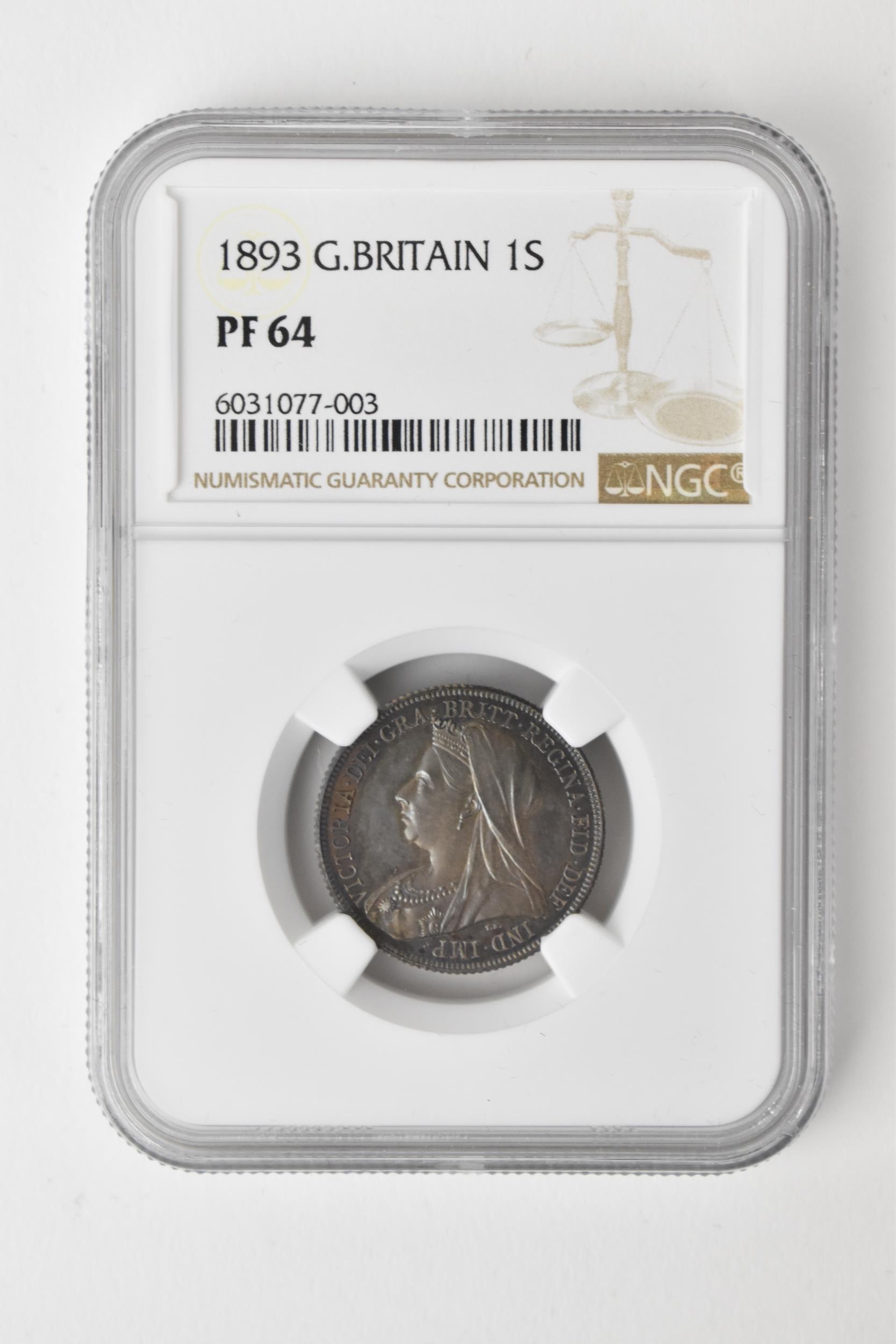 United Kingdom - Victoria (1837-1901) One Shilling, dated 1893, 3rd portrait, crowned and veiled bust, Queen Victoria, left, VICTORIA.DEI.GRA.BRITT.REGINA.FID.DEF./. crown above shields of England Scotland and Ireland, with National flowers, ONE SHILLING, in secure plastic holder, graded NGC PF 64, certification number 6031077-003