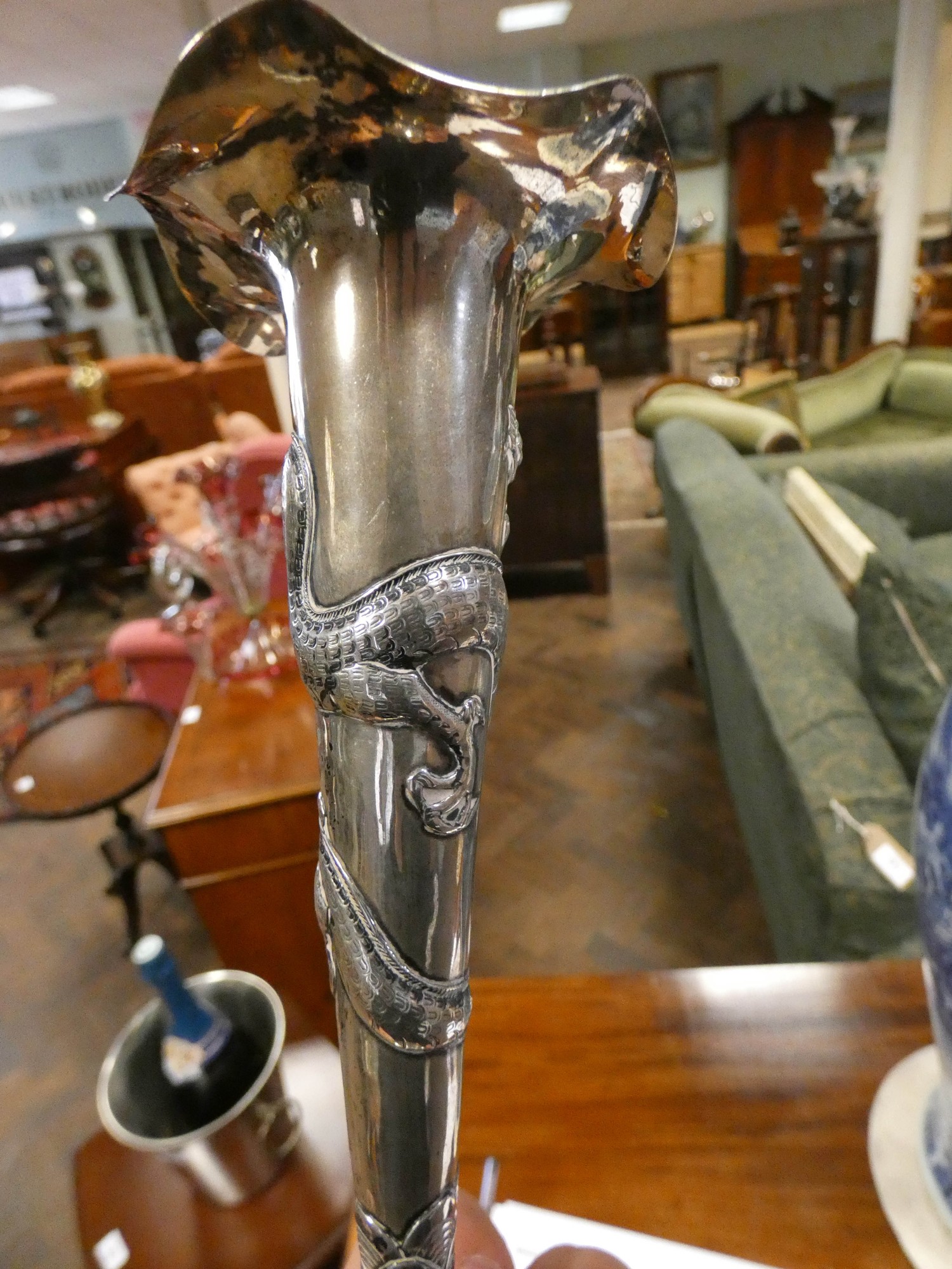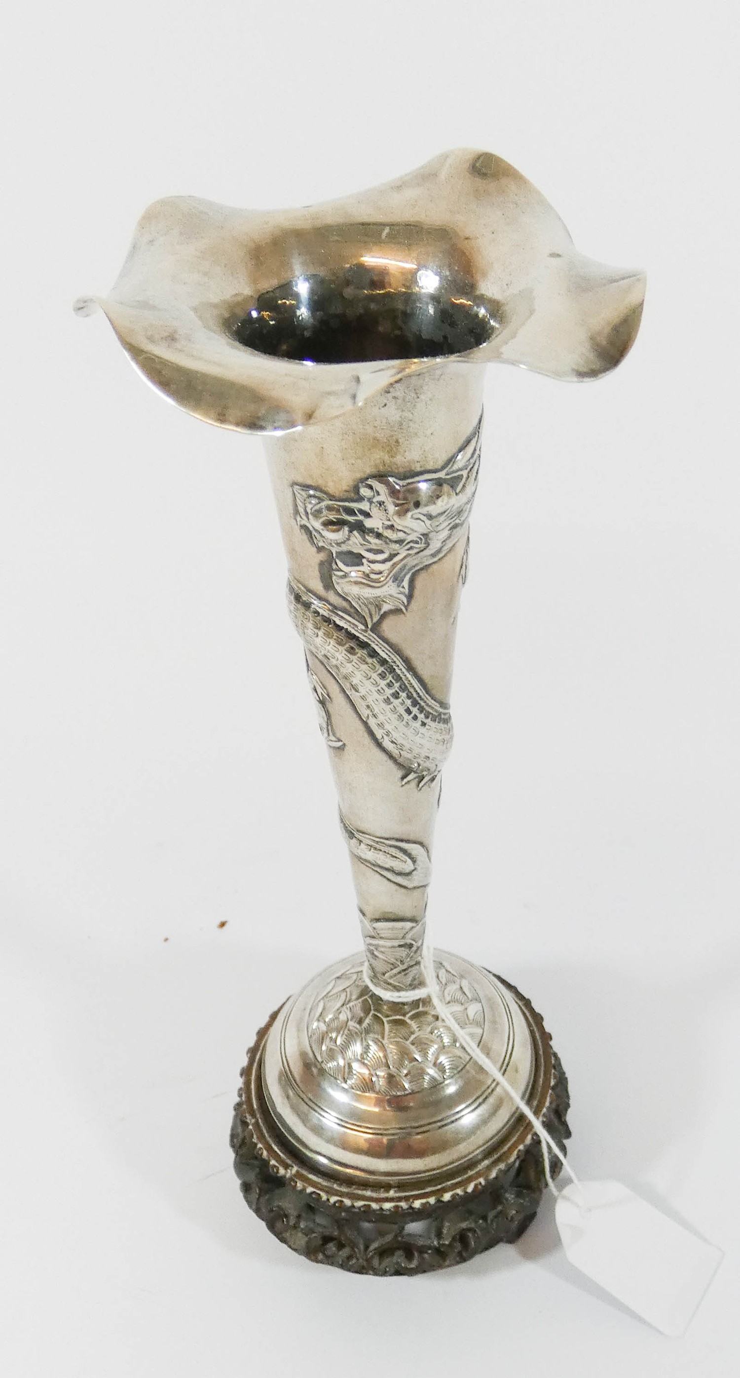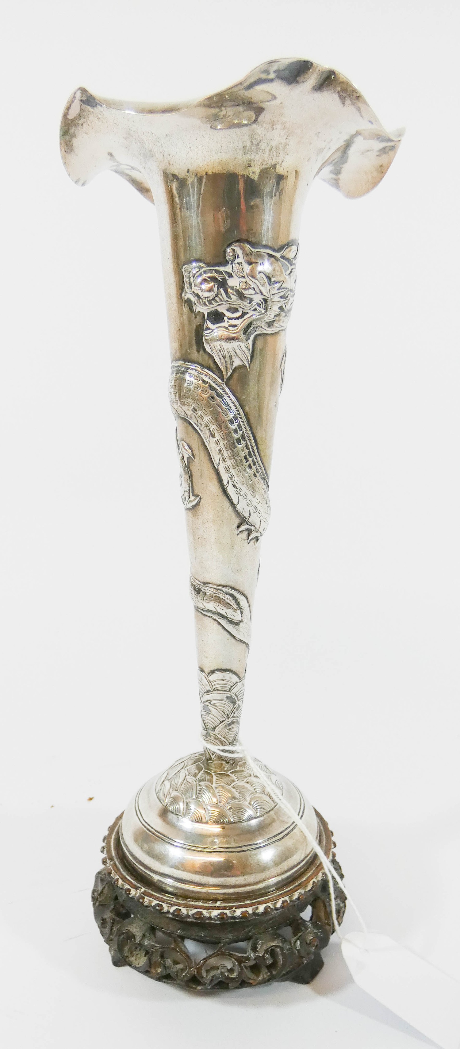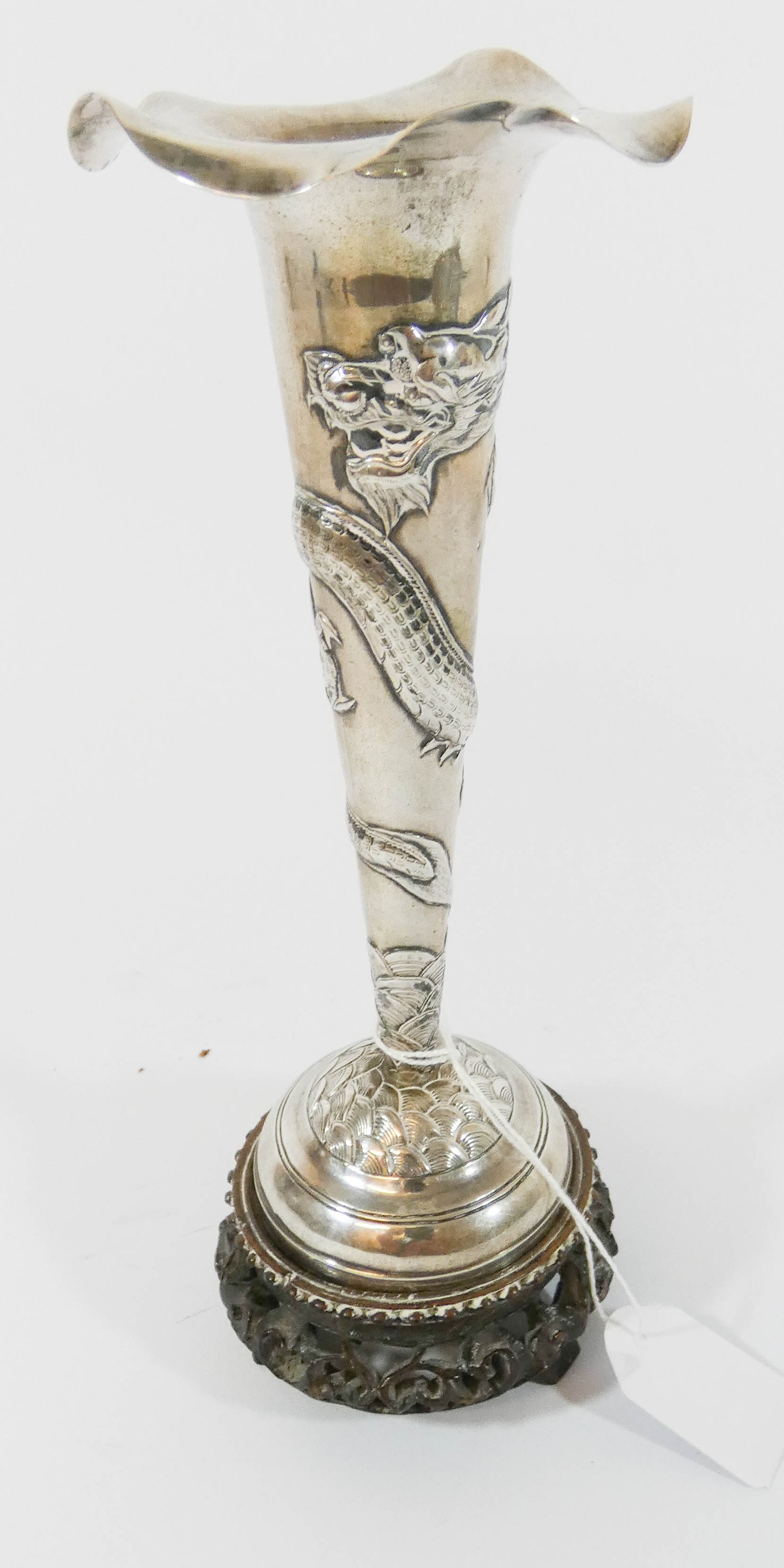 Chinese export silver vase, by Hung Chong & Co Shanghai, decorated with a coiled dragon, on carved hardwood base, overall height 20 cms tall.