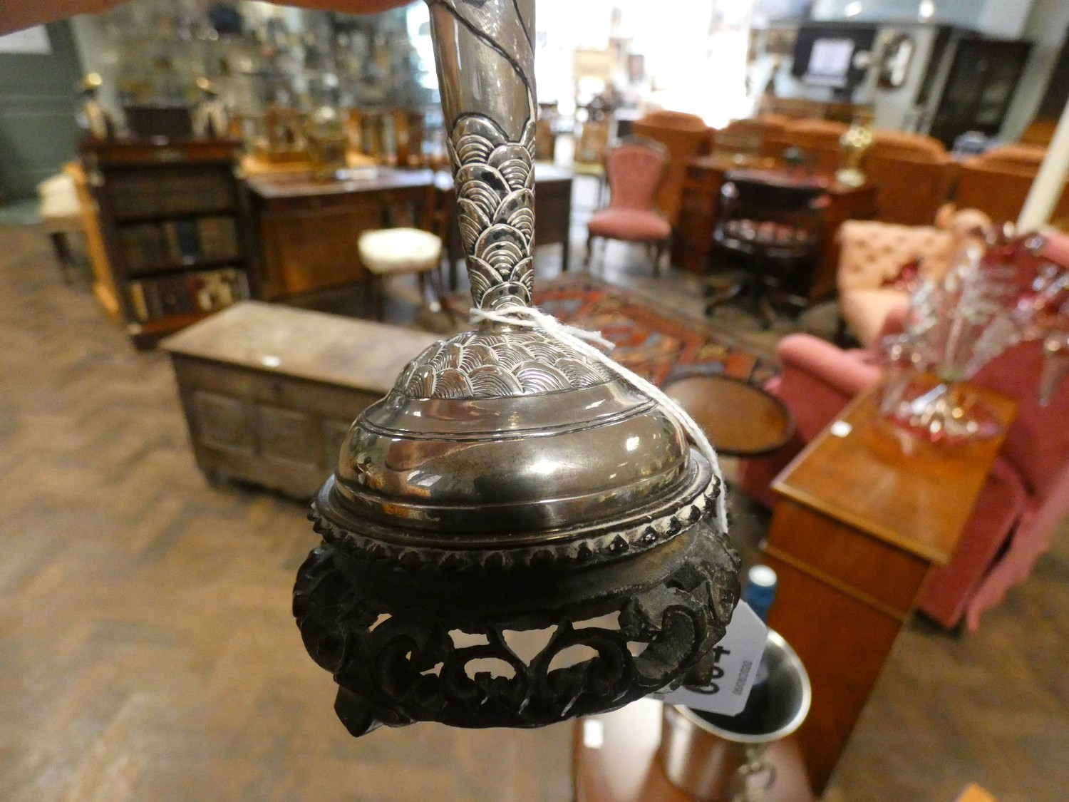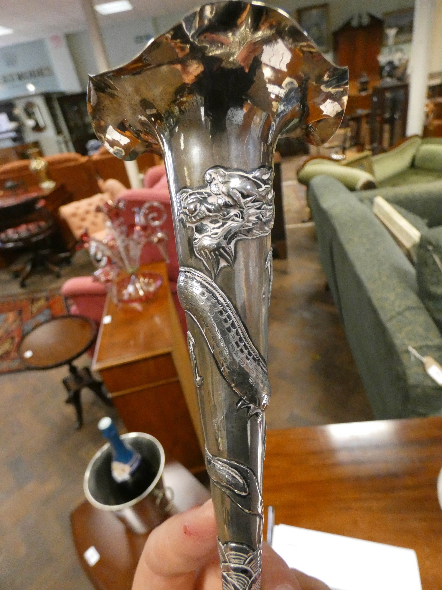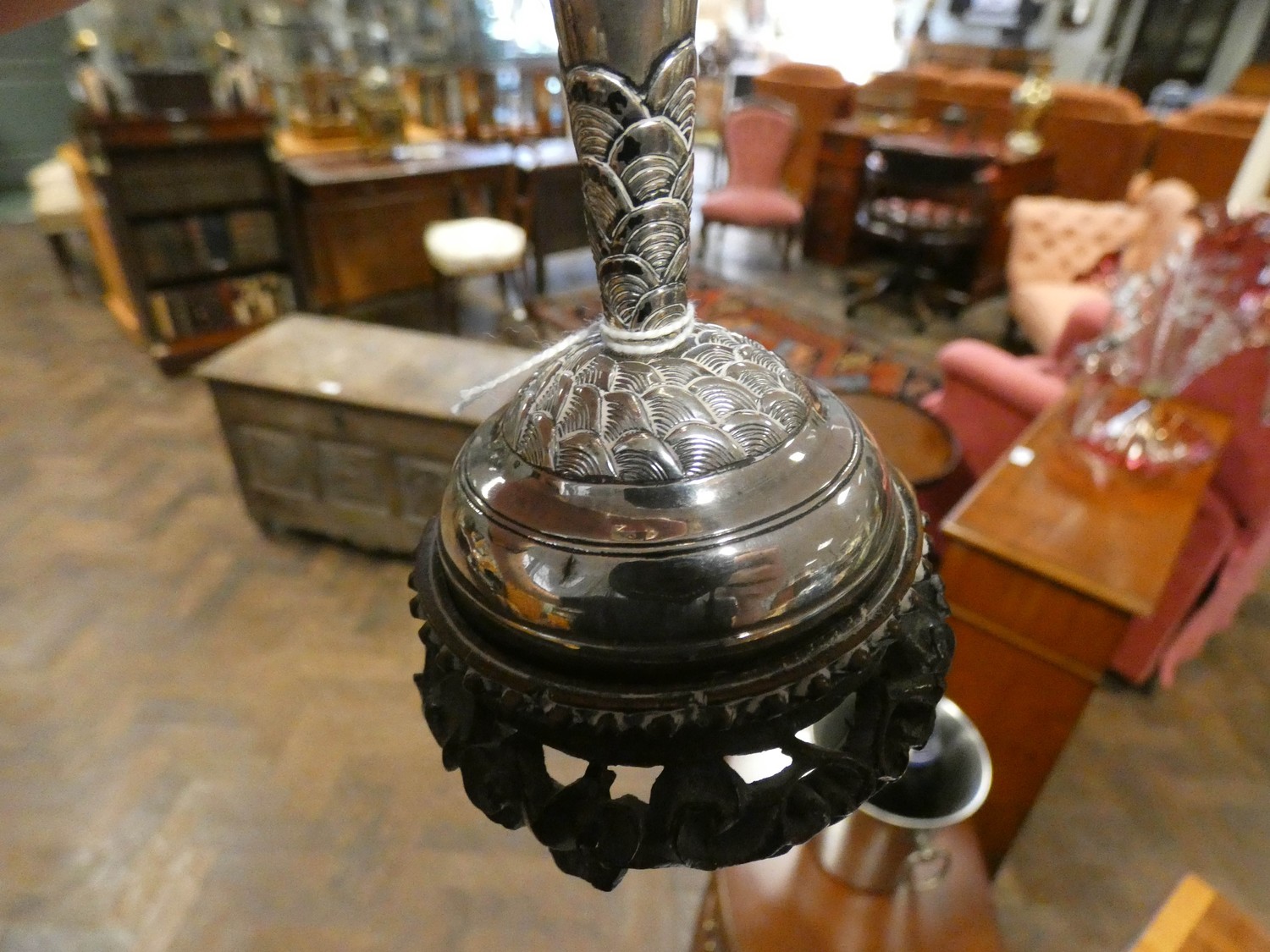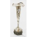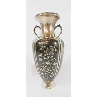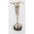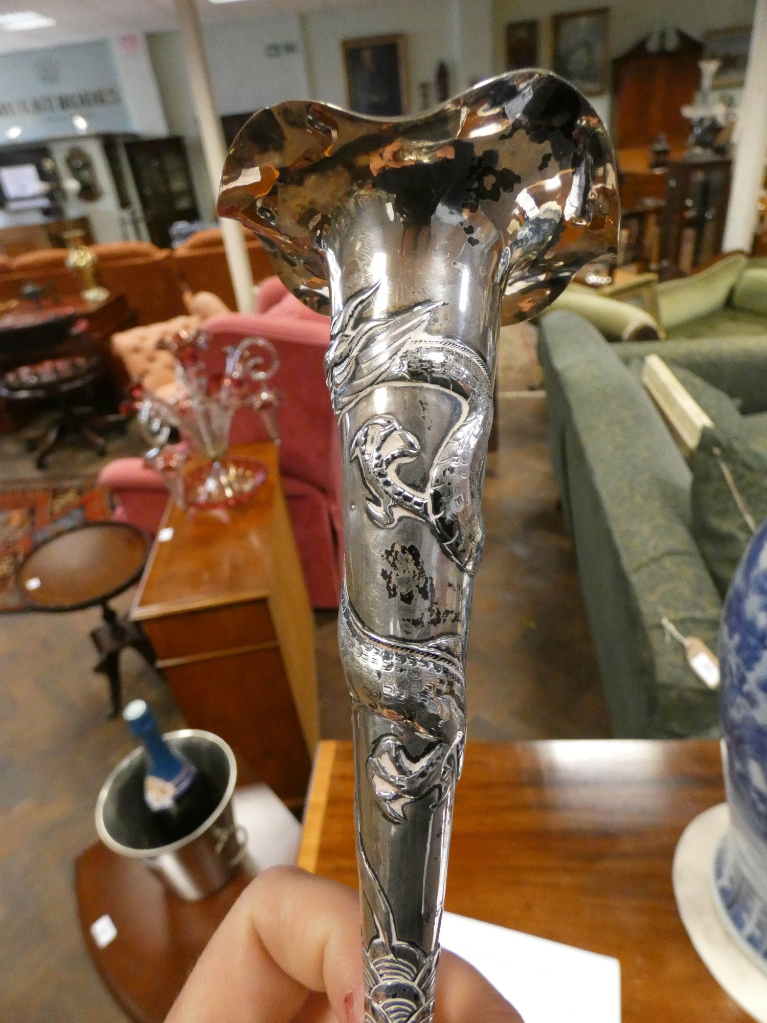 Chinese export silver vase, by Hung Chong & Co Shanghai, decorated with a coiled dragon, on carved hardwood base, overall height 20 cms tall.