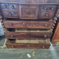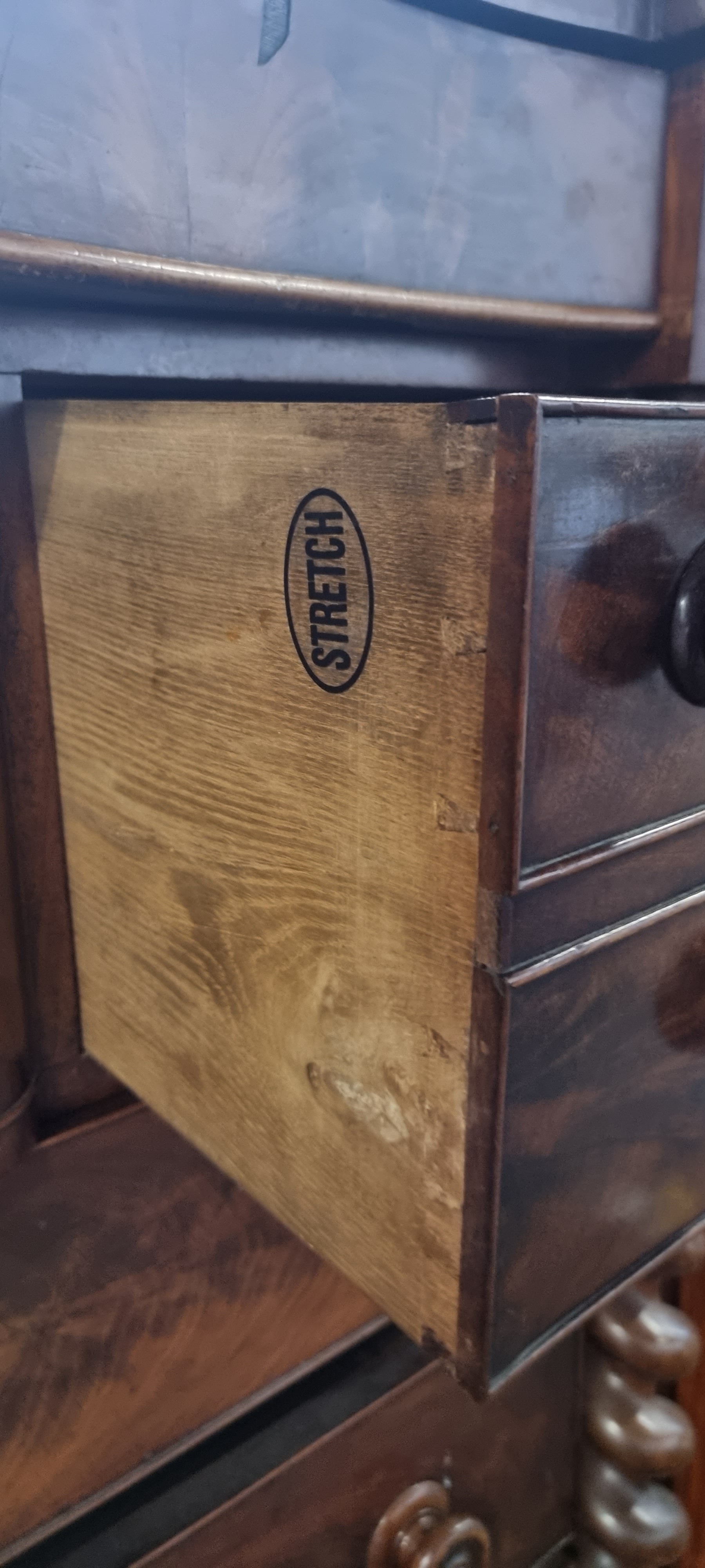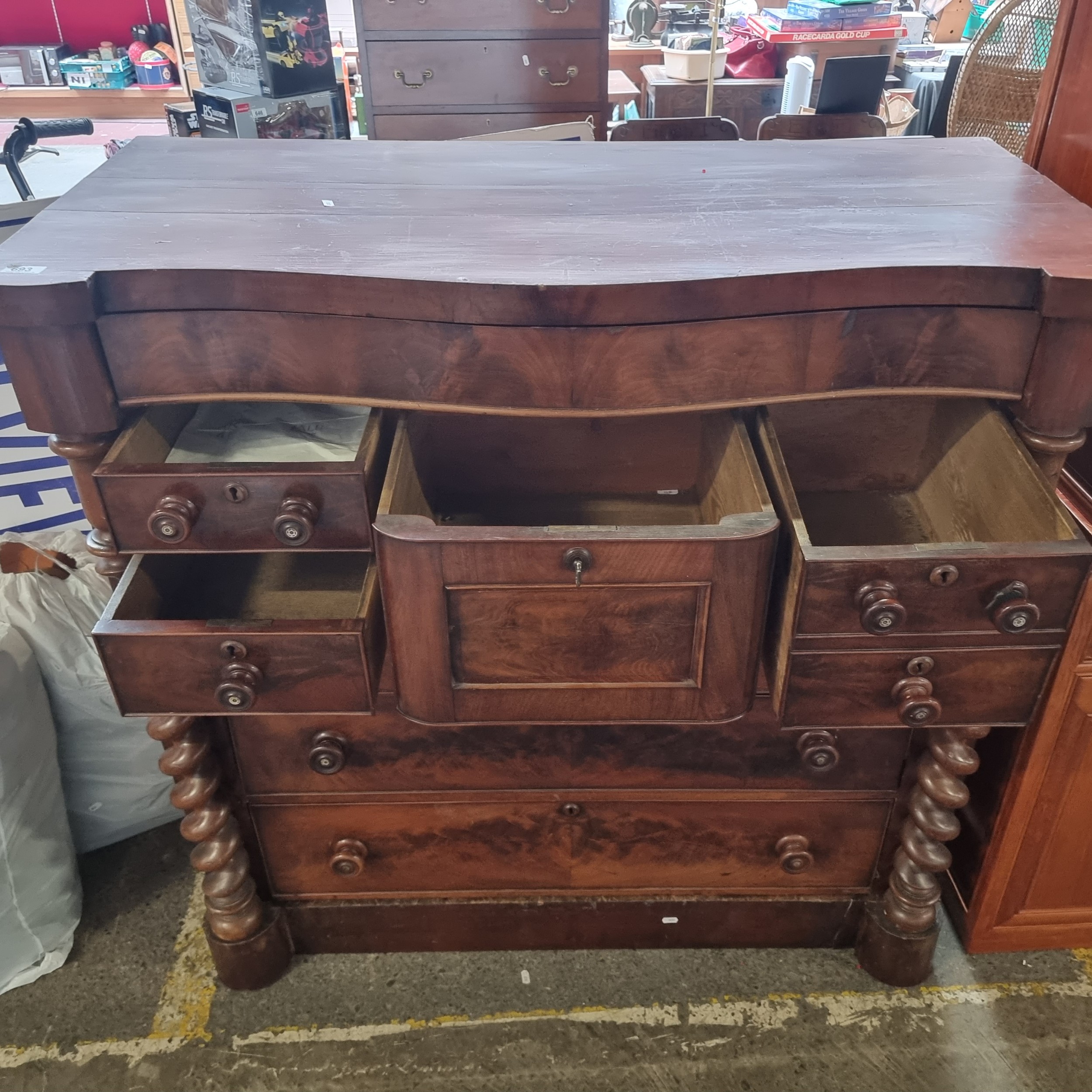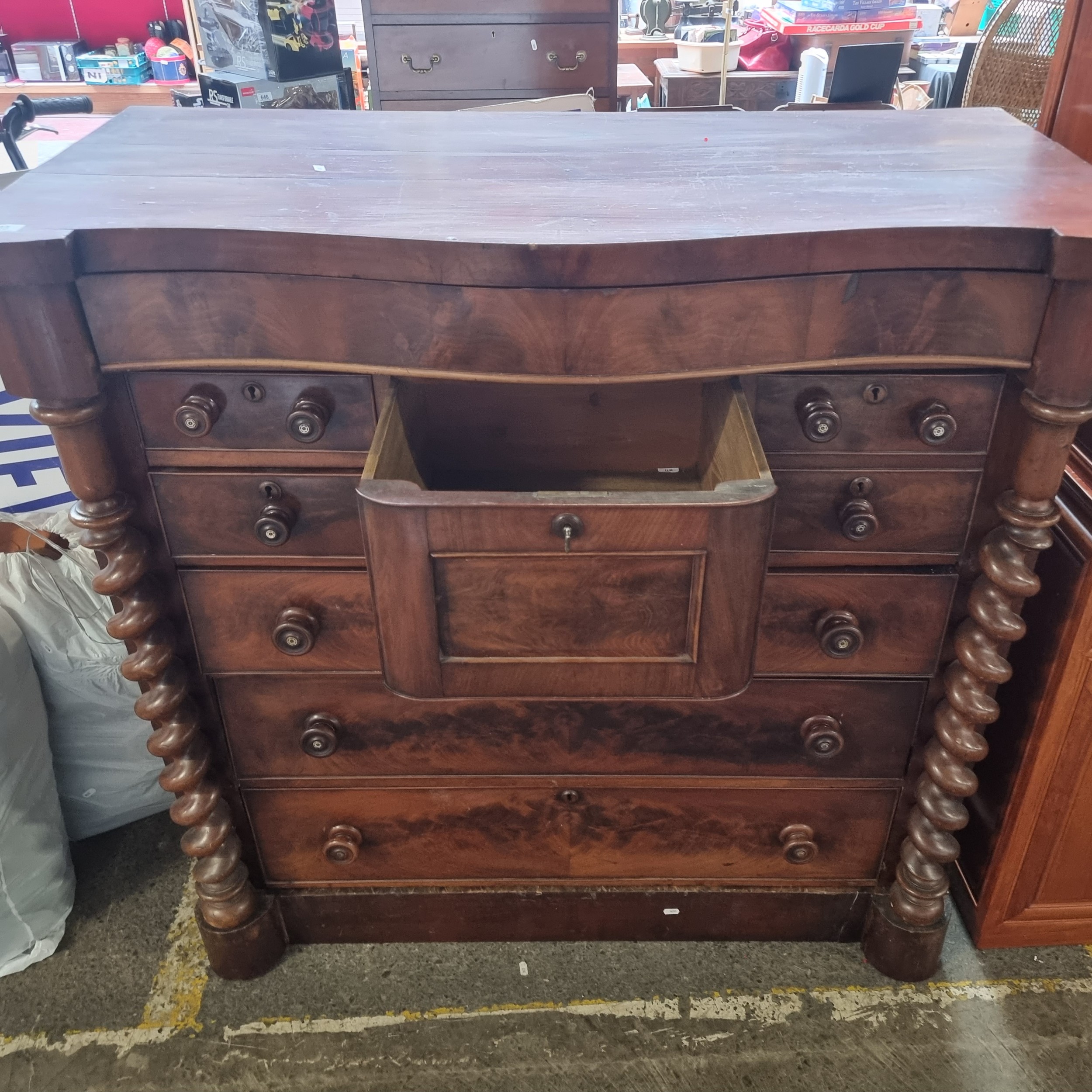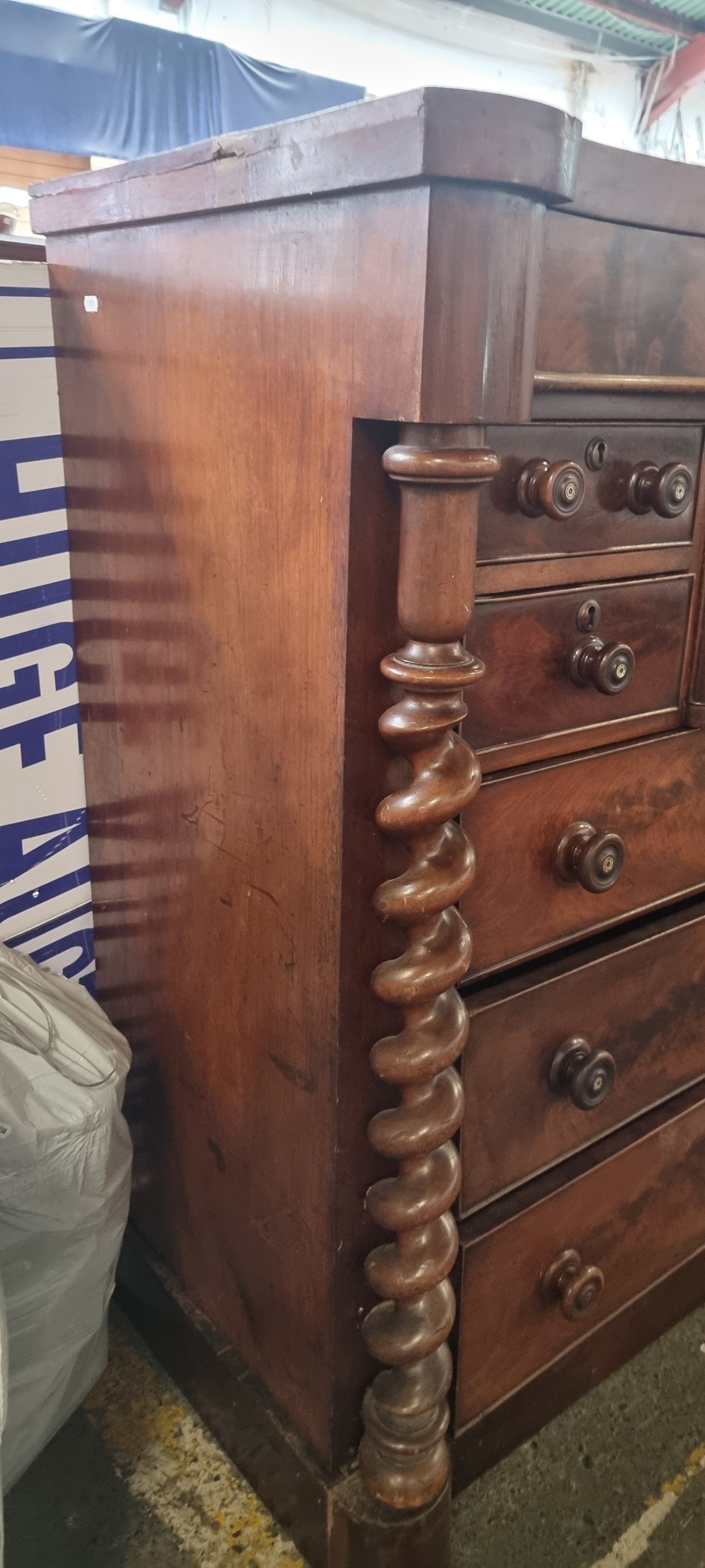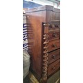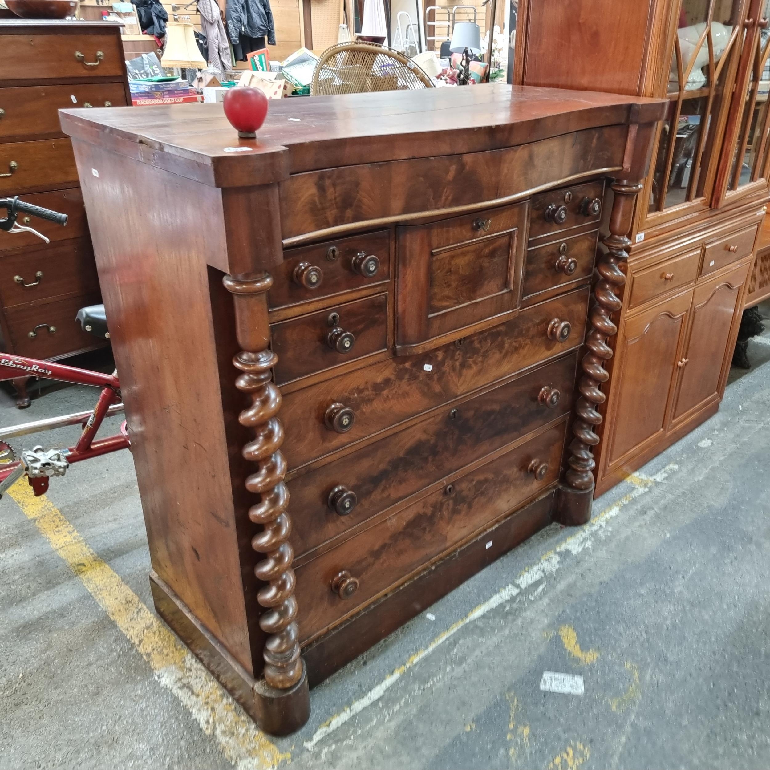 Star Lot : A magnificent large scotch chest of drawers with one drawer over four short and three long drawers with a Barley Twist support and centre deep drawer for top hat. H124cm x W123cm x D56cm.