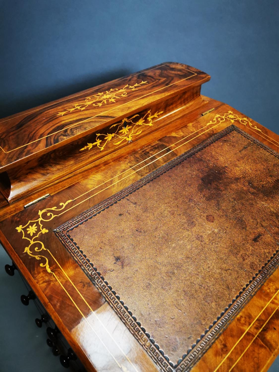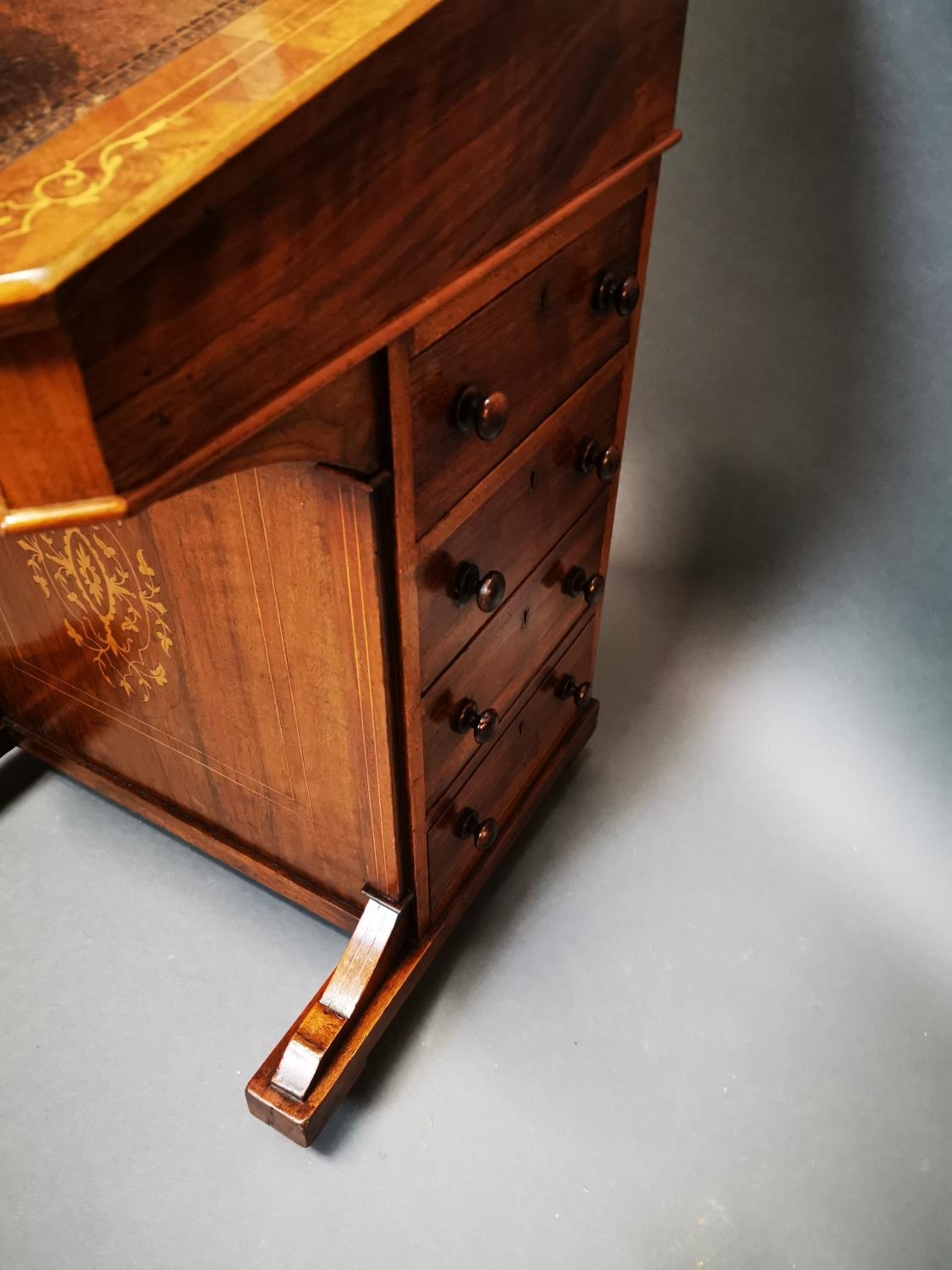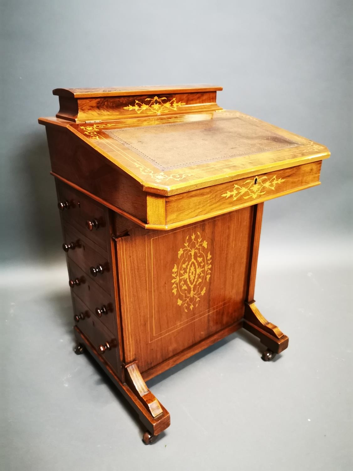 Good quality Victorian walnut inlaid Davenport with fitted interior and inset leather top {81 cm H x 55 cm W x 52 cm D}.