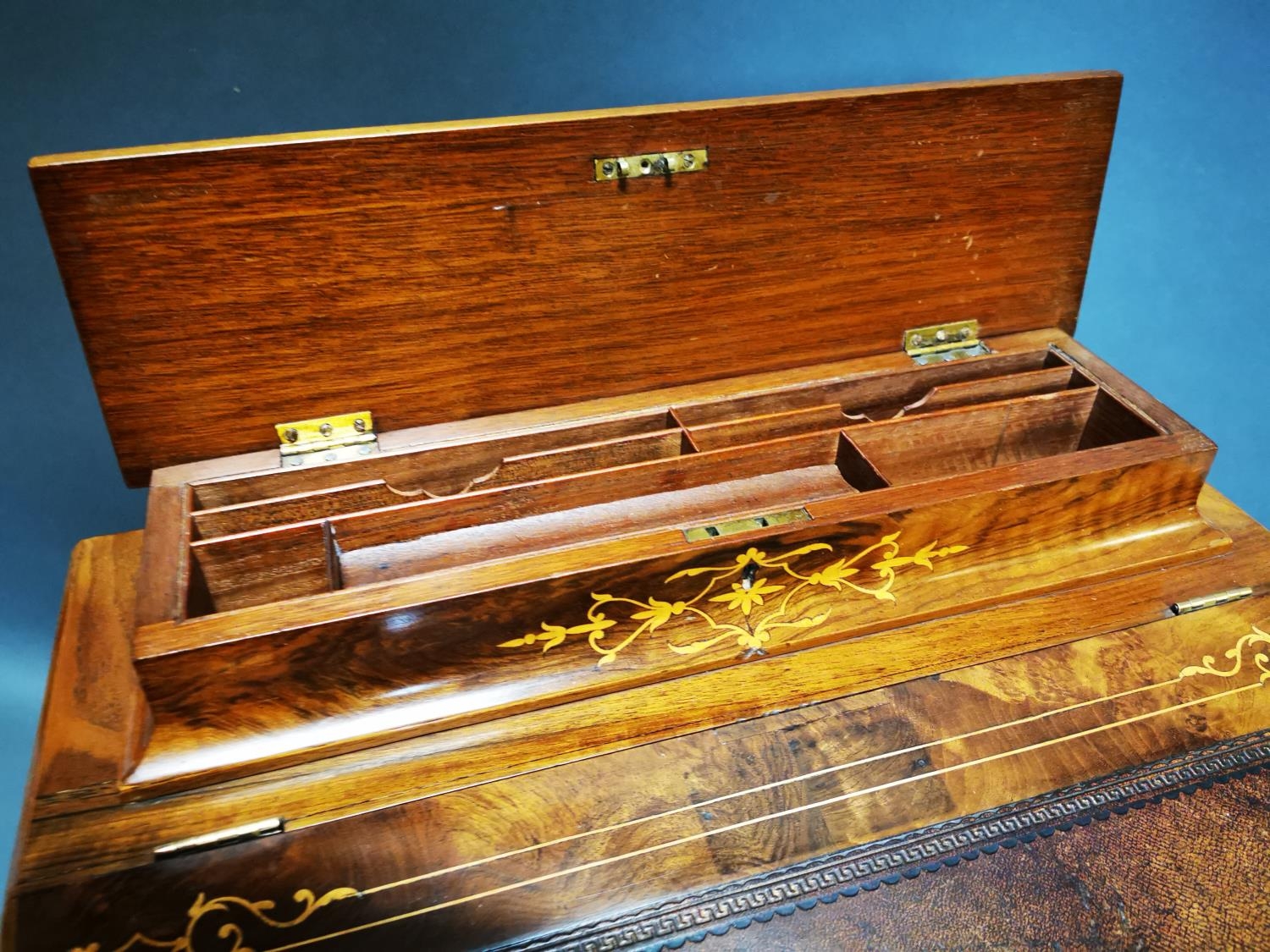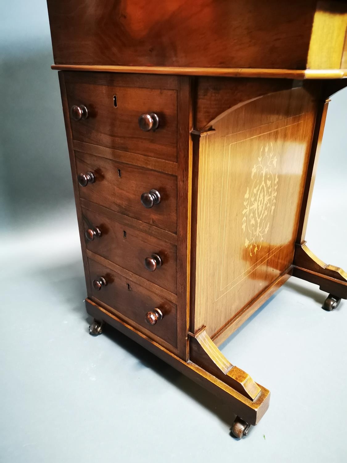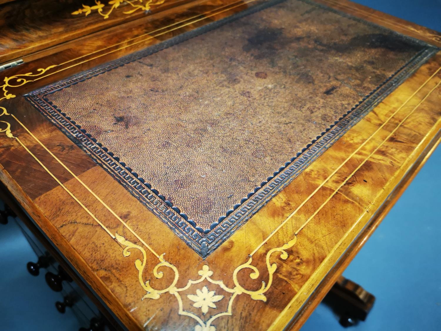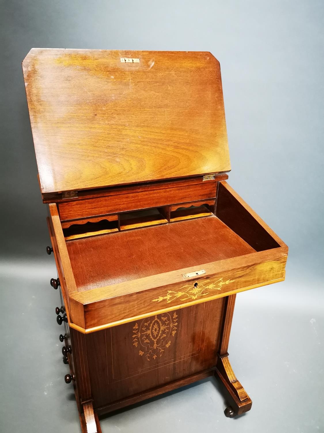 Good quality Victorian walnut inlaid Davenport with fitted interior and inset leather top {81 cm H x 55 cm W x 52 cm D}.