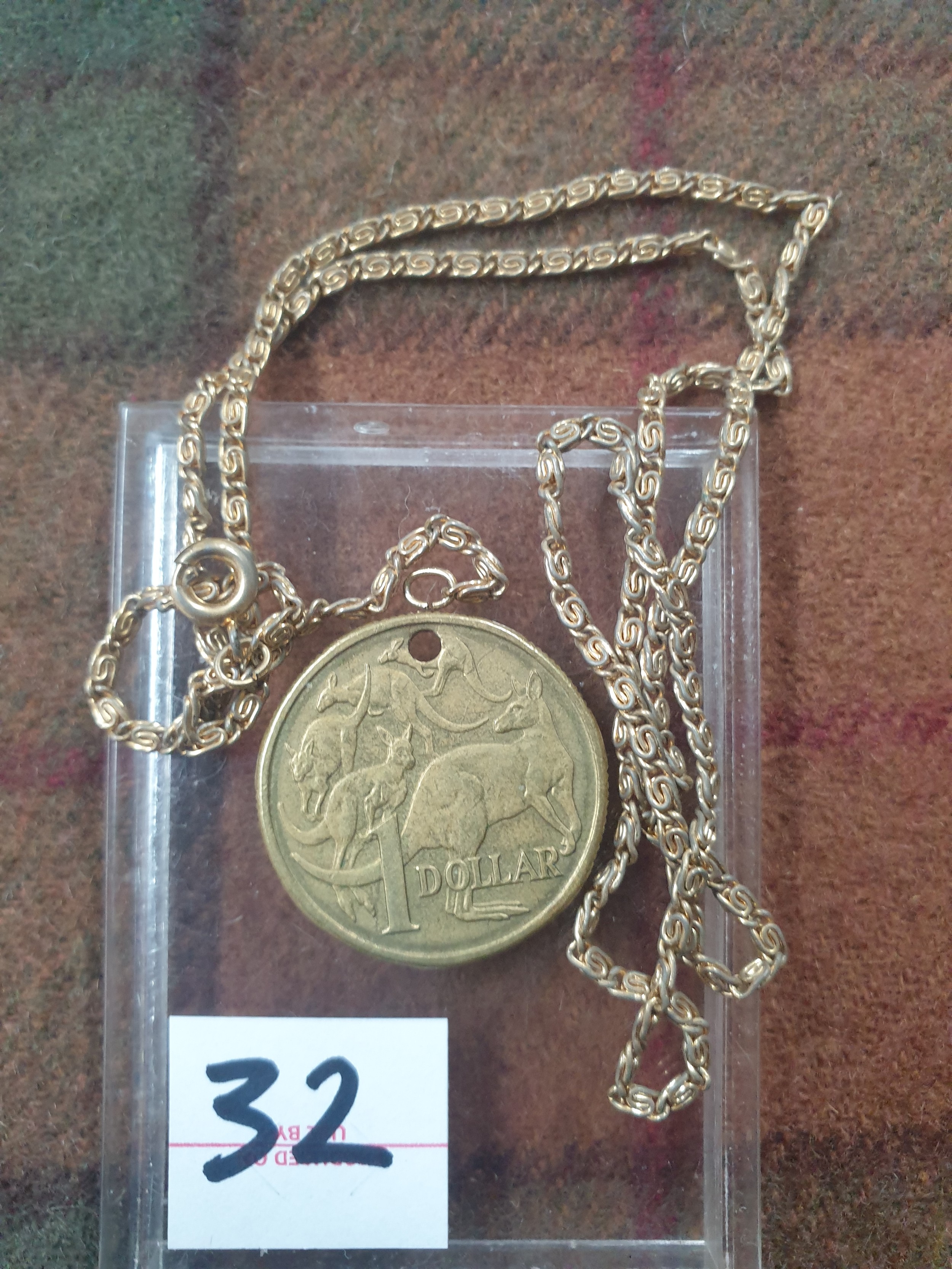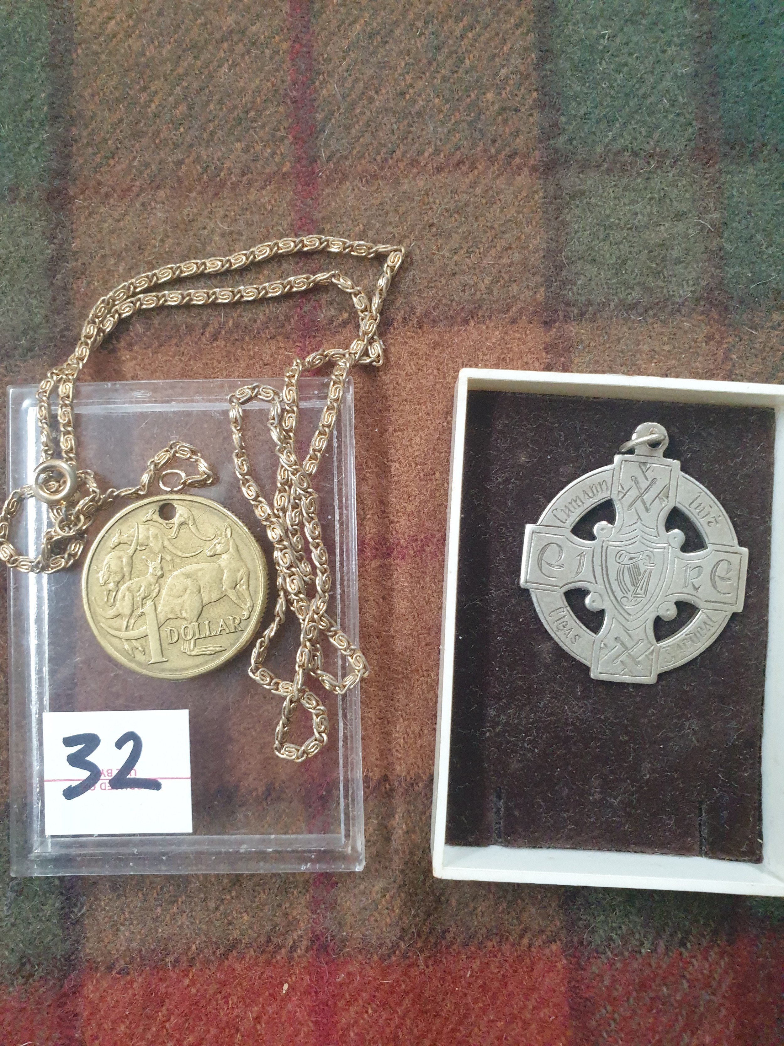 Silver Hallmarked Irish Celtic Fob And Australian 1985 1 Dollar Coin with Gold Plated Necklace