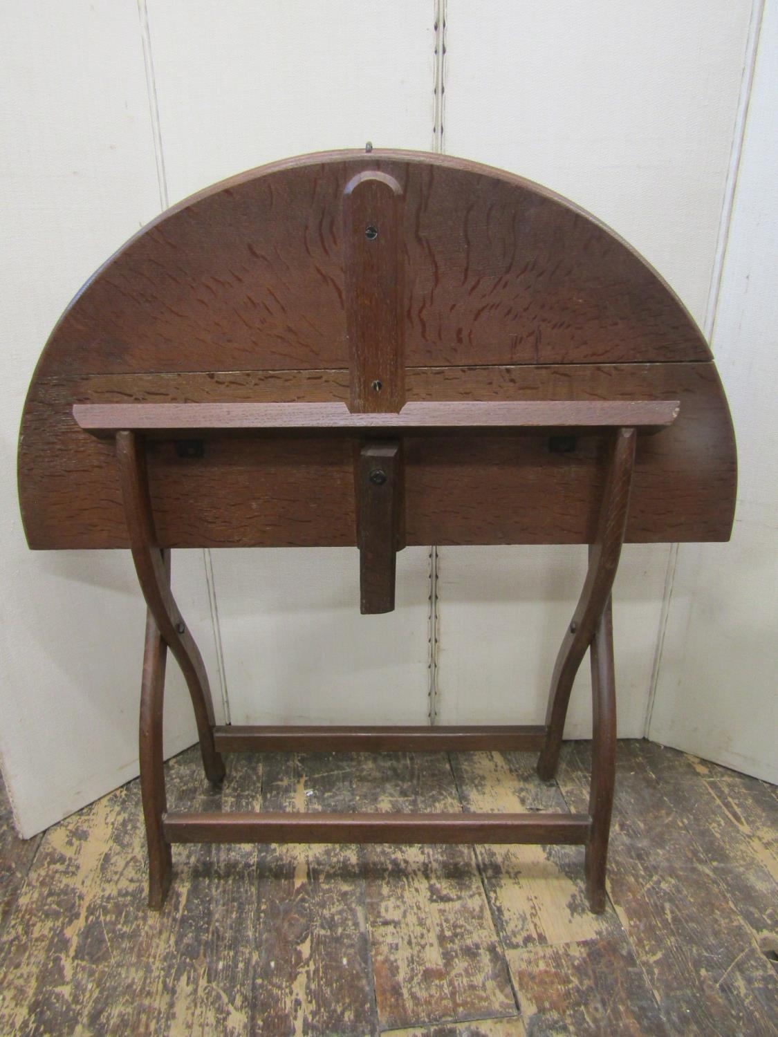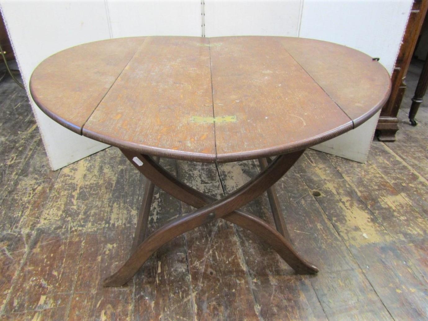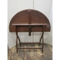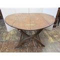 An oak coaching table in the manner of Heals, with circular folding top raised on a X shaped folding support, with ironwork fittings, 90cm diameter