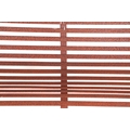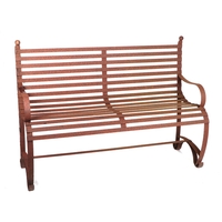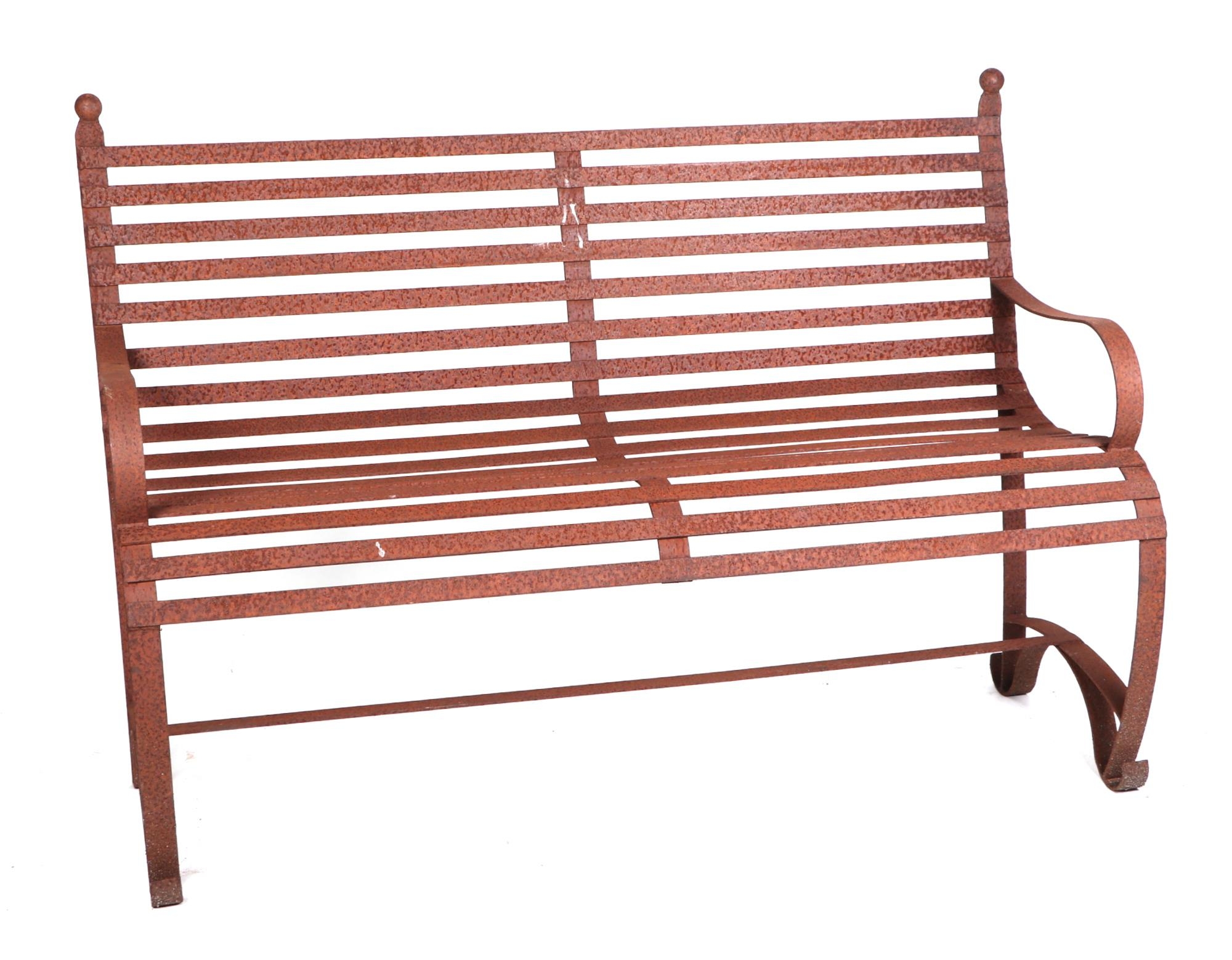 A iron strap work garden bench, with scroll arms and feet, and ball finials, 140cm high.