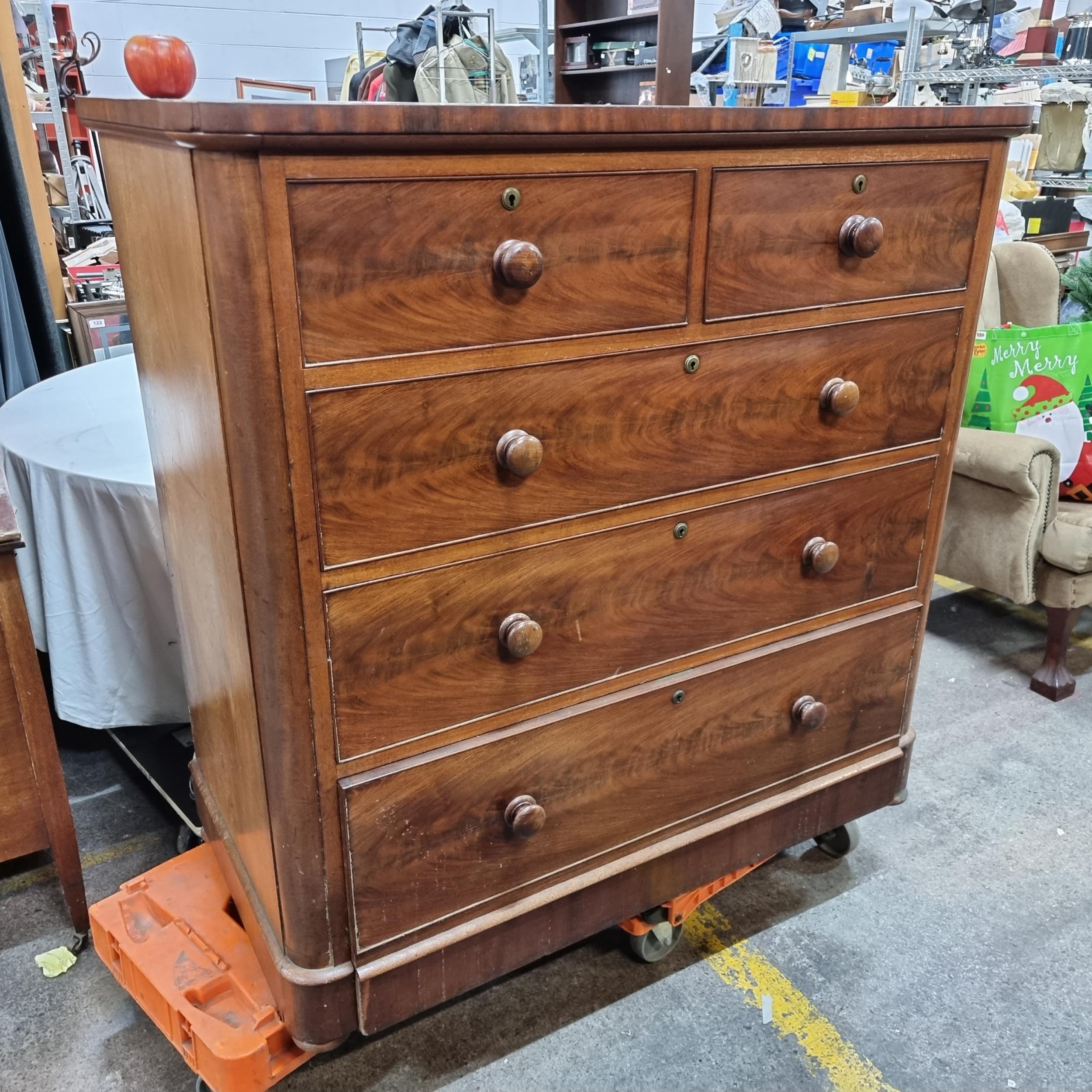 A large Edwardian tiger mahogany chest of drawers. The substantial drawers graduate in size and have round wooden handles. Great looking Antique chest.