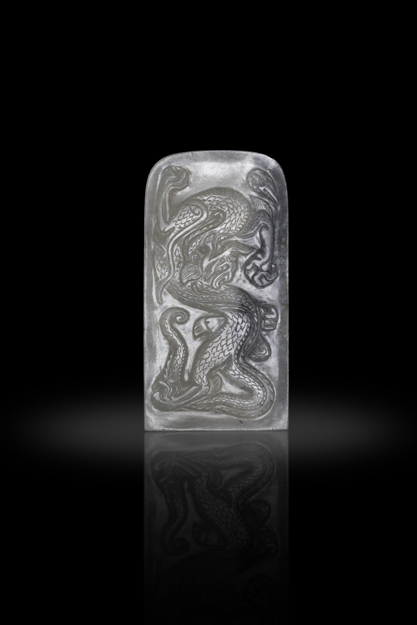 A BLACK AND WHITE JADE PANEL WITH DRAGON ?? ?????? China, Ming dynasty Size. 10.2x5.1cm