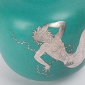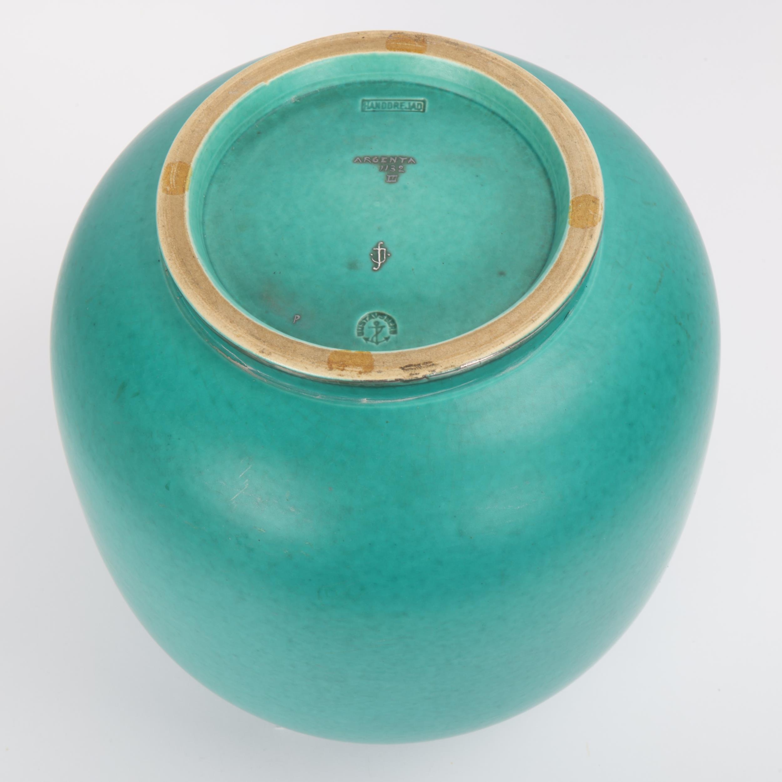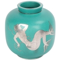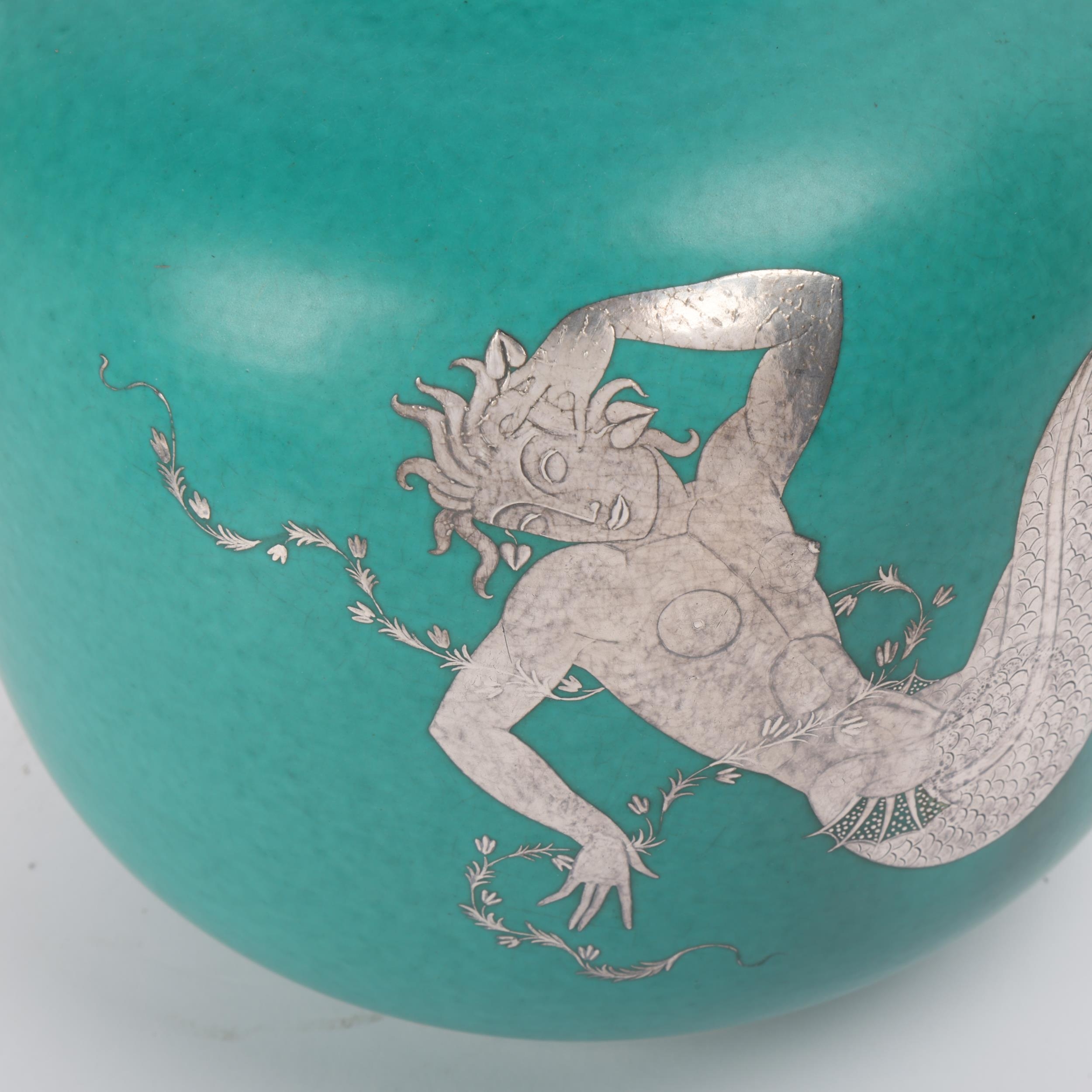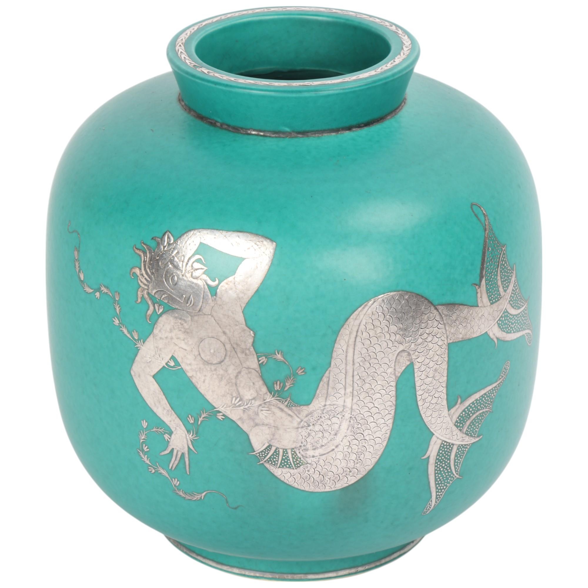 Wilhelm Kage for Gustavsberg, Sweden, a ceramic Argenta vase, decorated in silver alloy with a large two tailed mermaid entwined with a garland of flowers, with large elaborate tail fins. Hand turned and monogramed, stamped on base "HANDDREJAD" and marked model number 1132 size III. Date letter p for 1946 production, height 22cm