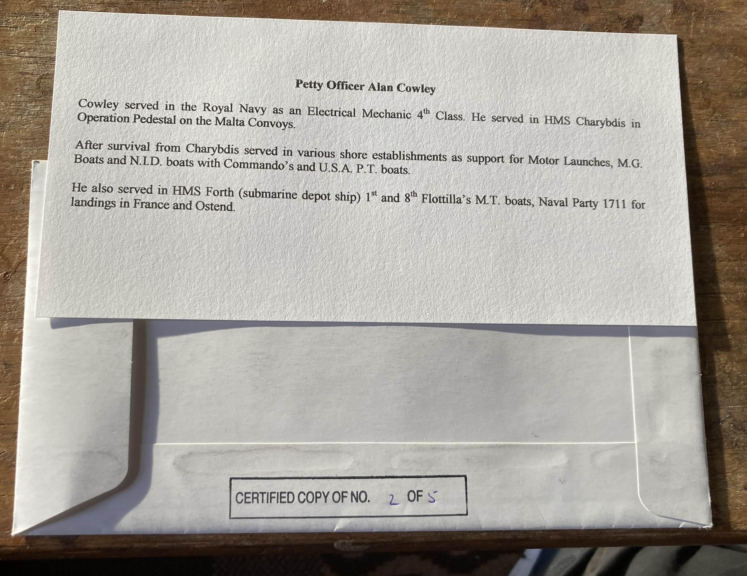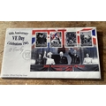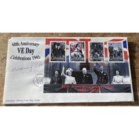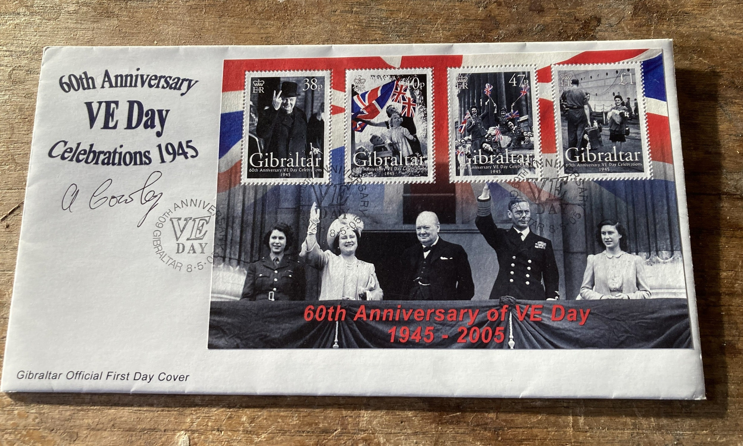 Malta Convoys veteran signed cover. WW2 Navy 50th Ann VE Day Celebrations 1945 cover picturing Churchill with the Royal Family with full Gibraltar WW2 stamp set signed by PO Alan Cowley, HMS Charybdis, scarce numbered 2 if 5 issued. Single Vendor collection. Good condition. We combine postage on multiple winning lots and can ship worldwide. UK postage from £5.99, EU from £7.99, Rest of World from £9.99.