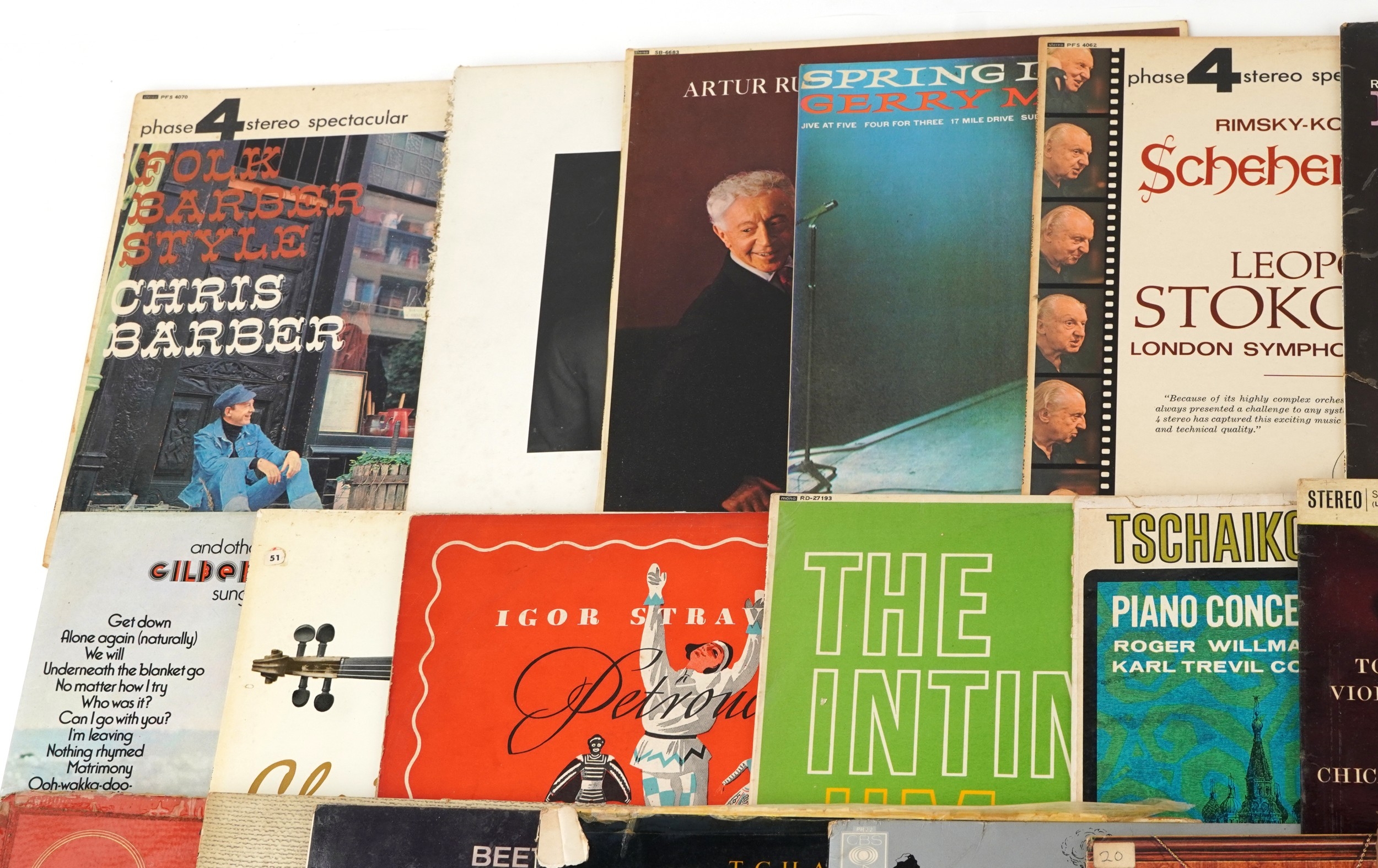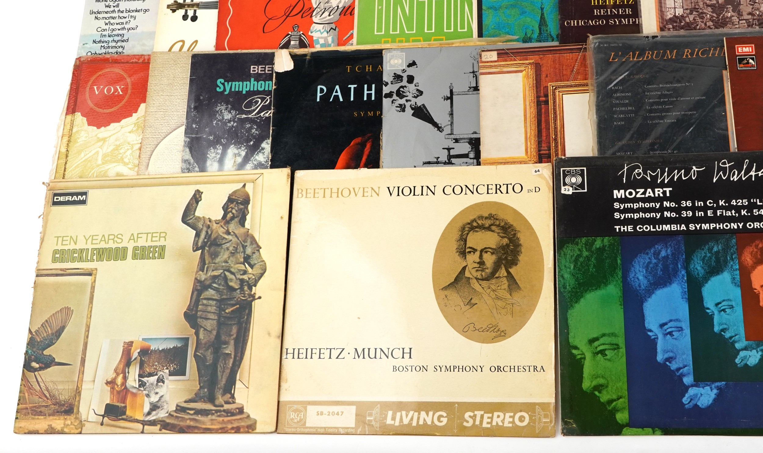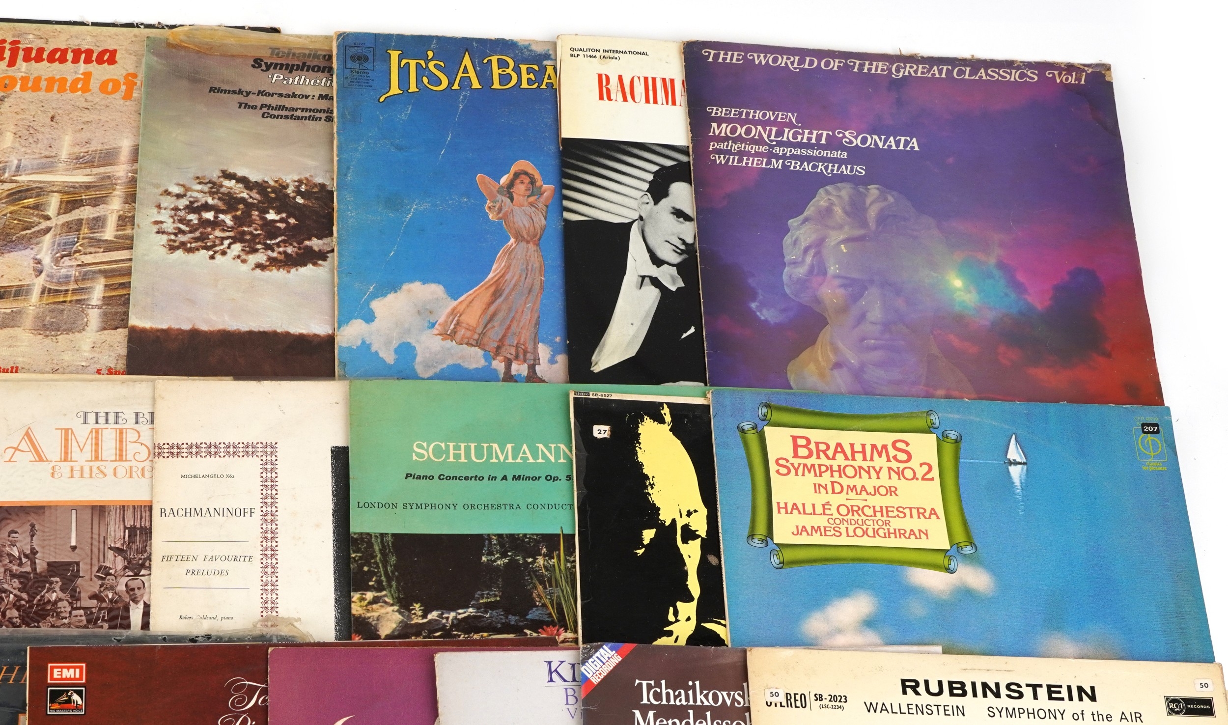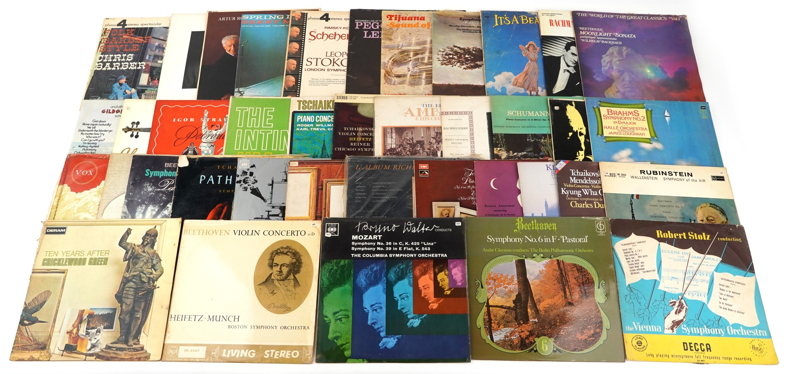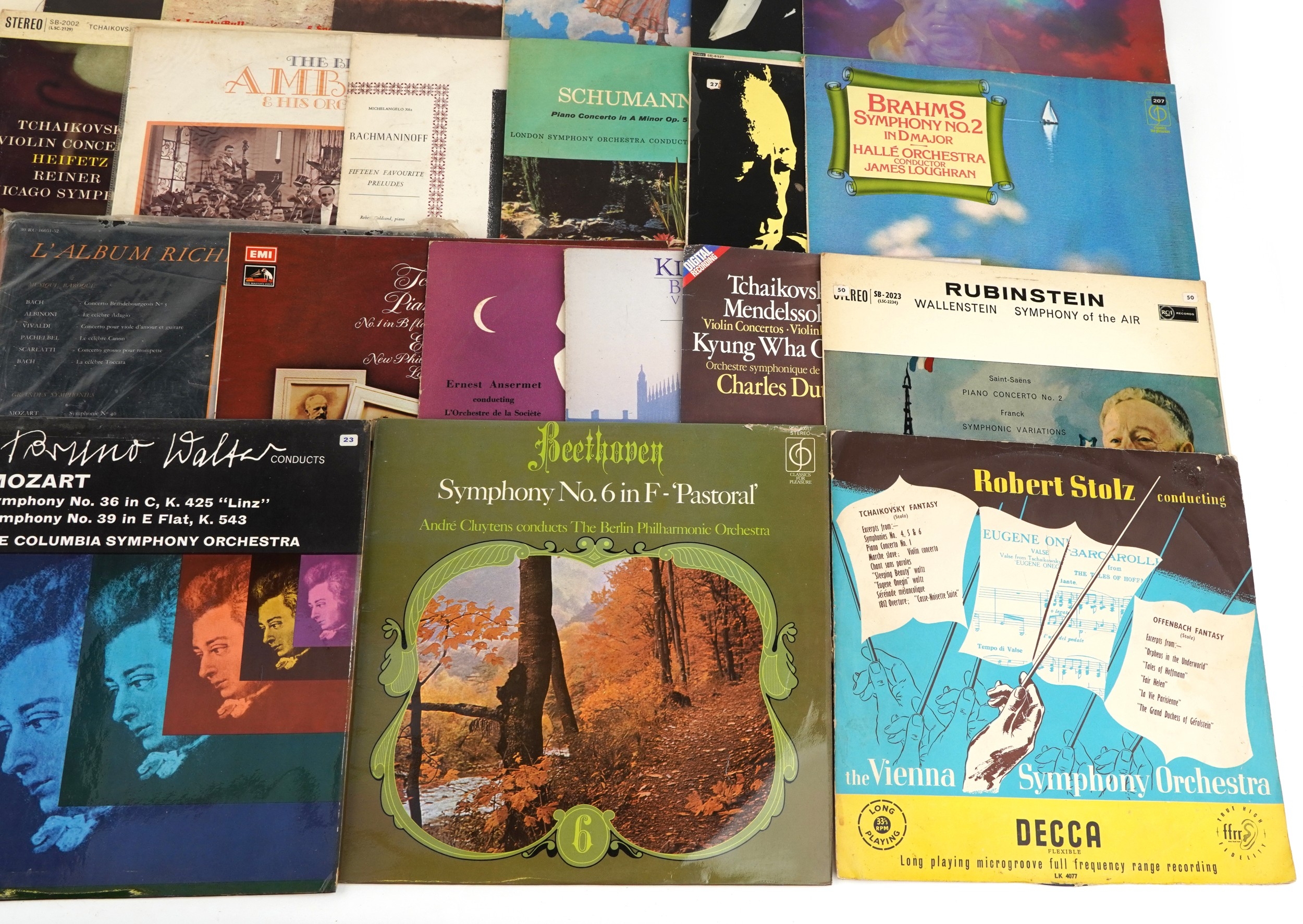 A collection of classical vinyl LP records including Brahms Symphony No. 2 in D Major by The Hallé Orchestra, Tchaikovsky's Violin Concerto by The Chicago Symphony and Beethoven's Choral Fantasy in C Minor.