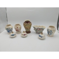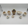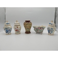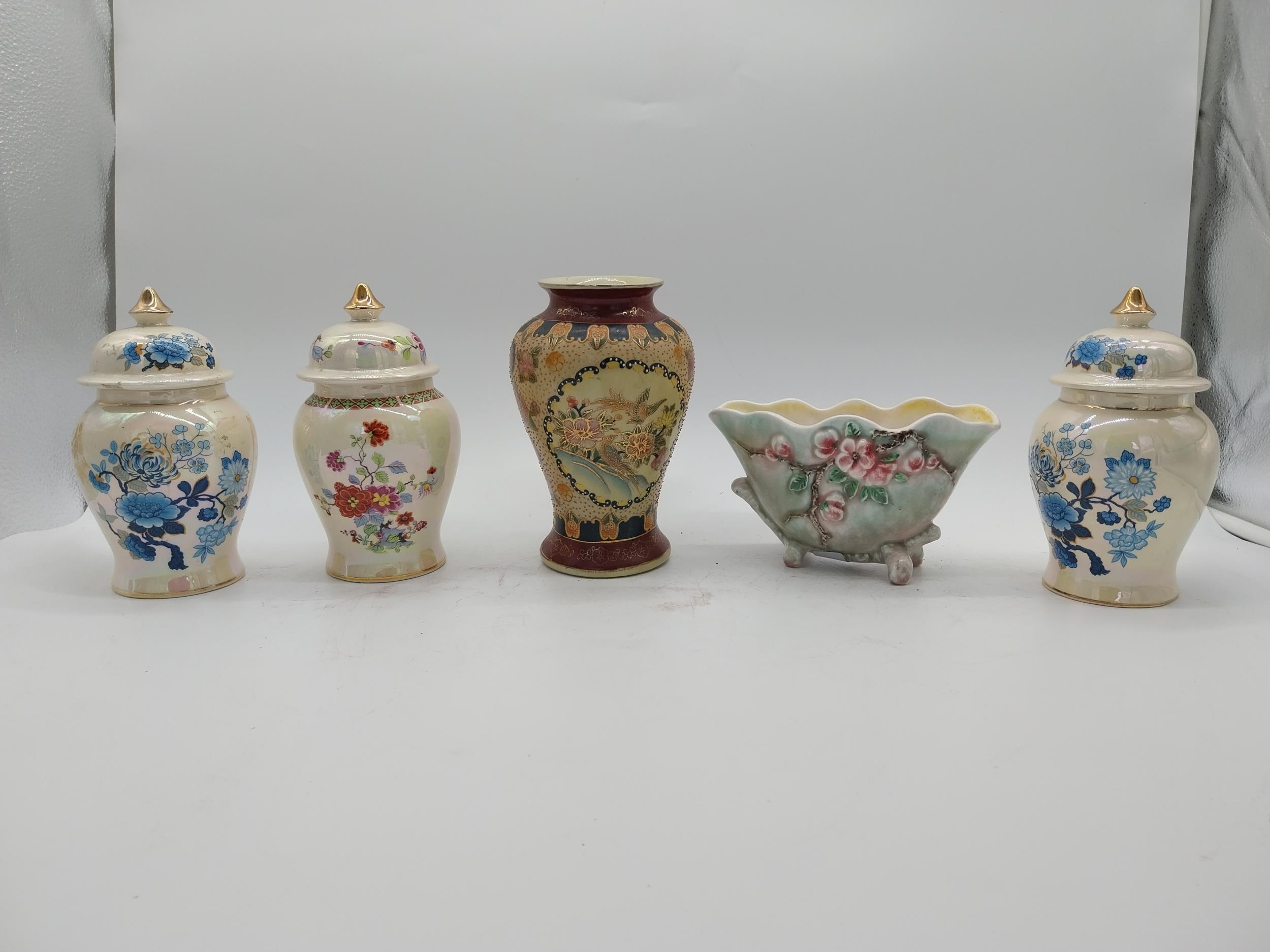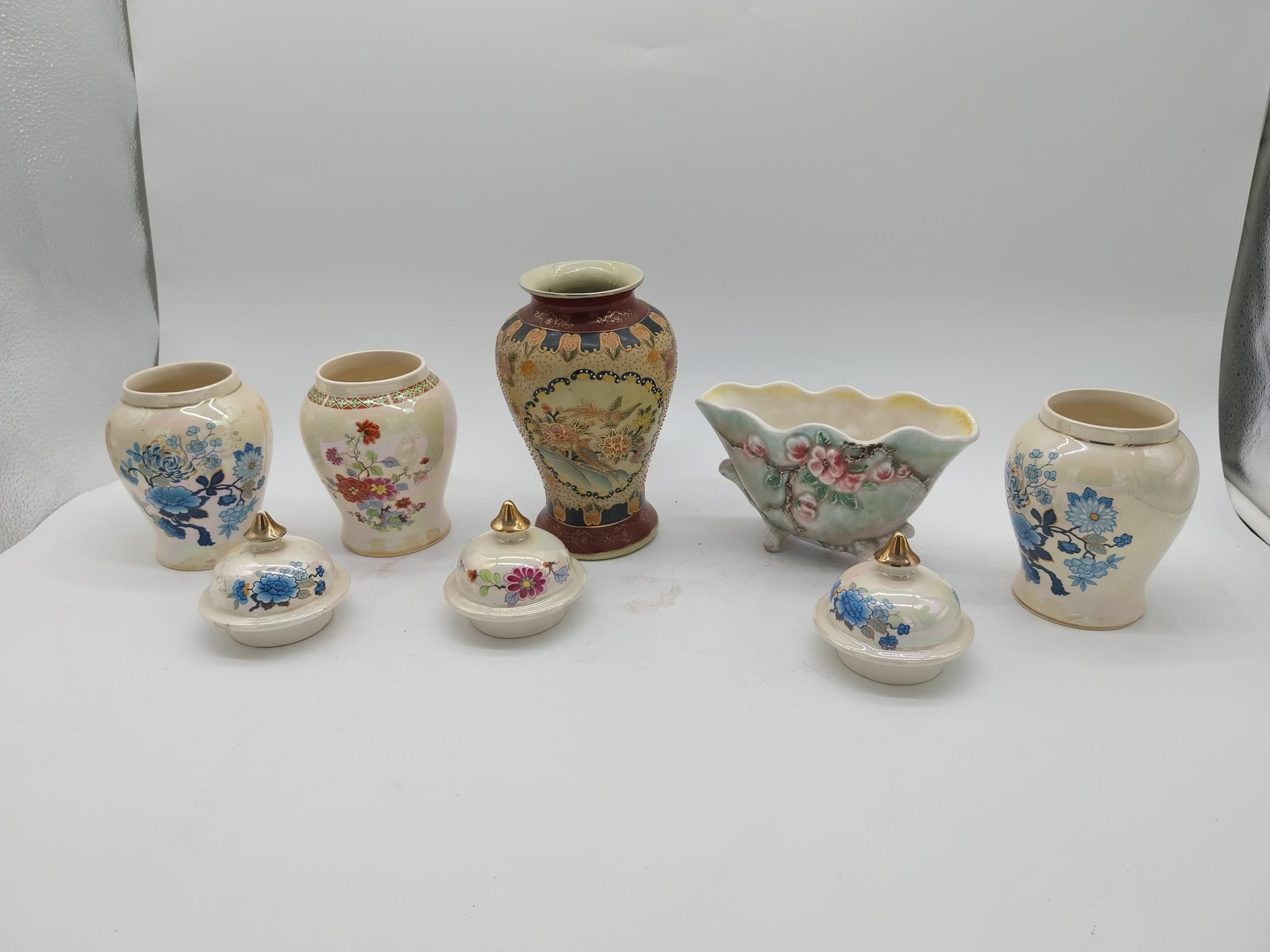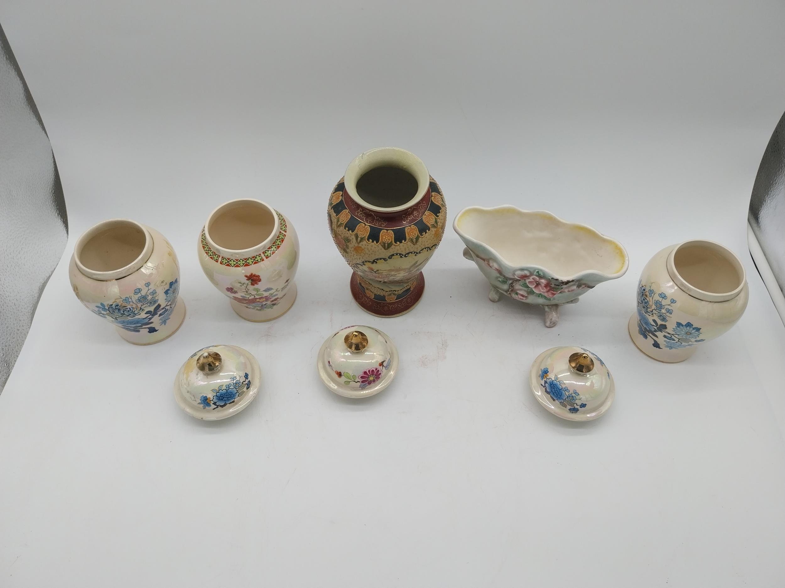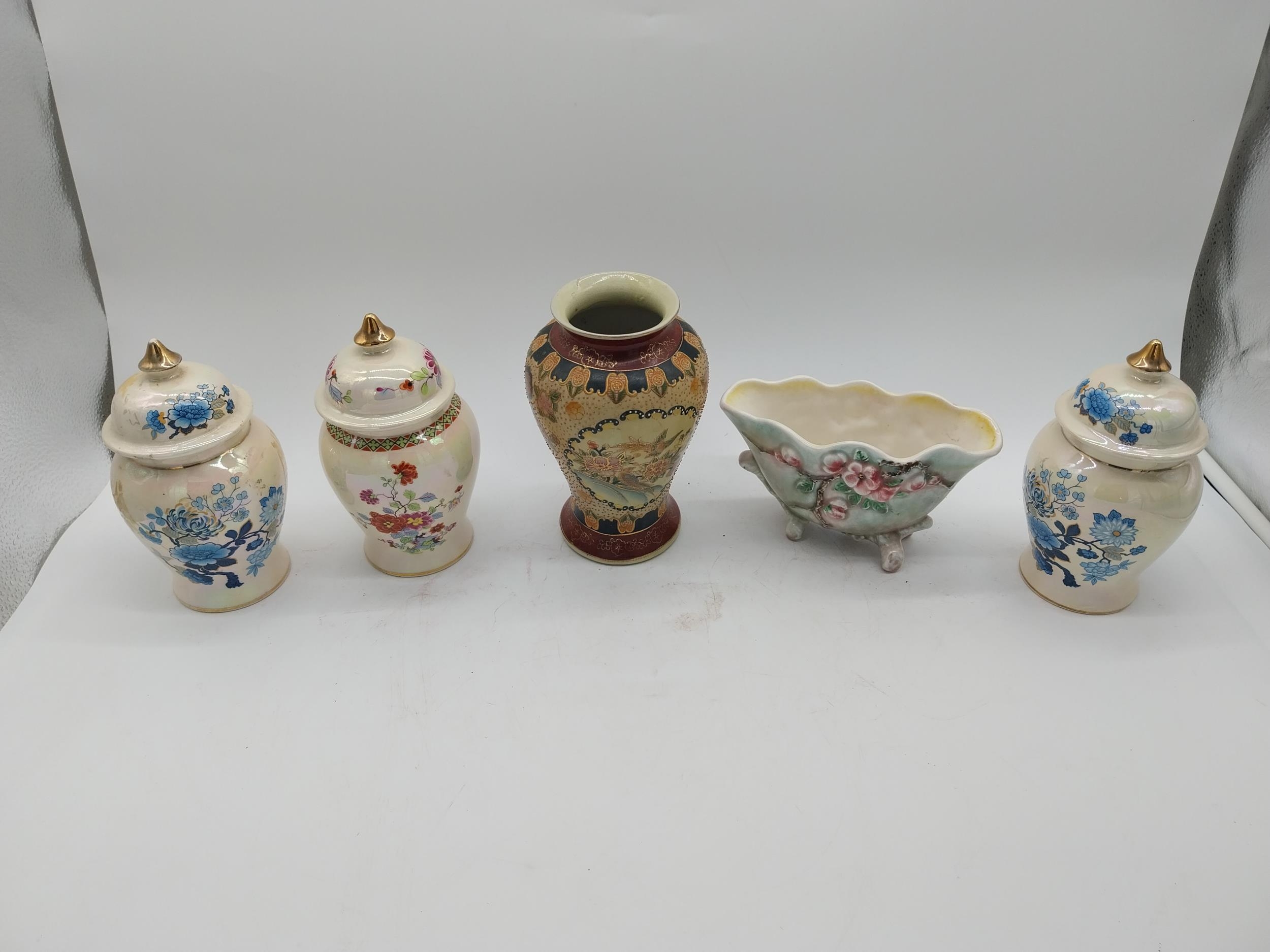 Three decorative hand painted ceramic lidded urns, one ceramic vase and one ceramic bowl.