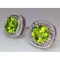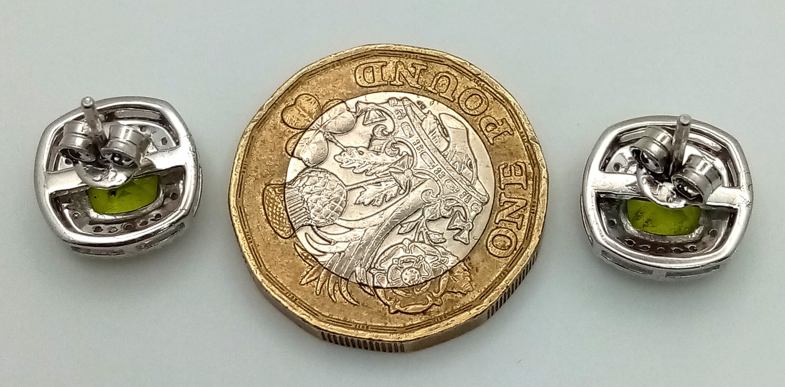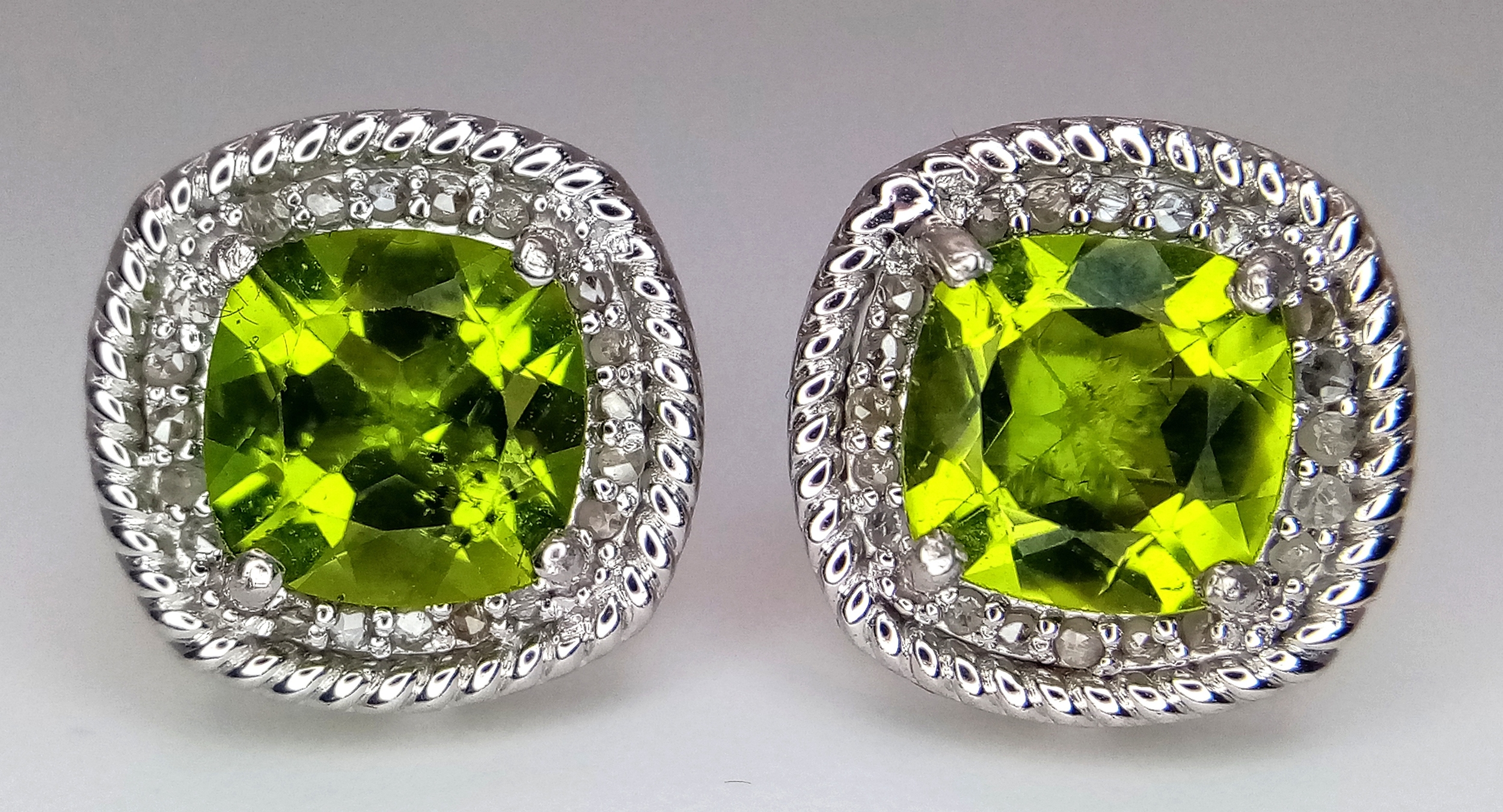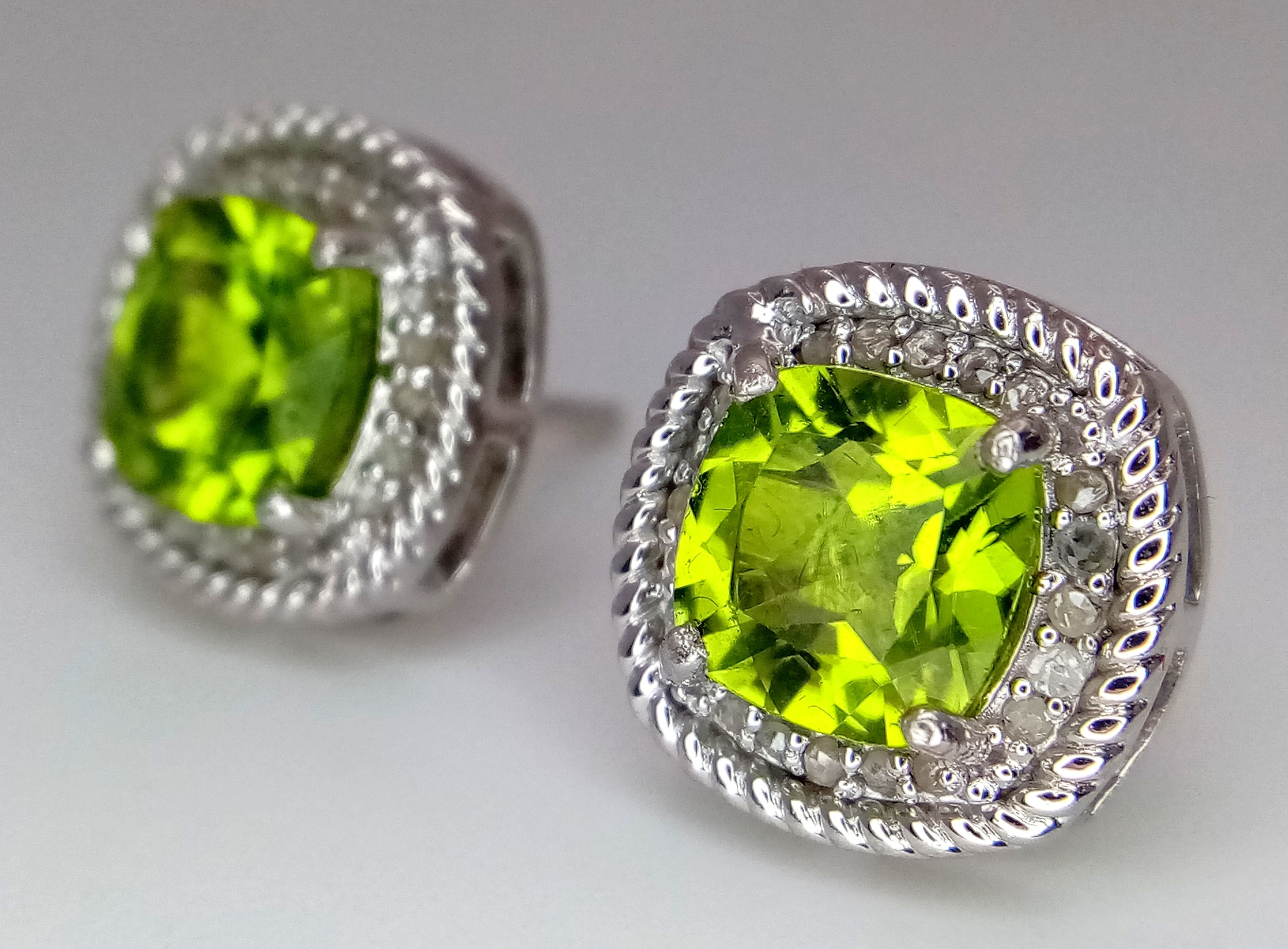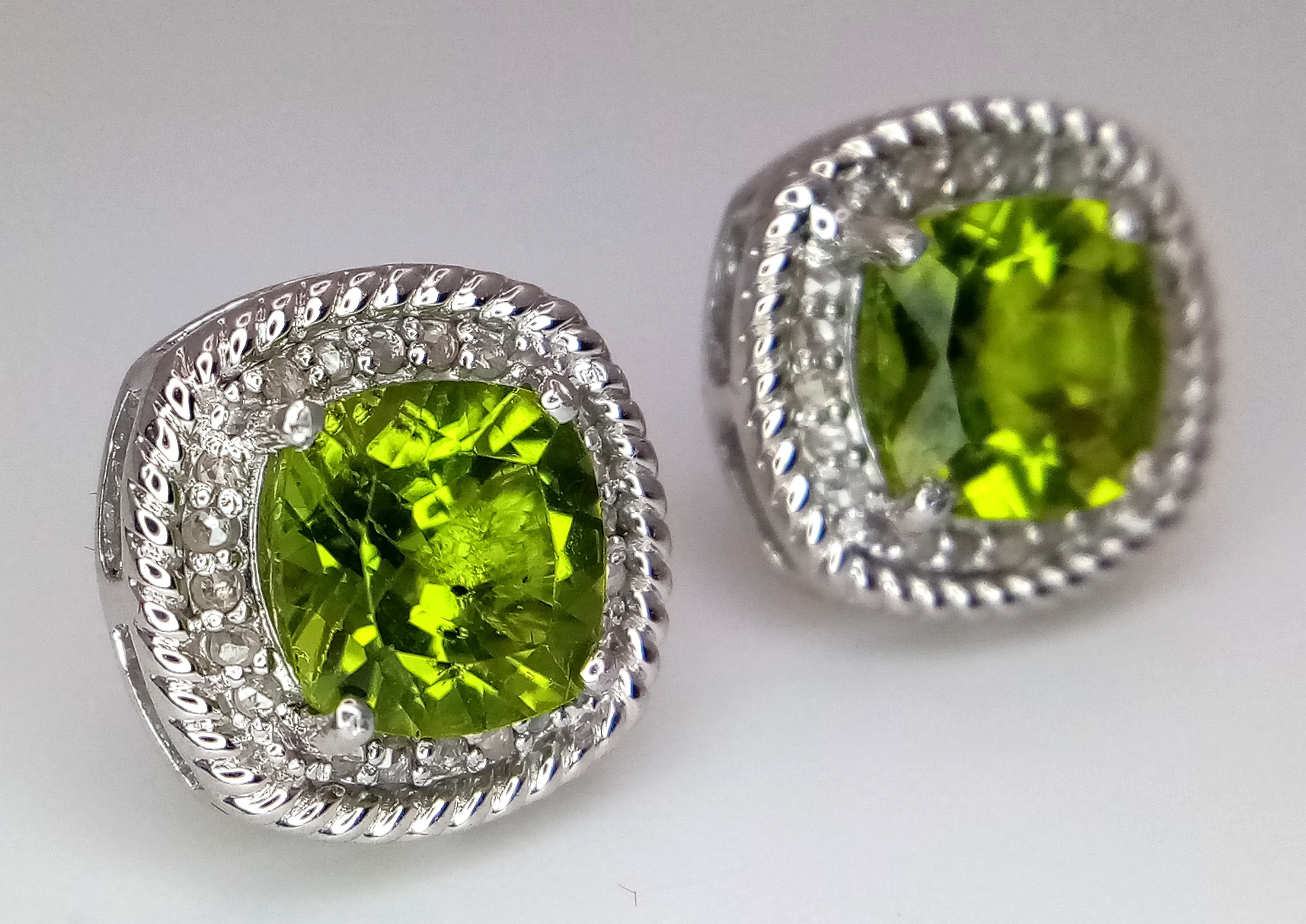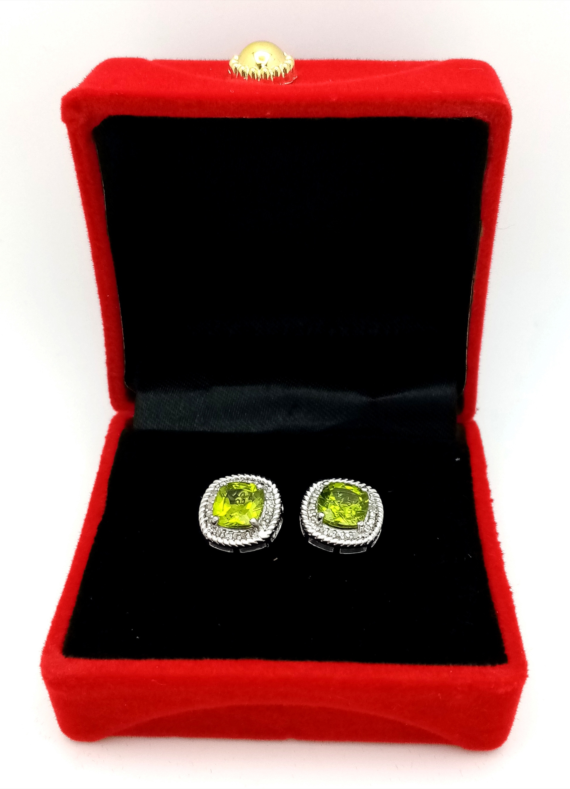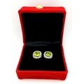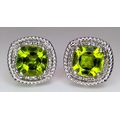 A Pair of Peridot Gemstone Stud Earrings with Diamond Accents. Set in 925 Silver. Comes with a case. CD-1954.
