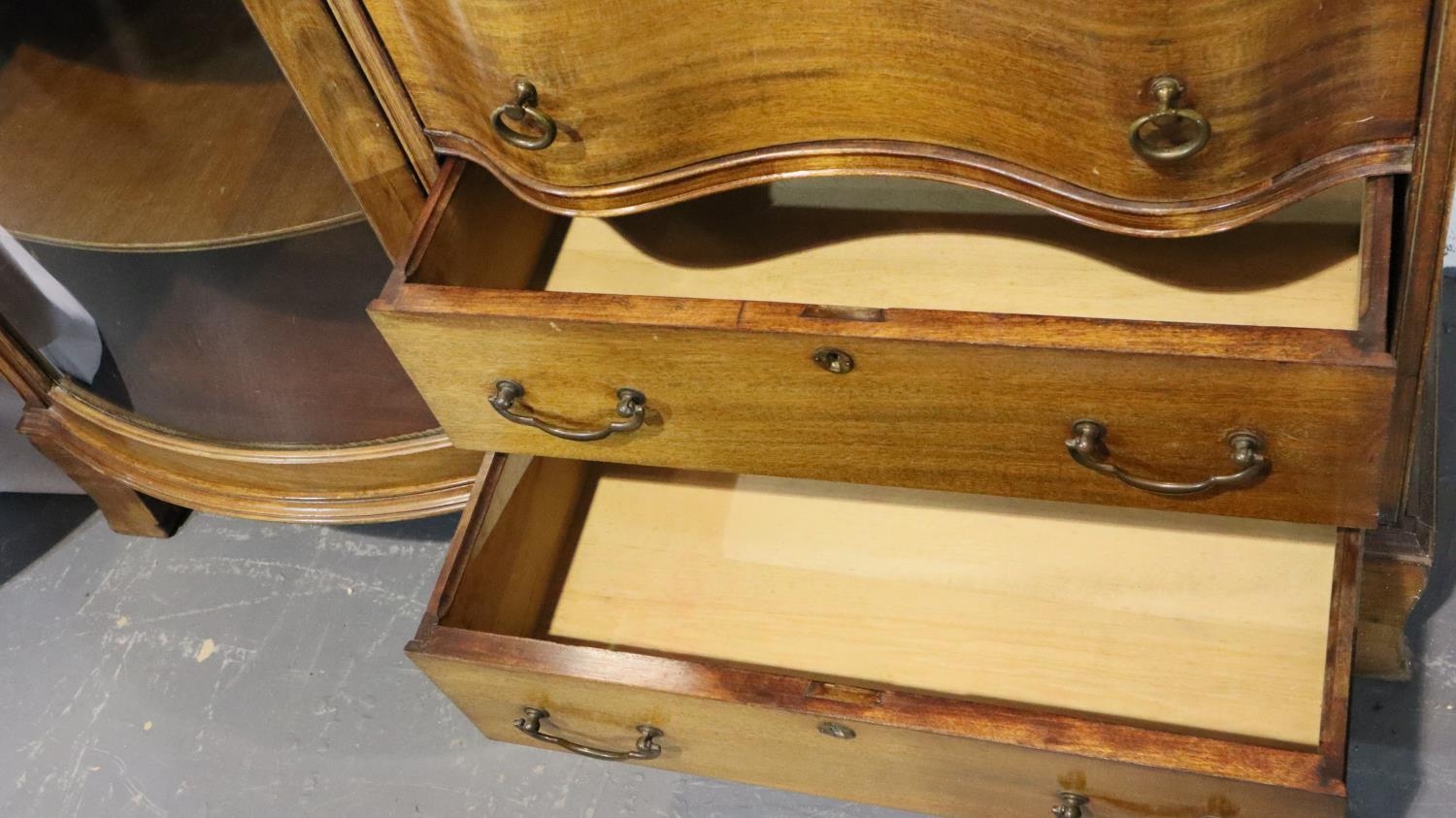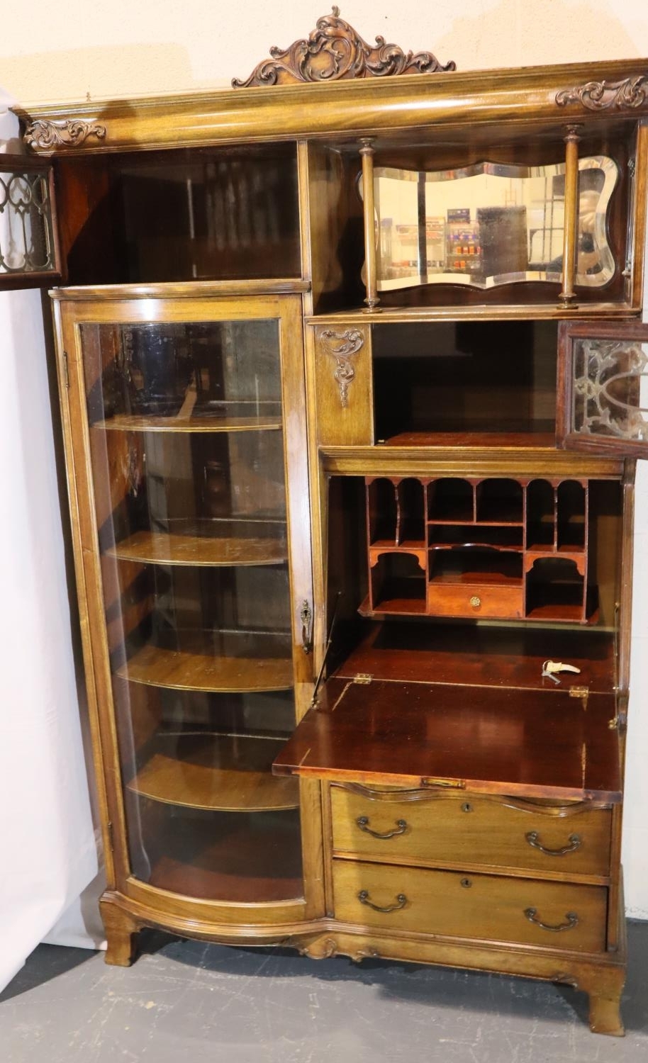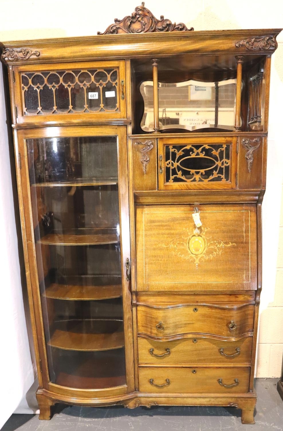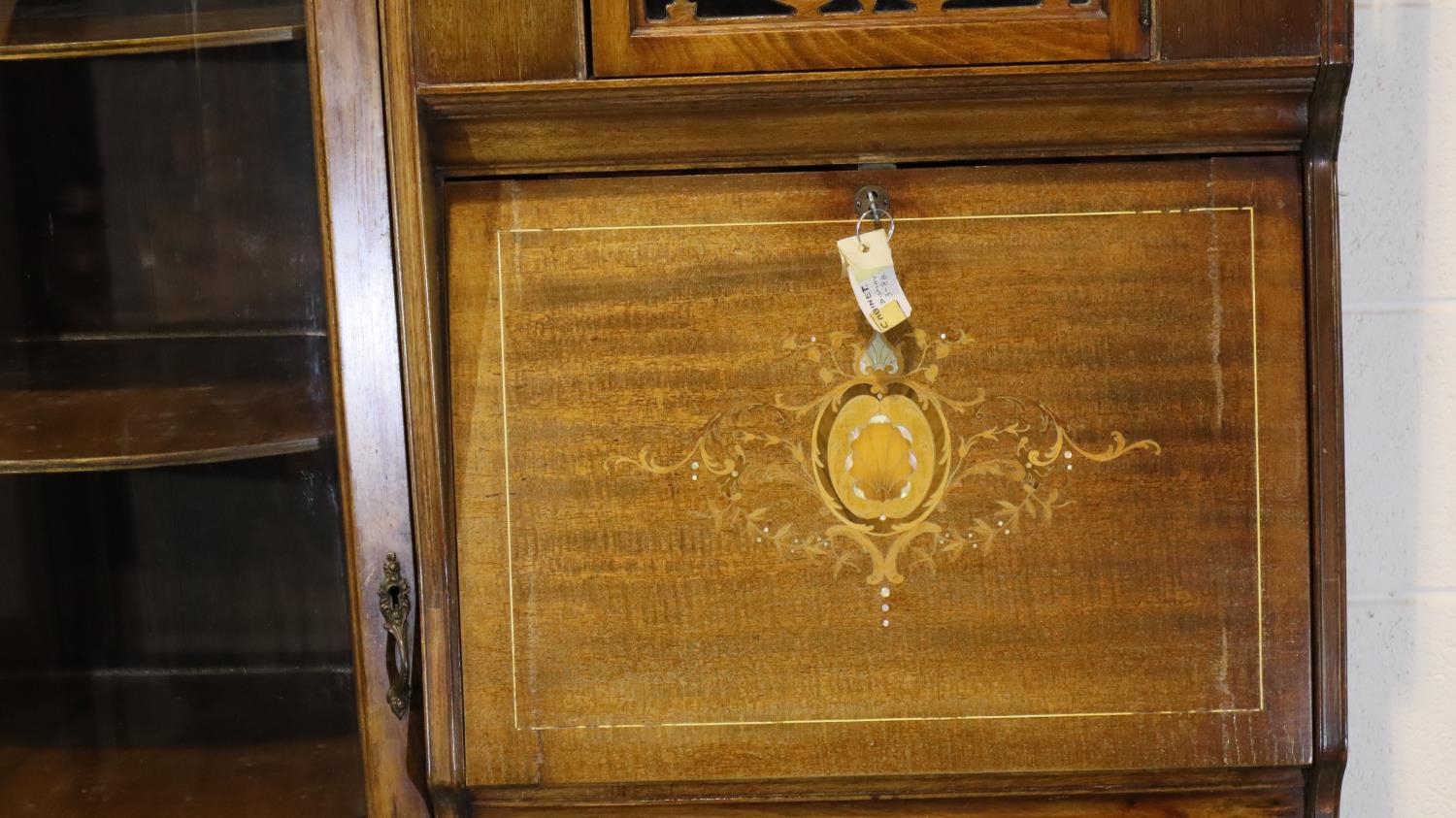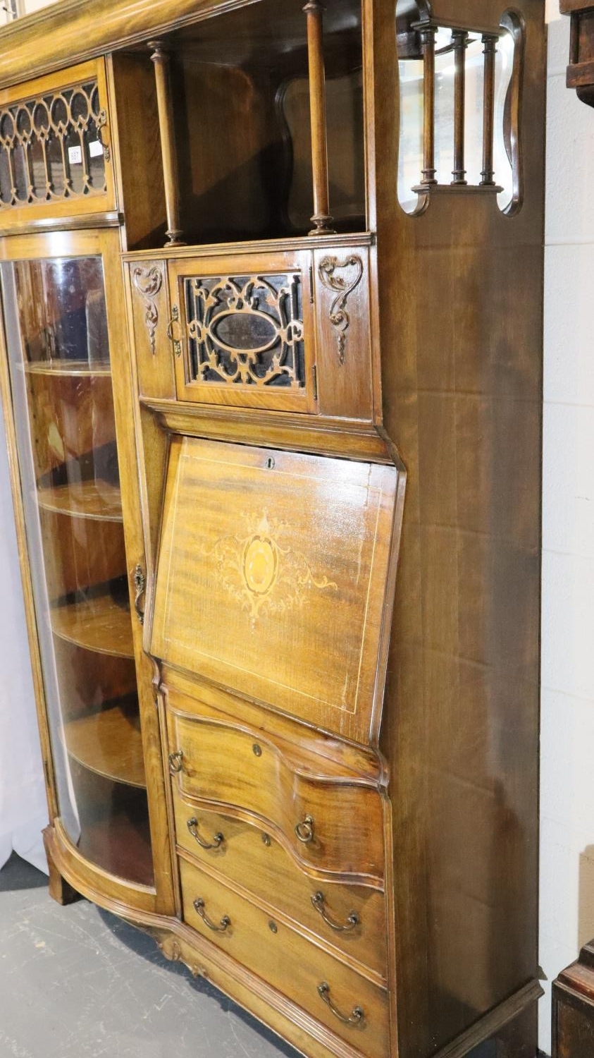 Good Edwardian combination inlaid display cabinet with bow glazed door, serpentine chest and fitted fall front bureau, 106 x 34 x 177H cm. Not available for in-house P&P, contact Paul O'Hea at Mailboxes on 01925 659133