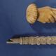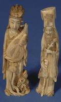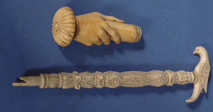 2 early carved ivory parasol handles, hand 10cm approx & bird 23cm approx (damaged base) -