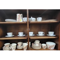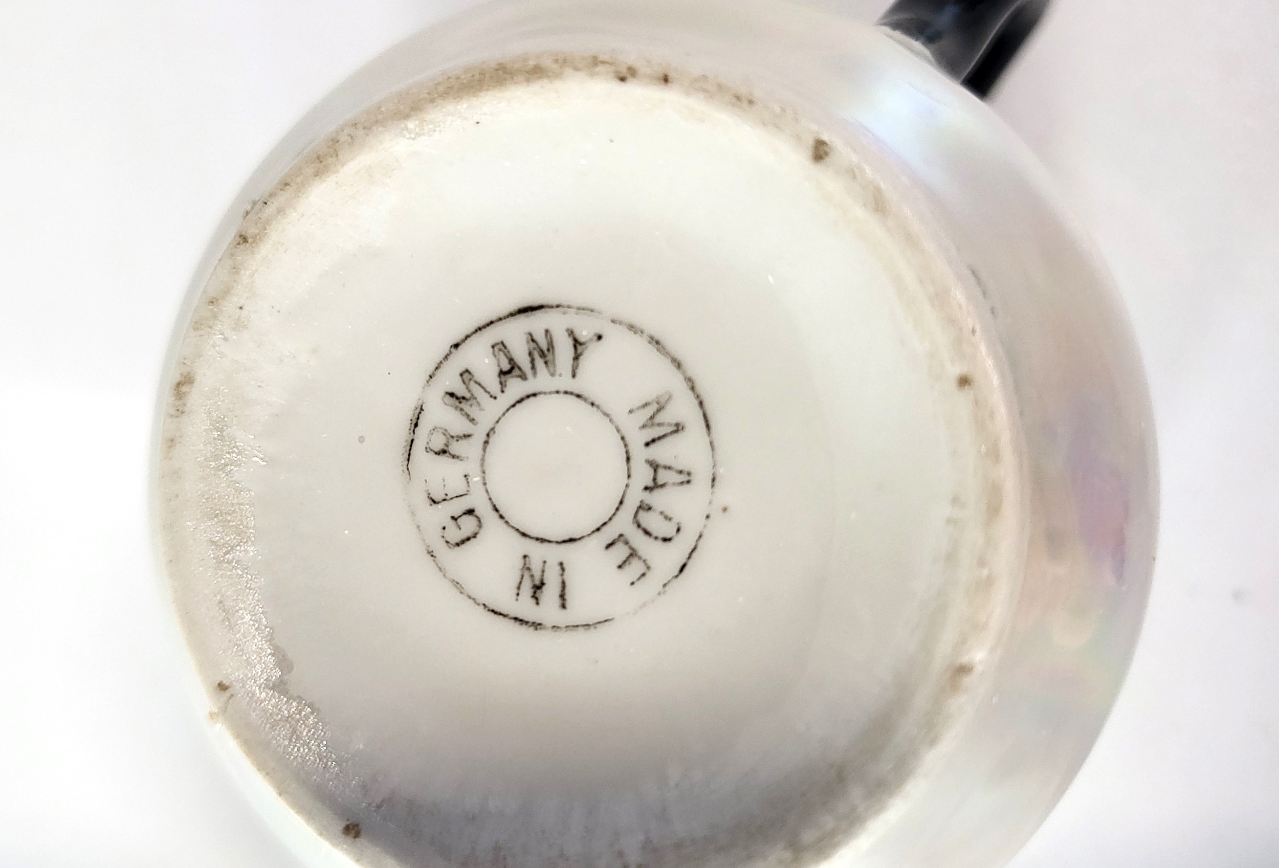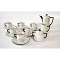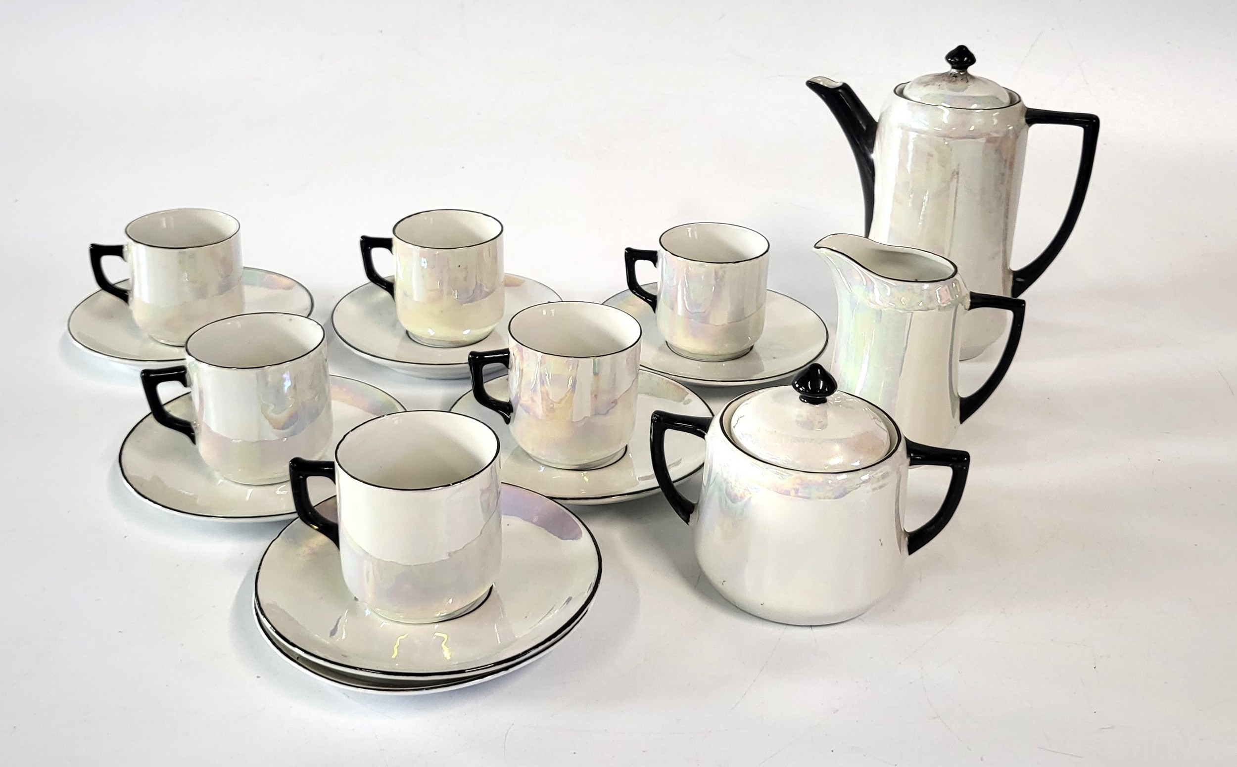 A German opalescent coffee set comprising of six cups and seven saucers, coffee pot, cream jug and lidded sugar bowl. (16)