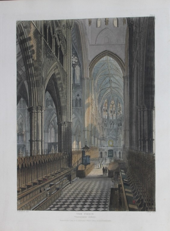 F Mackenzie - The Choir in Westminster Abbey engraved by J Bluck 1812. This aquatint print is from The History of the Abbey Church of St. Peter's Westminster, Its Antiquities and Monuments by Rudolph Ackermann and William Combe, published in London 1812.