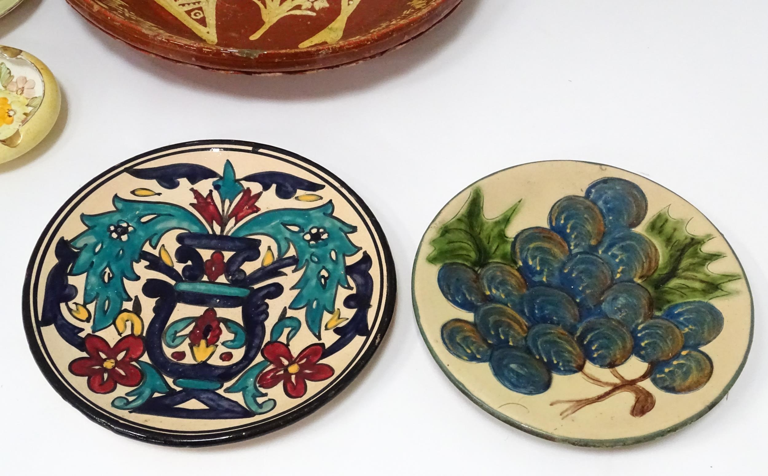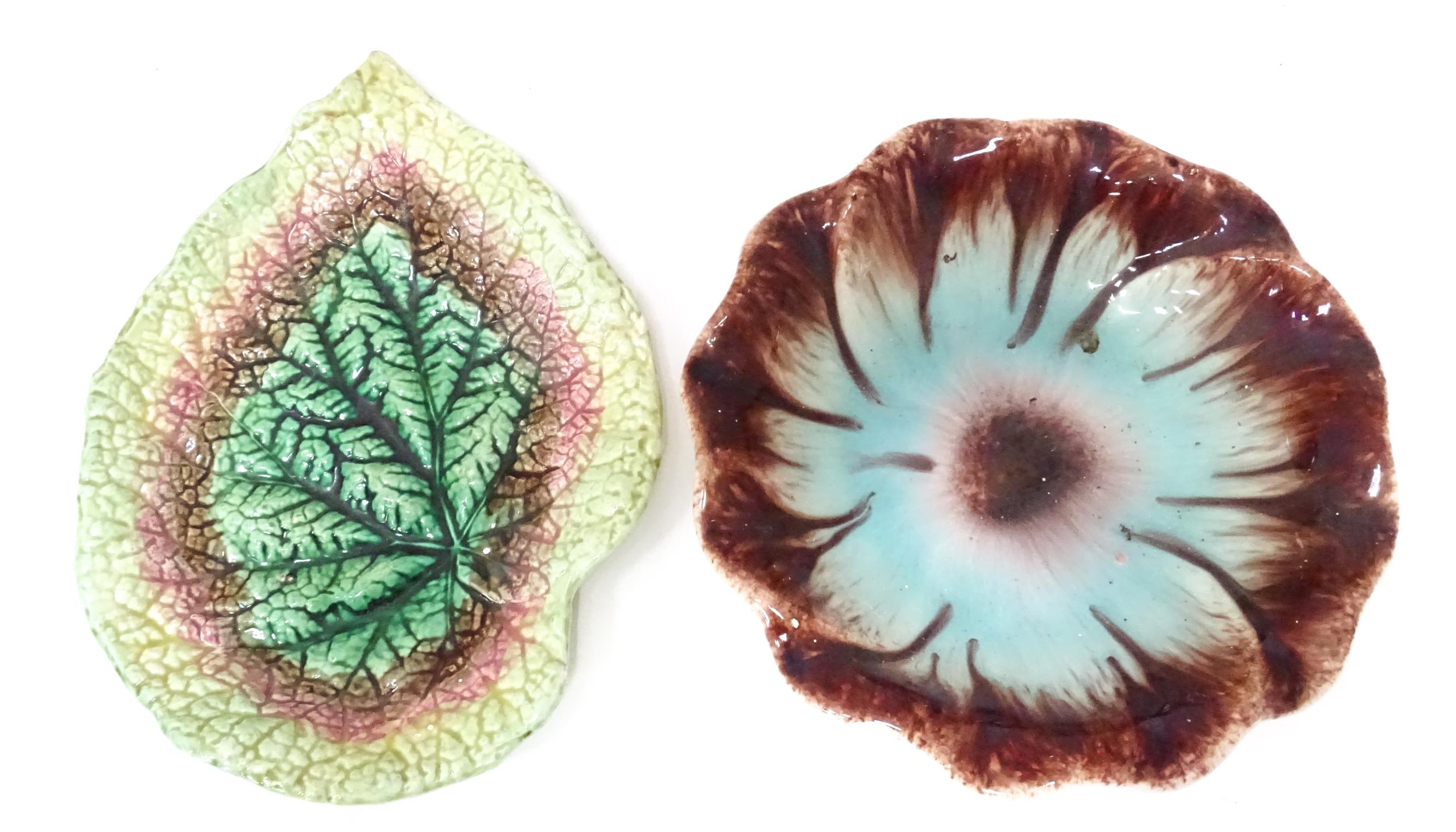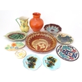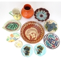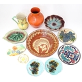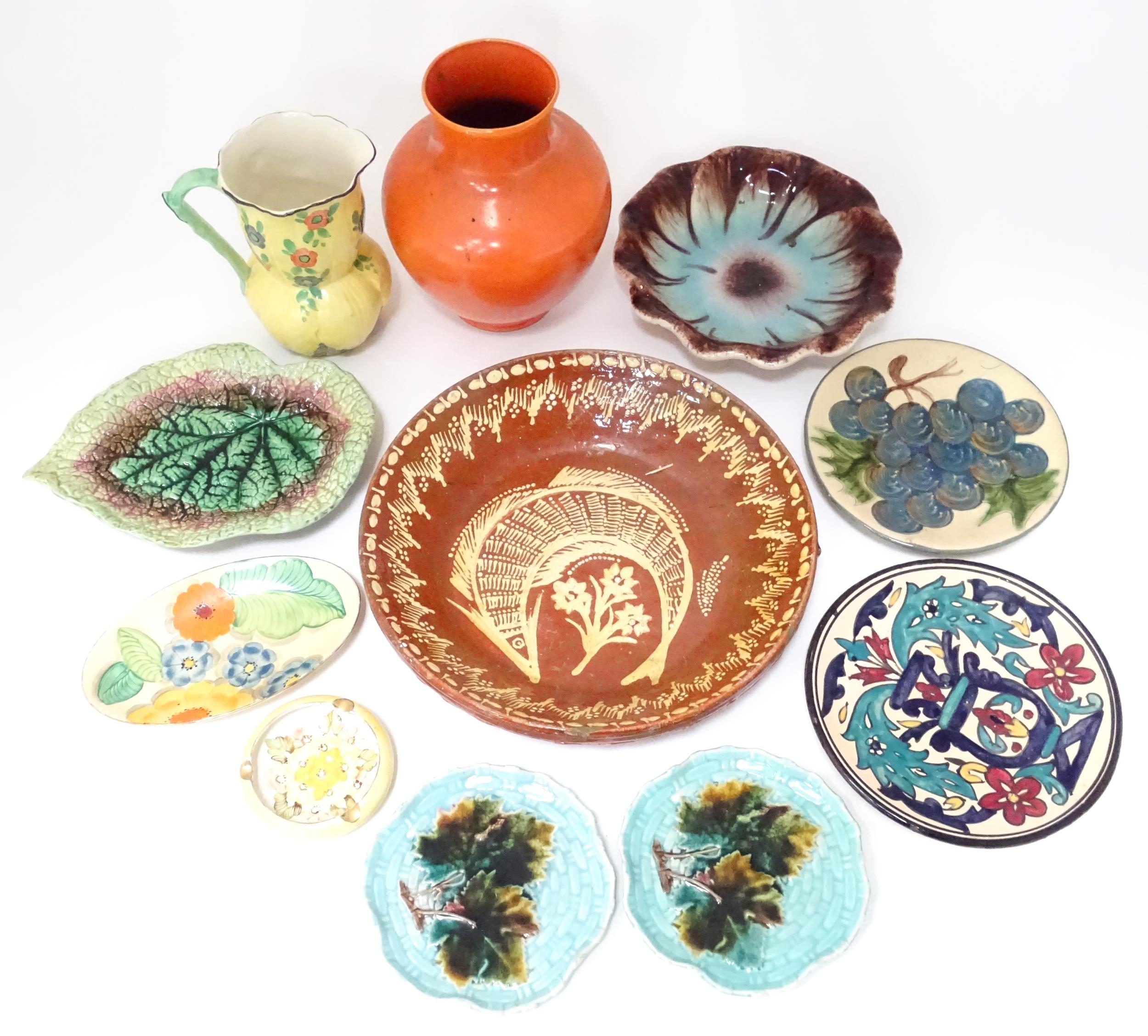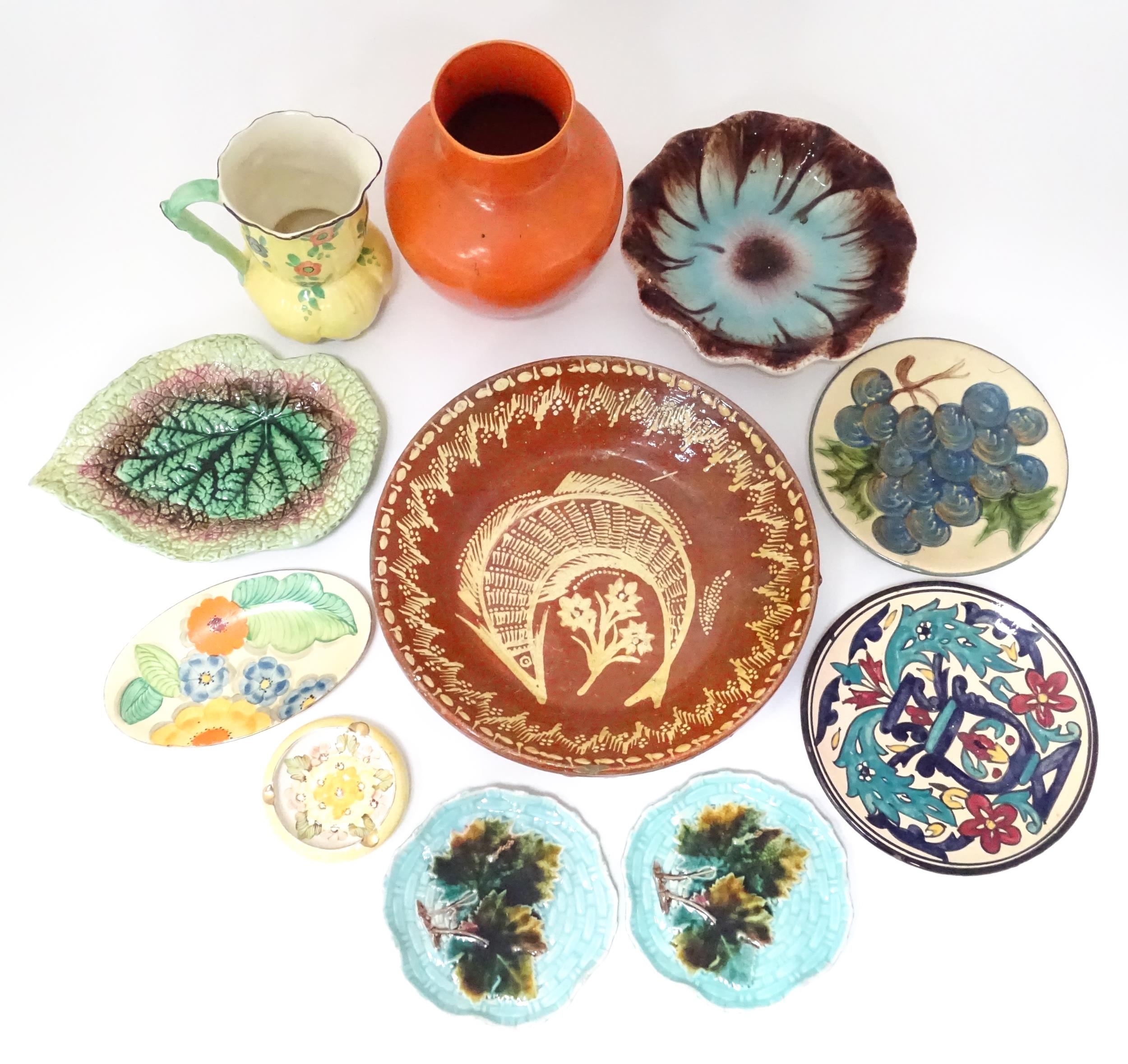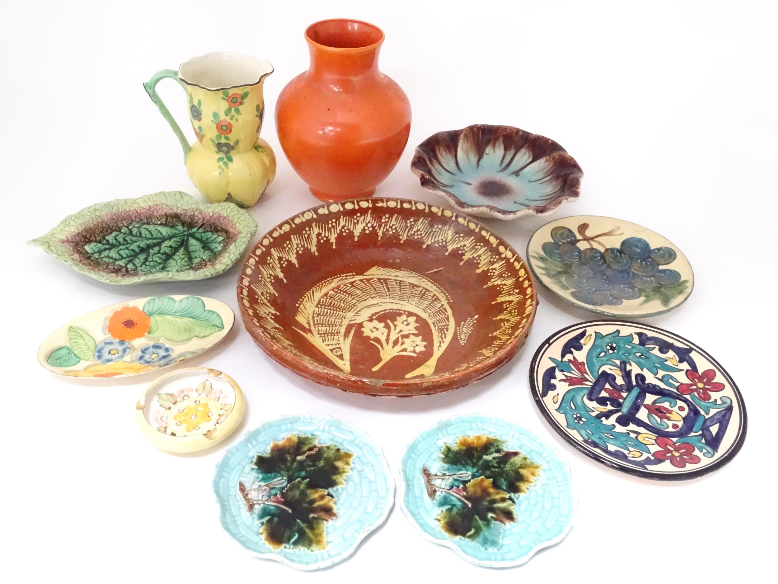 A quantity of assorted ceramics to include a majolica leaf plate and two saucers with foliate detail, two Gray's Pottery dishes with floral decoration, an orange Lancastrian vase, a terracotta charger with fish decoration, etc.