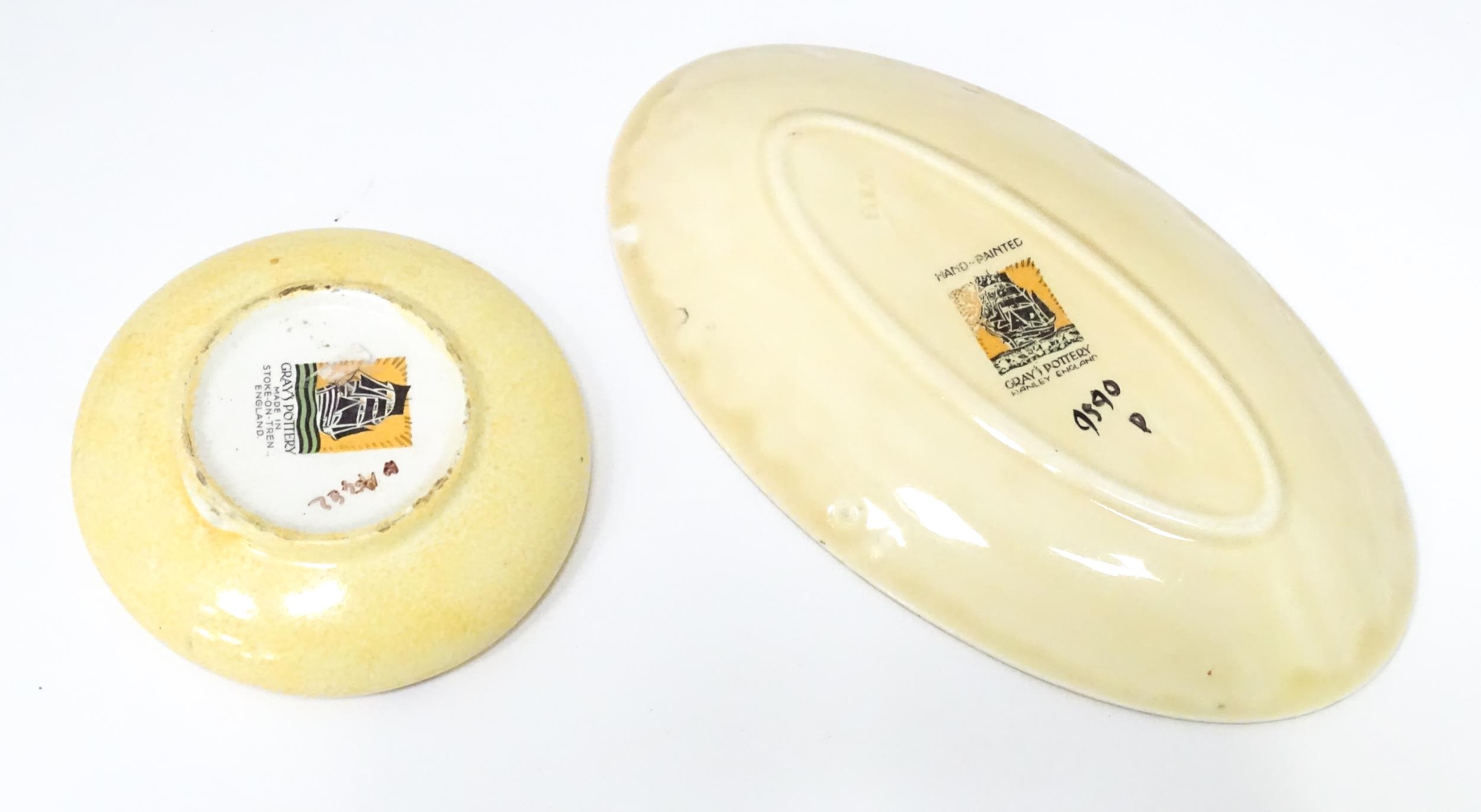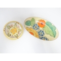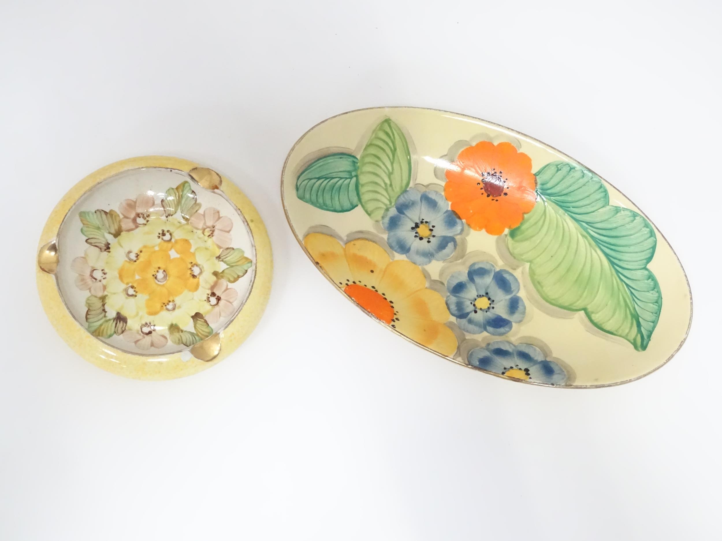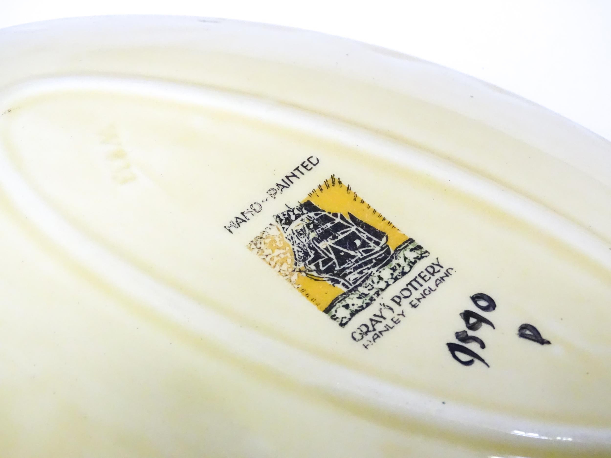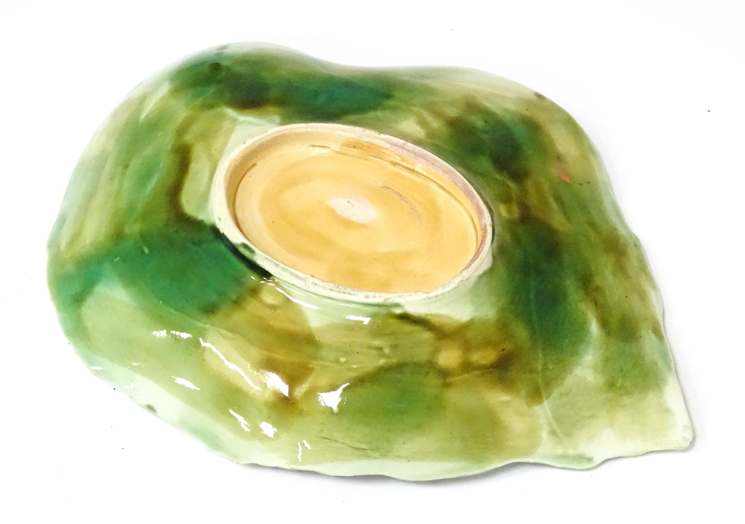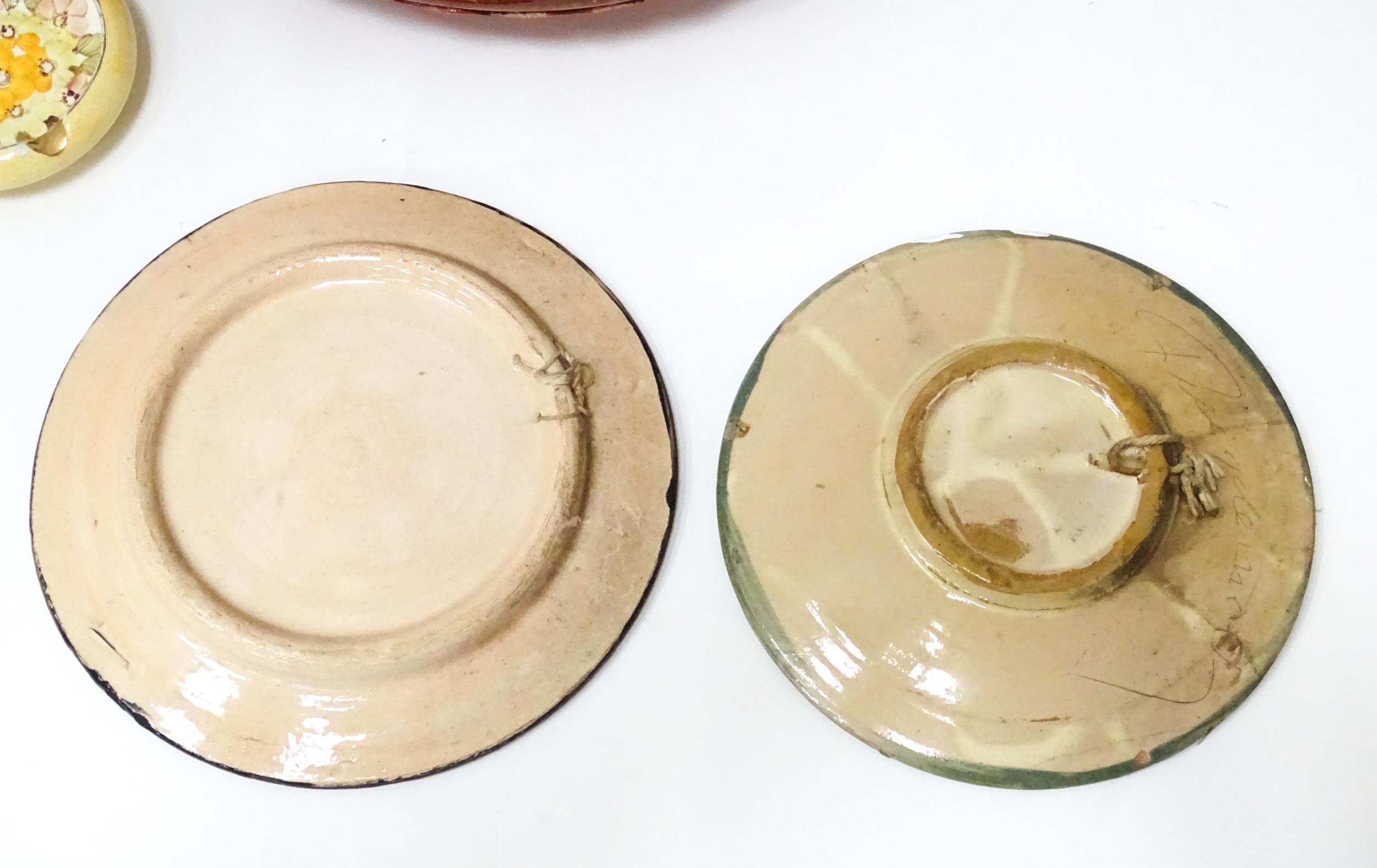 A quantity of assorted ceramics to include a majolica leaf plate and two saucers with foliate detail, two Gray's Pottery dishes with floral decoration, an orange Lancastrian vase, a terracotta charger with fish decoration, etc.