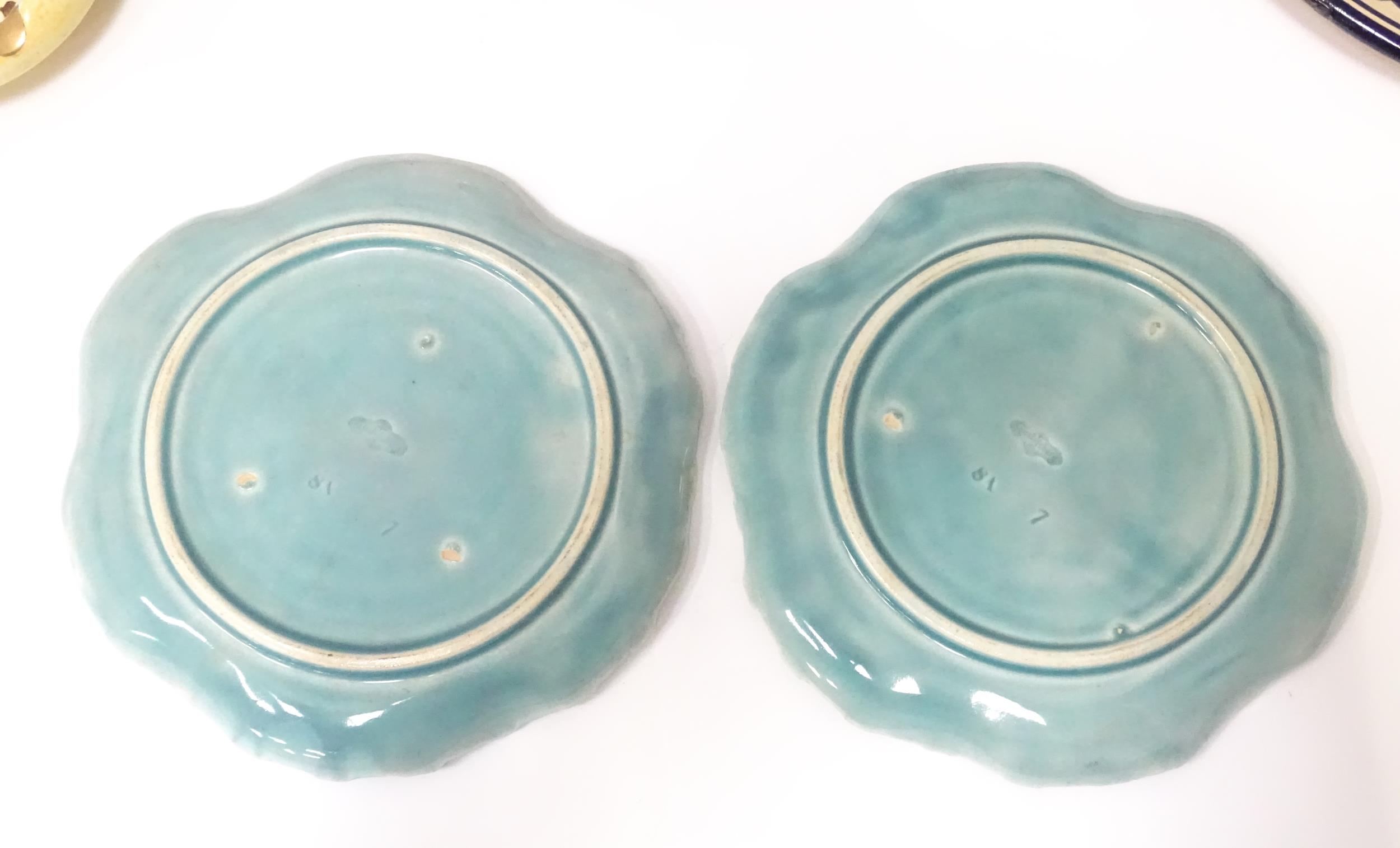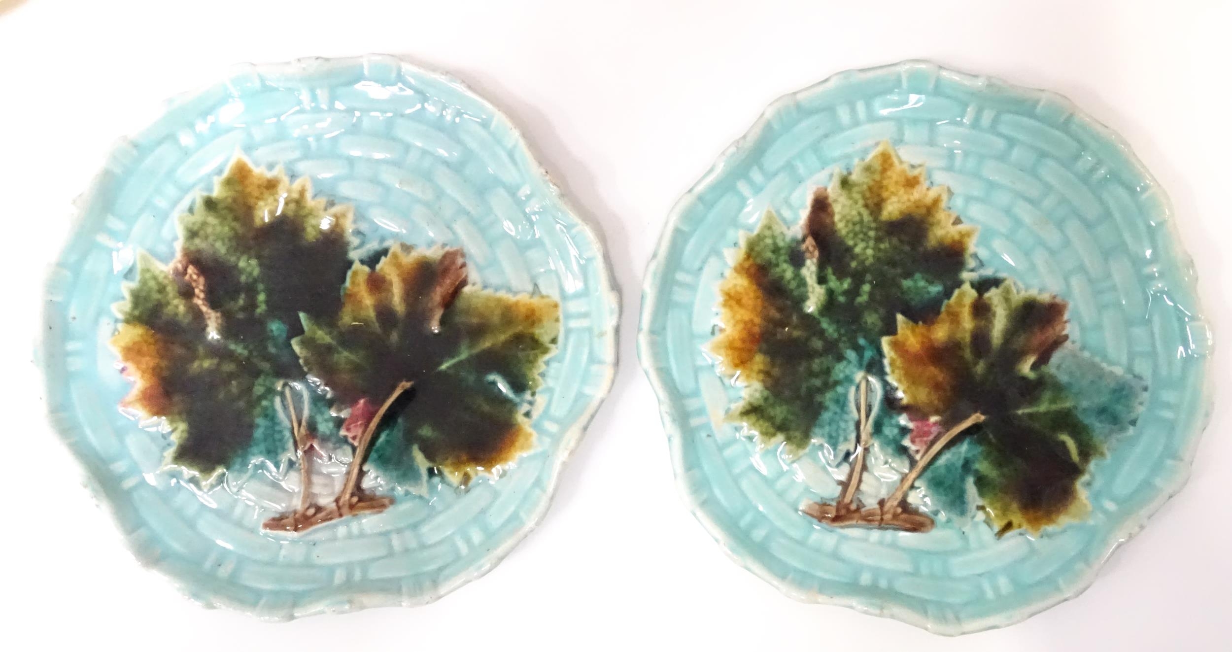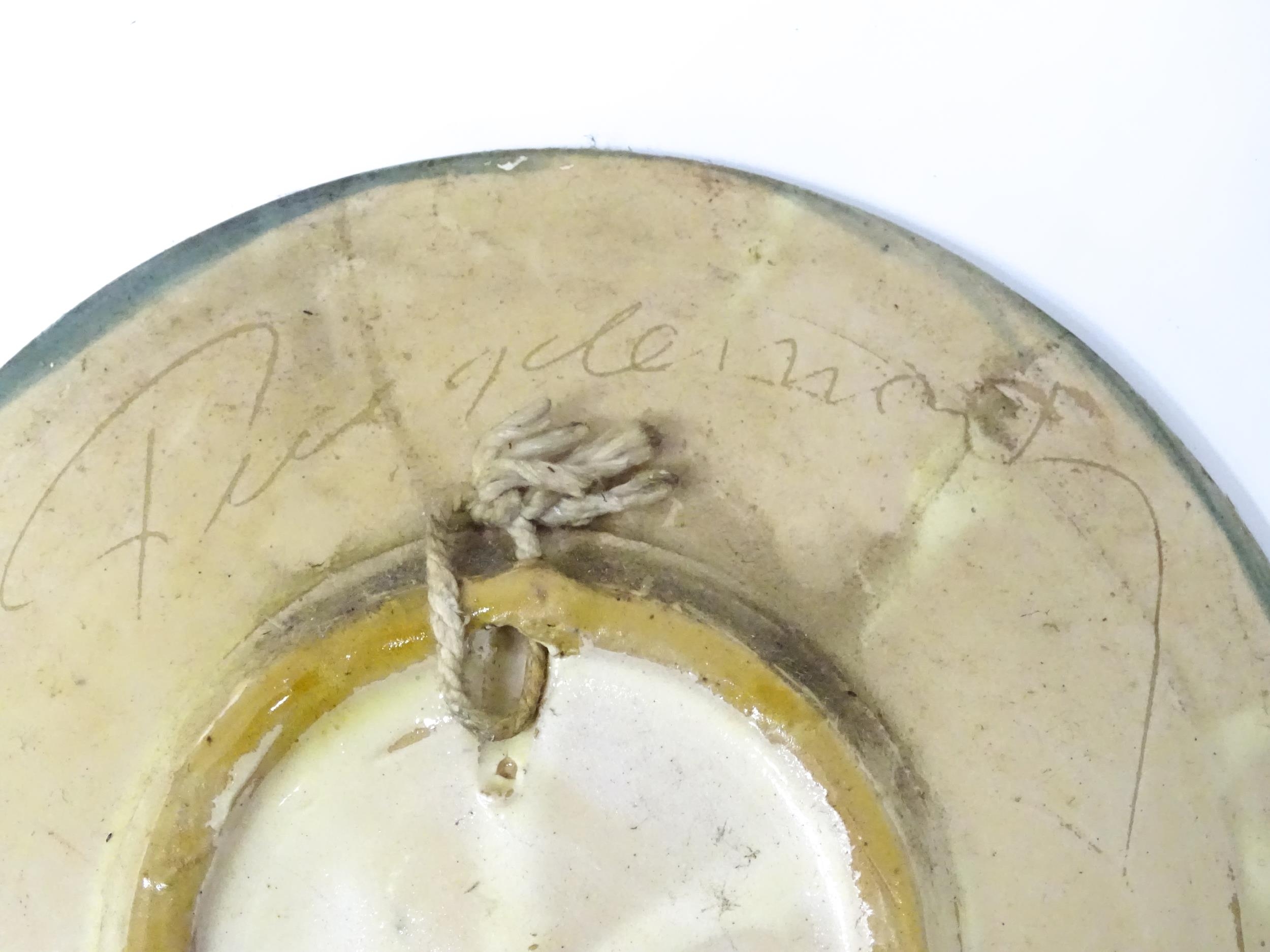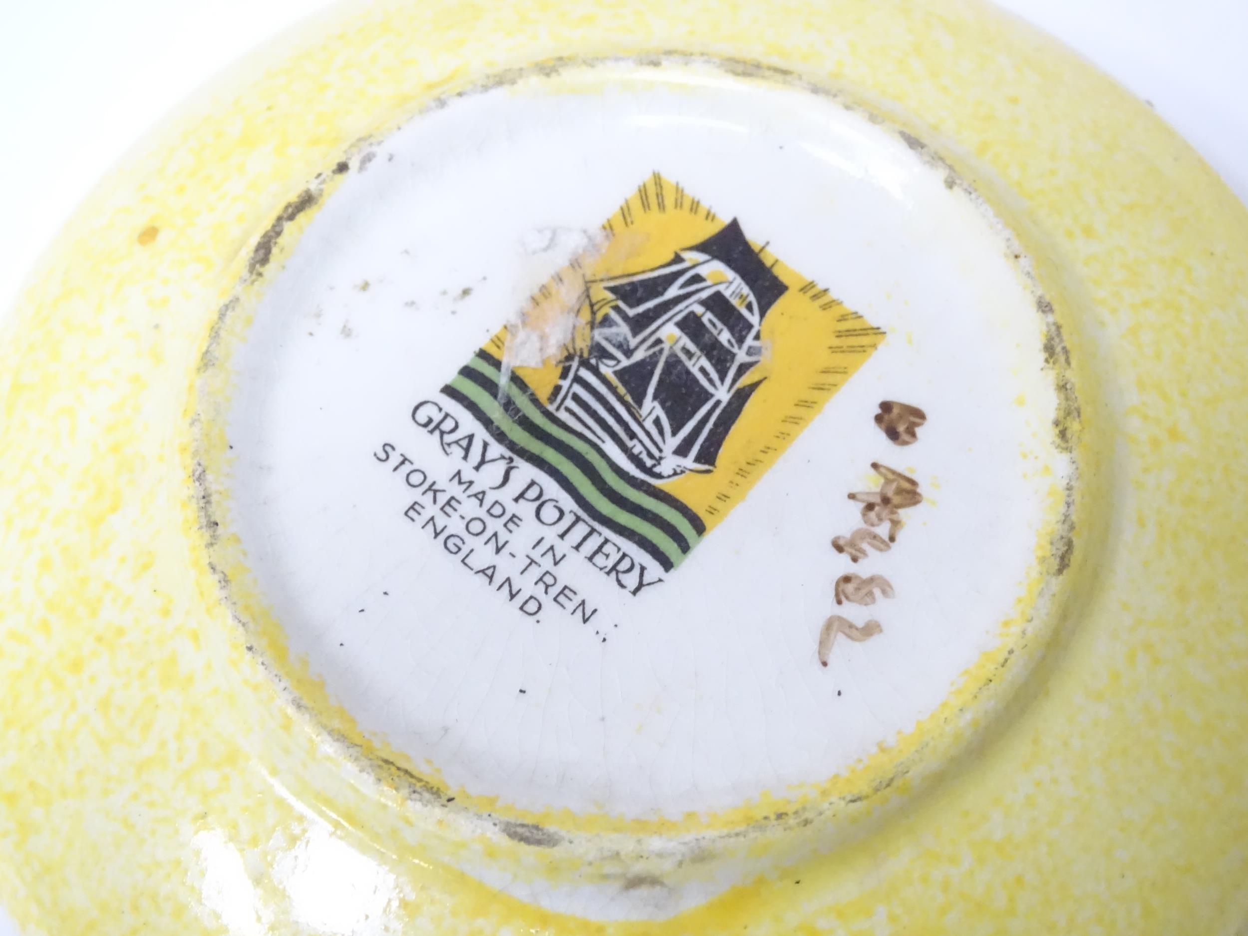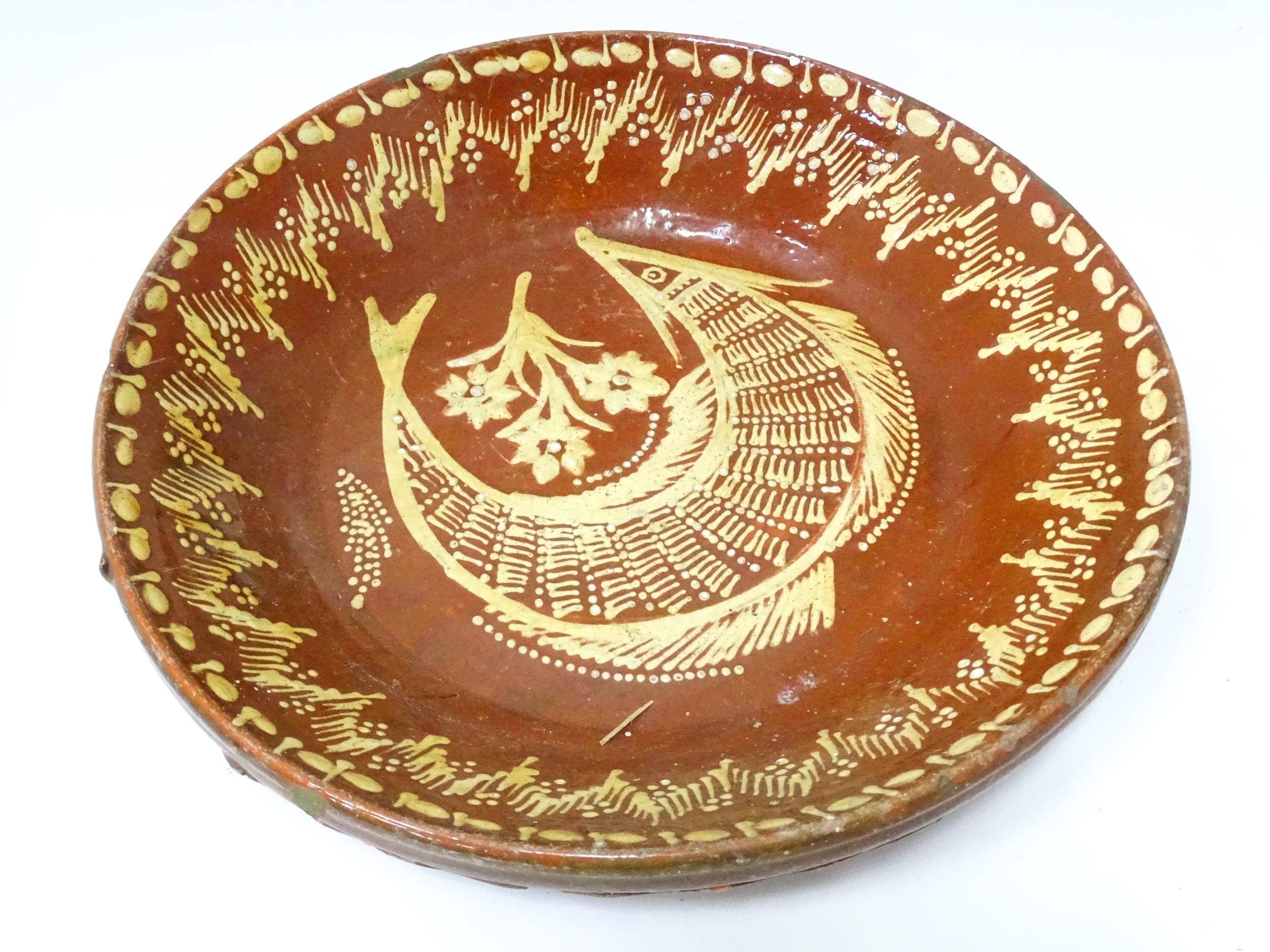 A quantity of assorted ceramics to include a majolica leaf plate and two saucers with foliate detail, two Gray's Pottery dishes with floral decoration, an orange Lancastrian vase, a terracotta charger with fish decoration, etc.