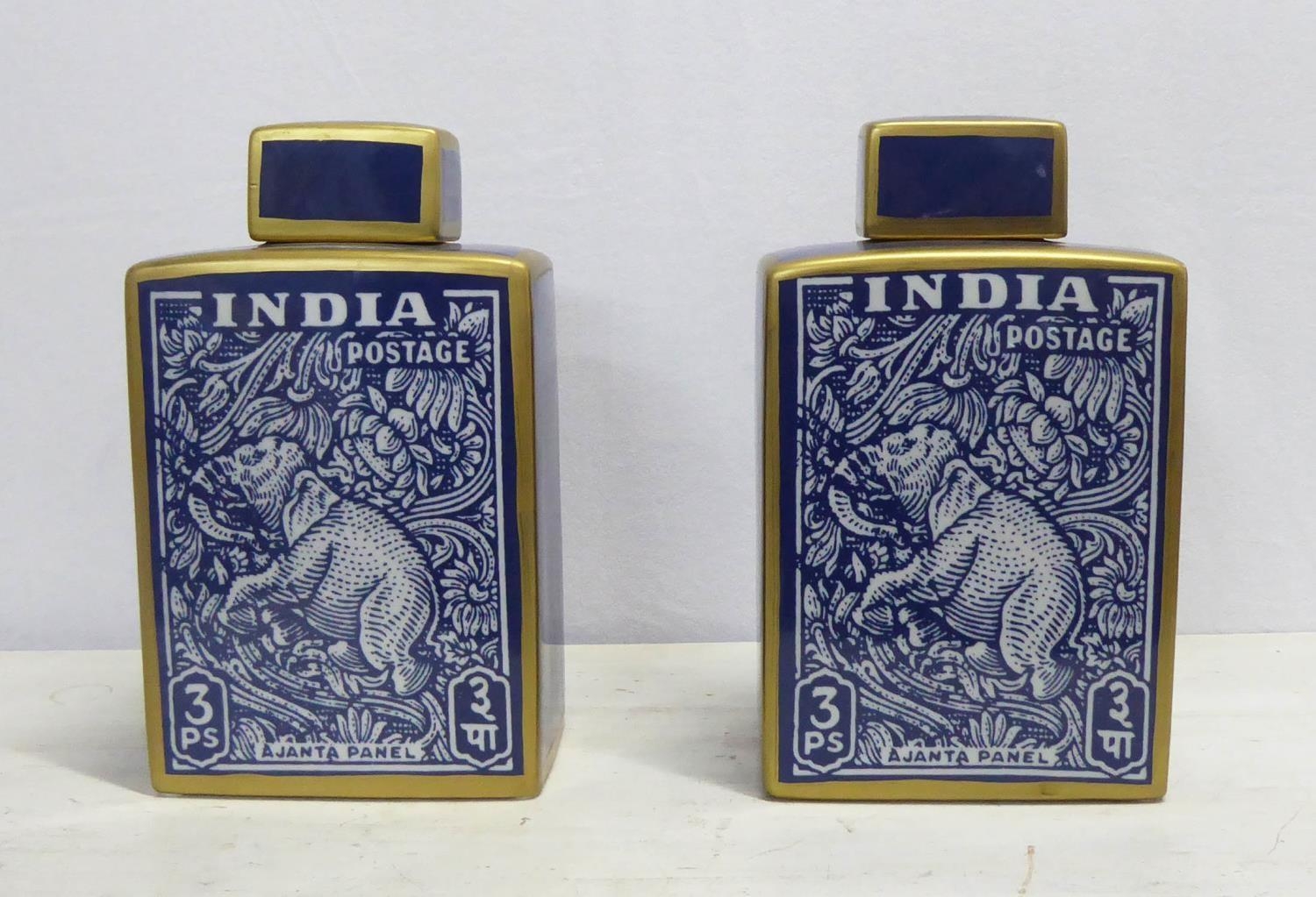 GINGER JARS, a pair, ceramic, with vintage style Indian postage print, 32cm H approx. (2)