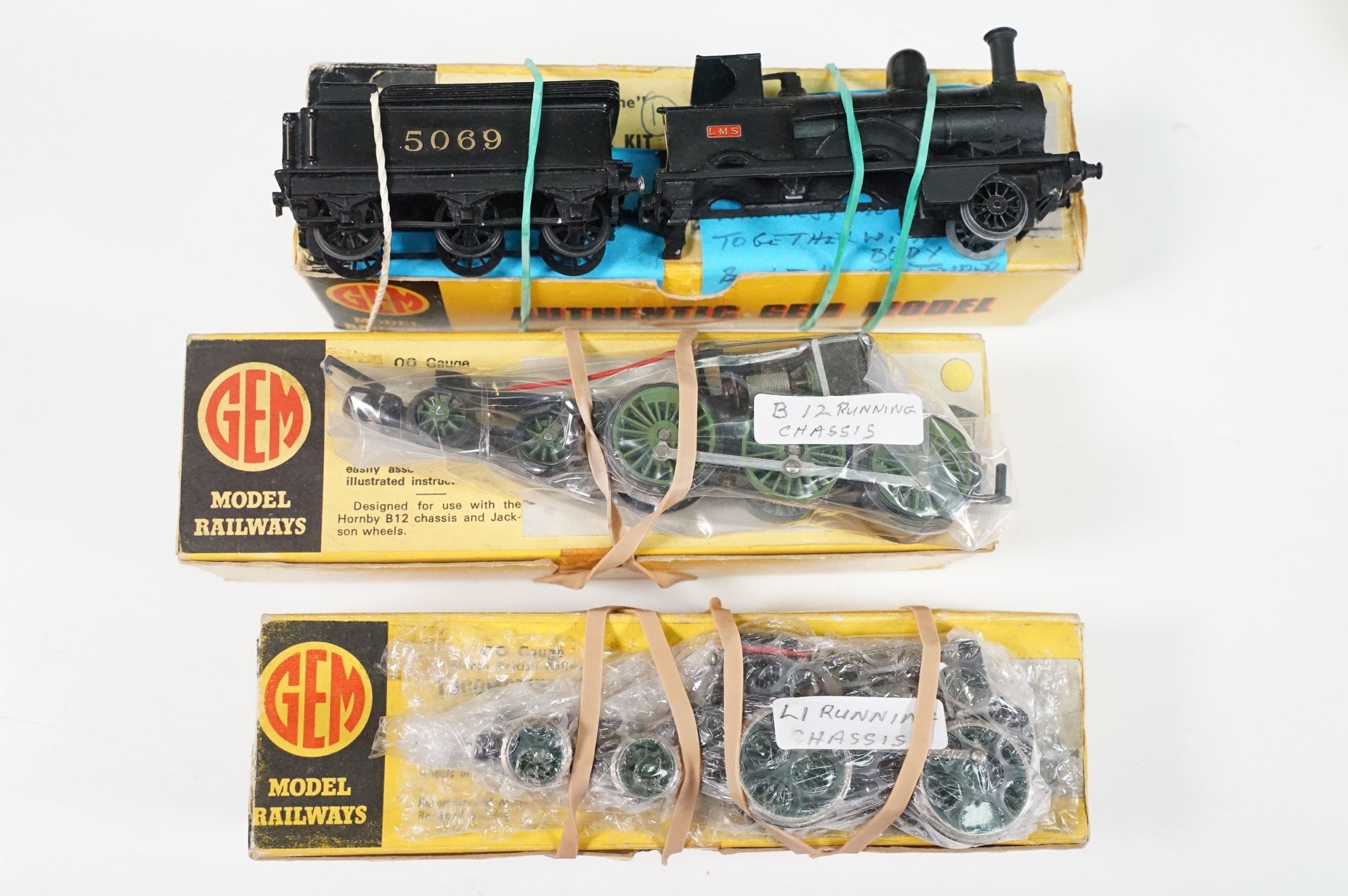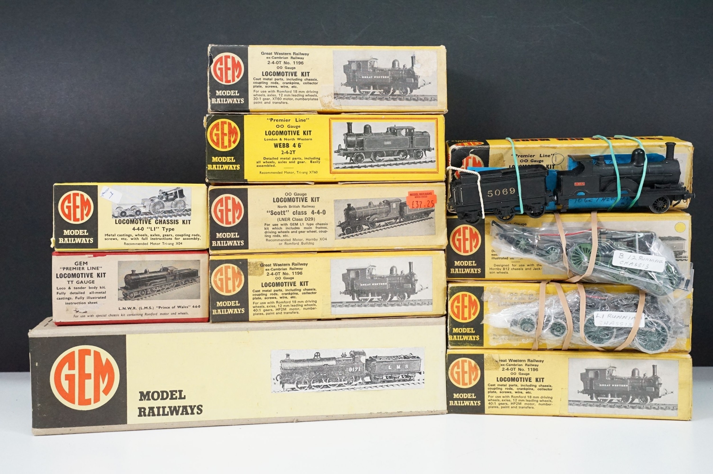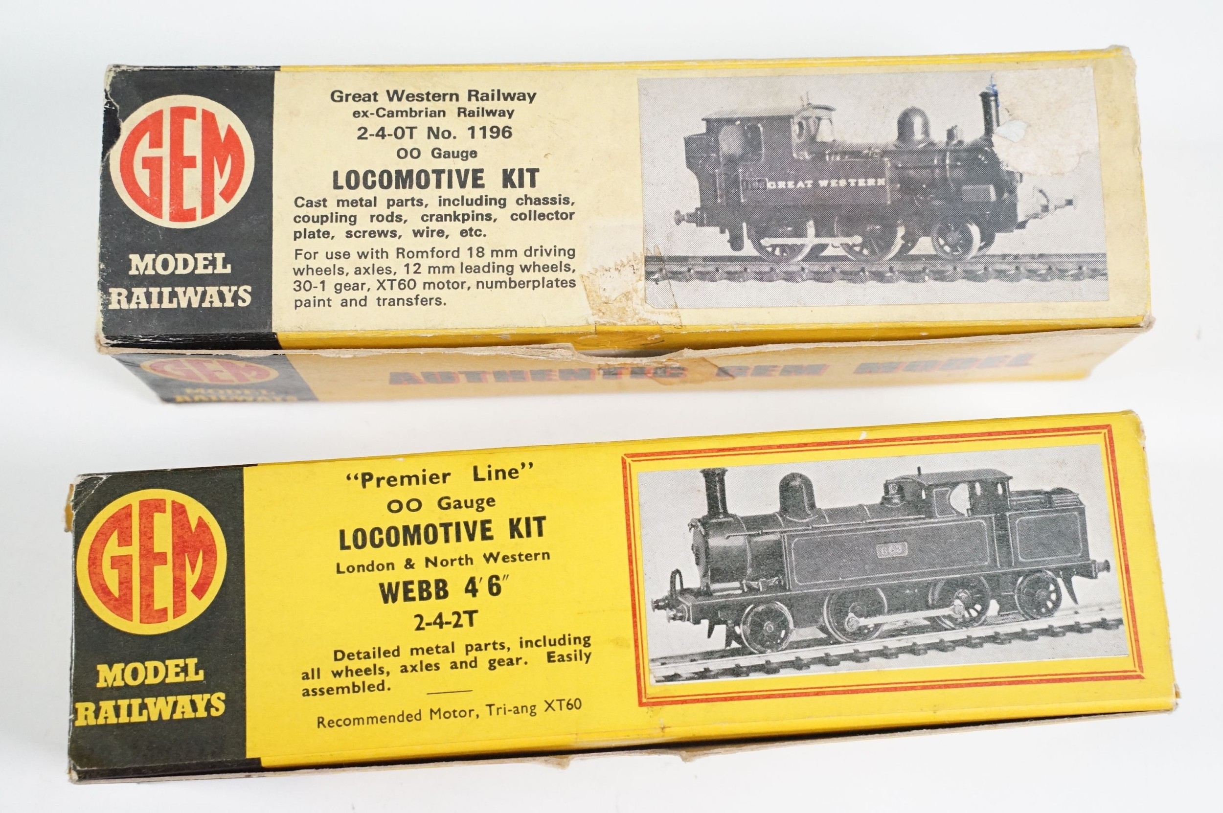 10 Boxed Gem OO gauge model locomotive kits to include Cardean Caladonion 4-6-0 (unbuilt with motorised B12 chassis), 2 x GWR ex-Cambrian 2-4-0T No 1186 (both unbuilt), LNWR 2-4-2T Webb 4' 6'' Class (unbuilt) etc plus a boxed Gem TT gugae Premier Line Locomotive Kit (unbuilt) (11 items)
