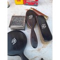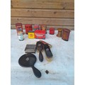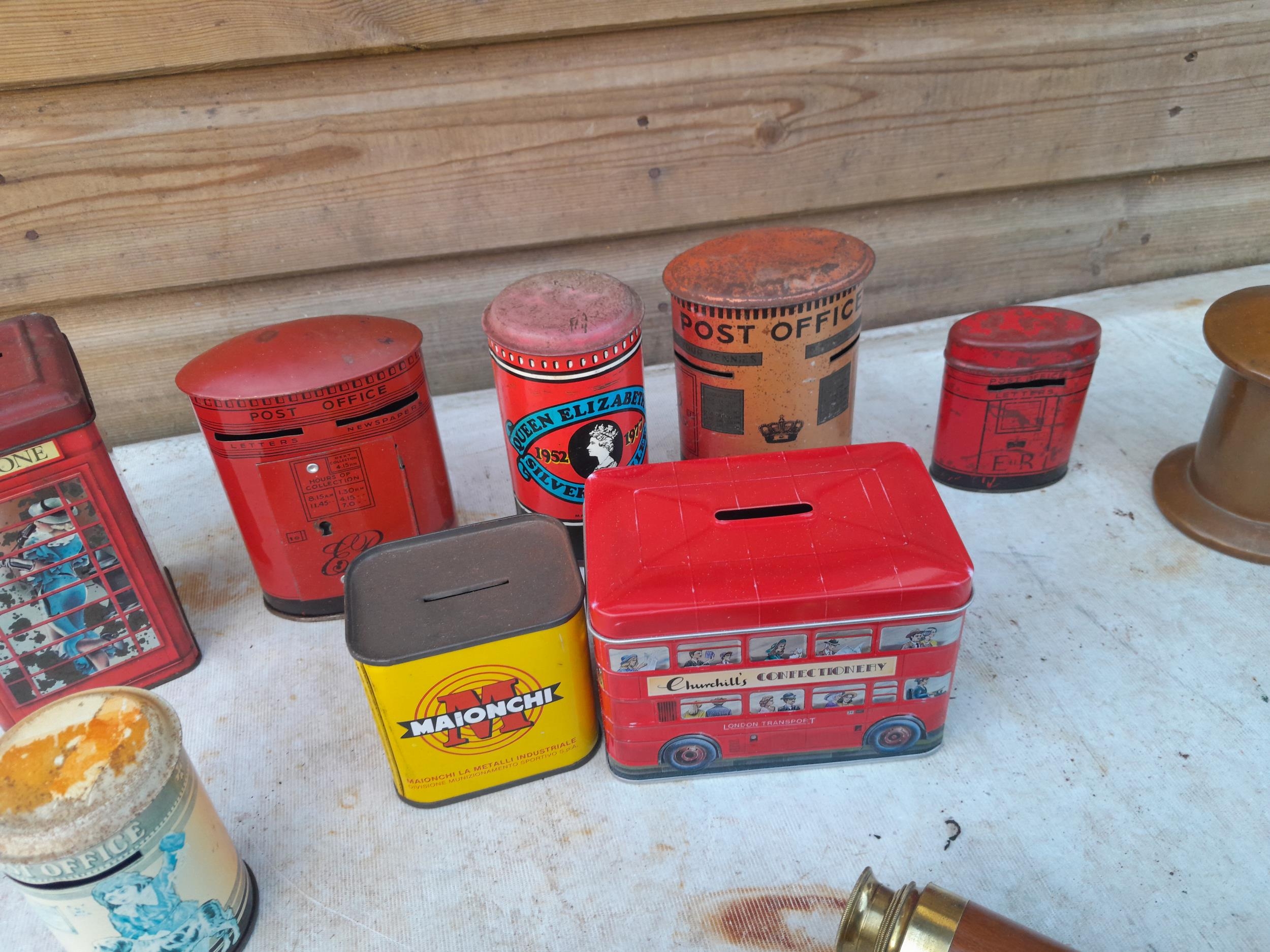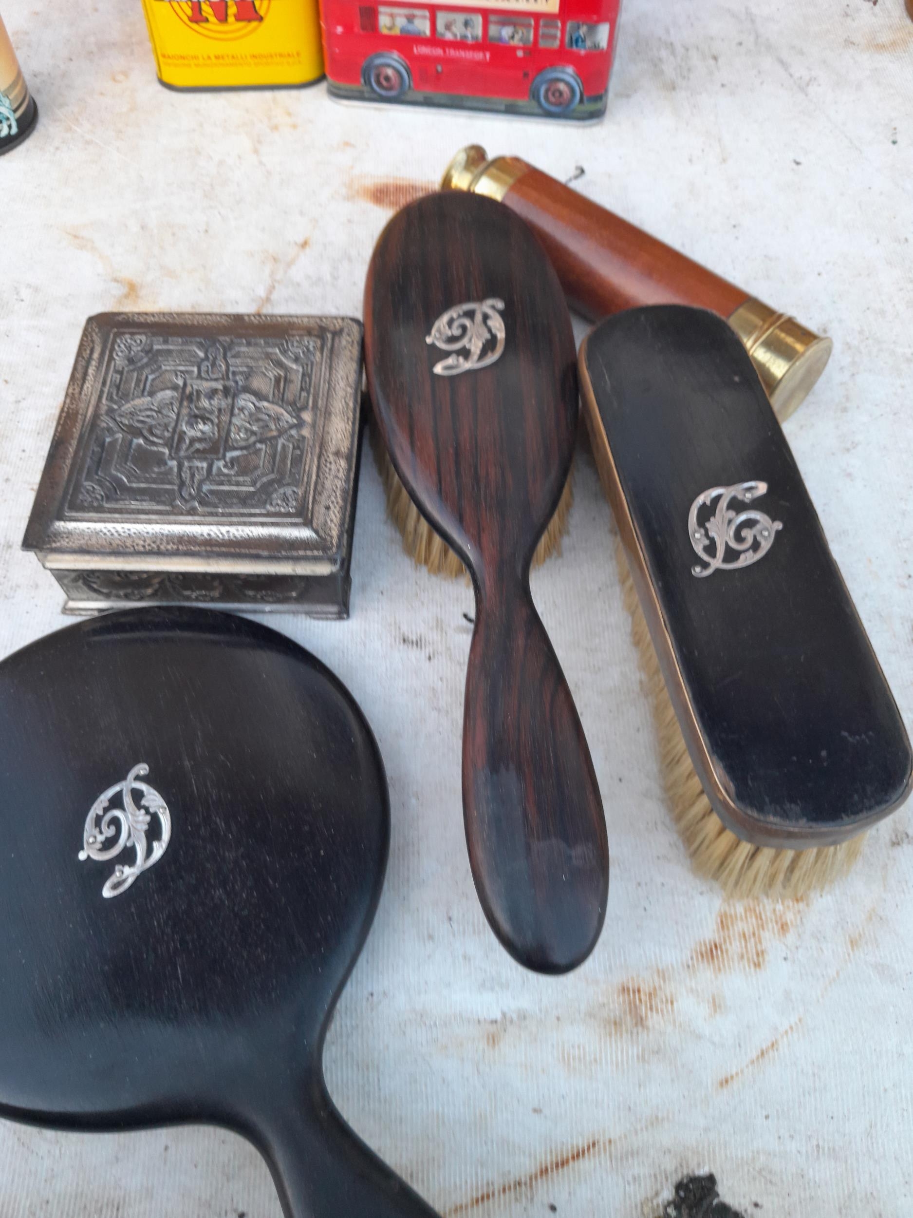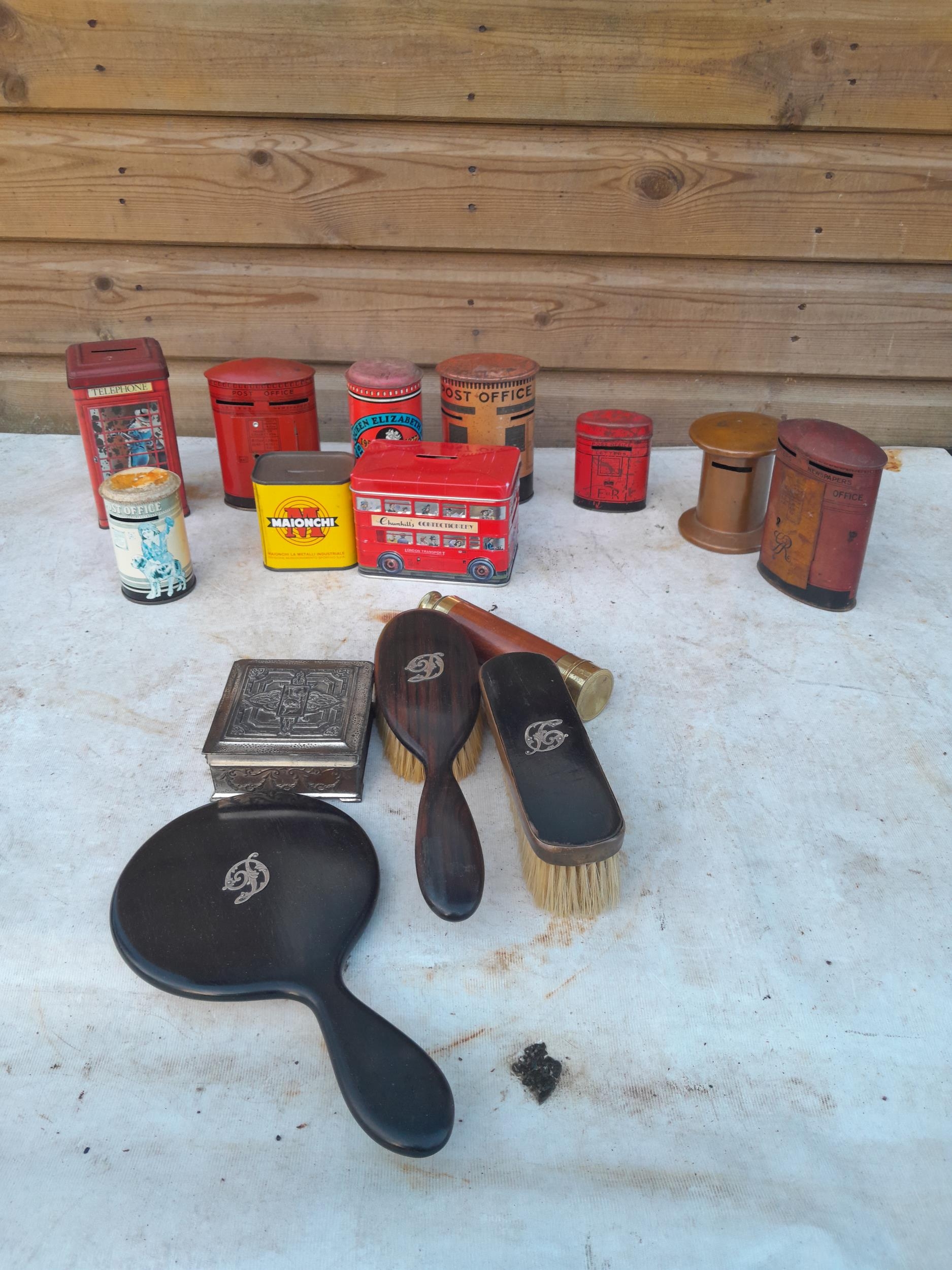 Vintage money box tins, ebony brushes with small amount of silver on backs etc.