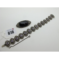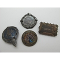Burmese (Myanmar) Coins, converted to brooches (one highlighted in enamel), Siam brooch and a Victorian Mizpah rectangular panel brooch. (4)