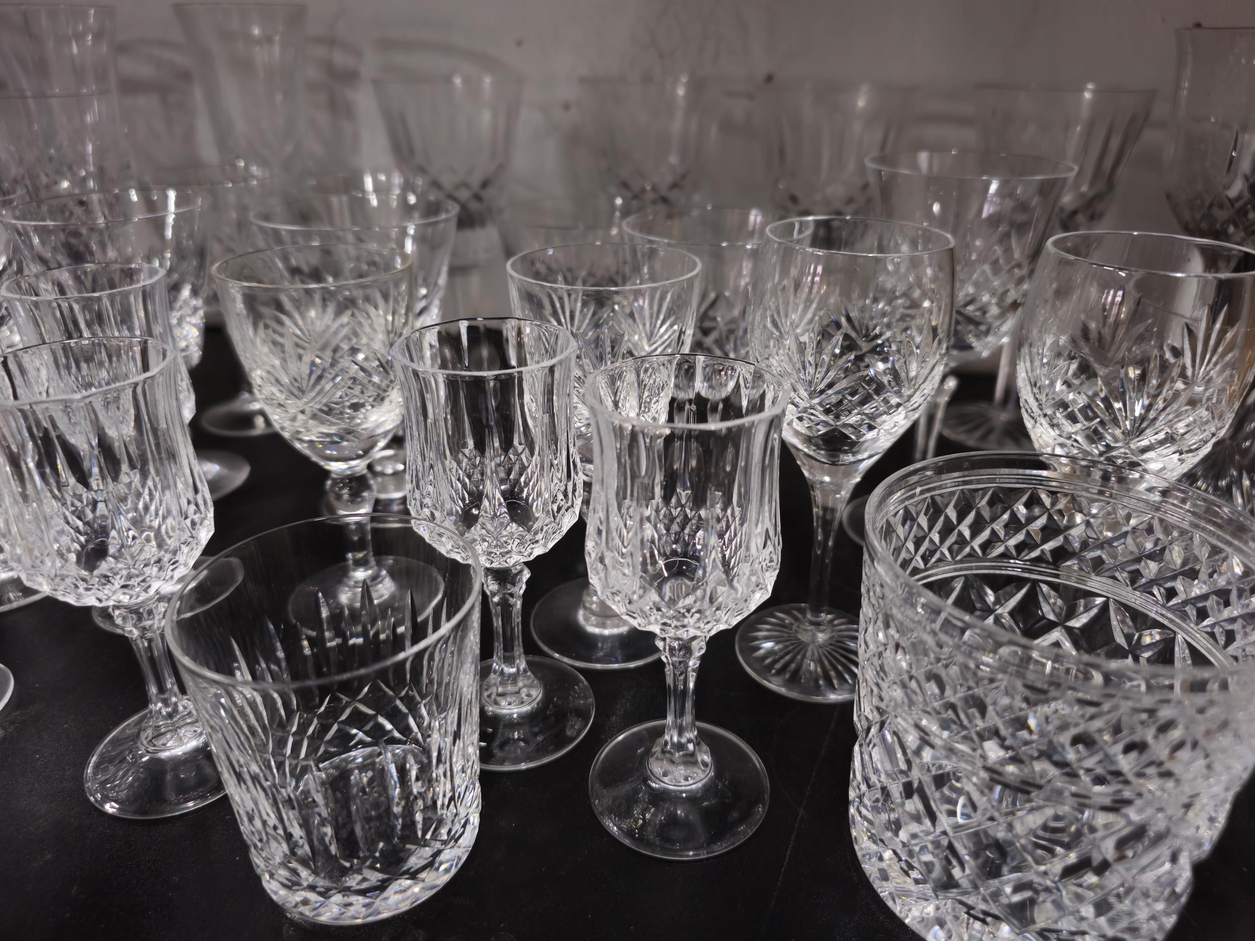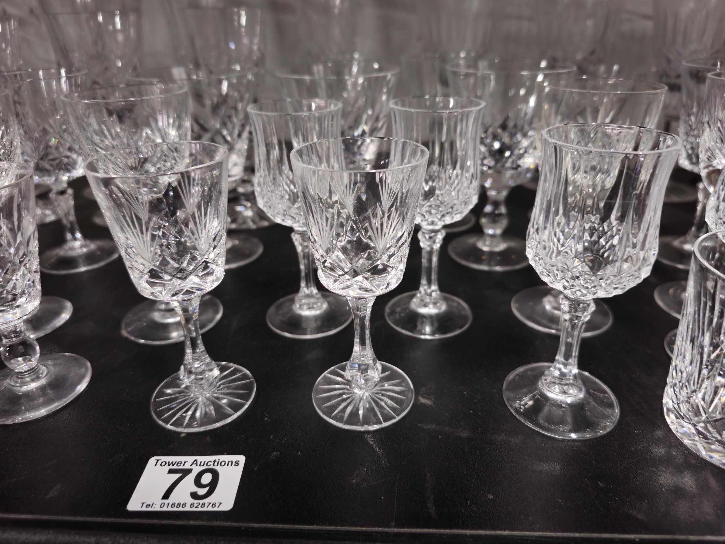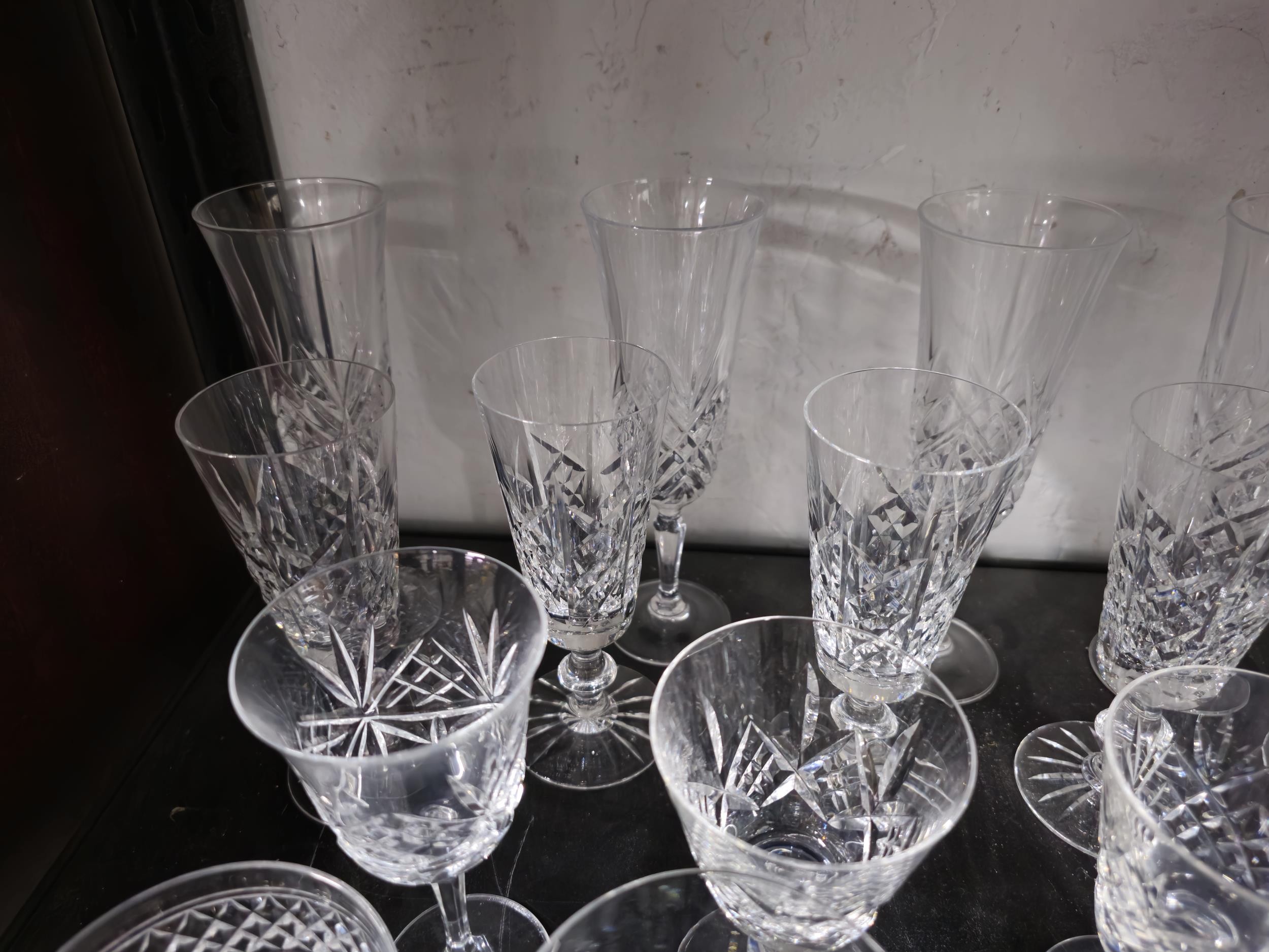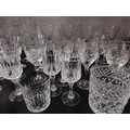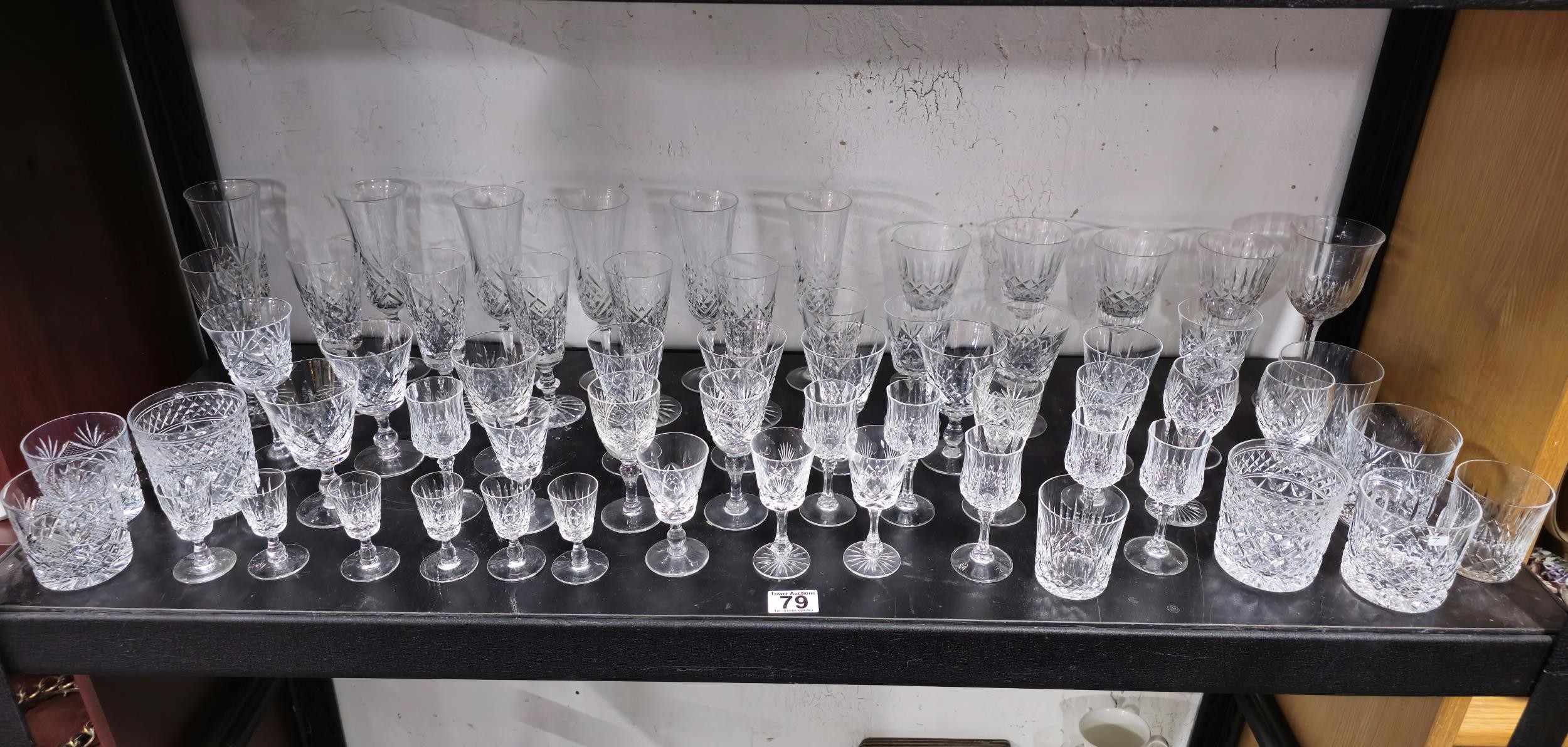 A large collection of assorted cut glass crystal drinking glasses to include a total of 58 glasses to include wine glasses, champagne glasses, sherry glasses and whiskey tumblers by various glass making brands to include Edinburgh Crystal, Stuart crystal and Tomas Webb glasses, all are in good order with varying designs
