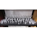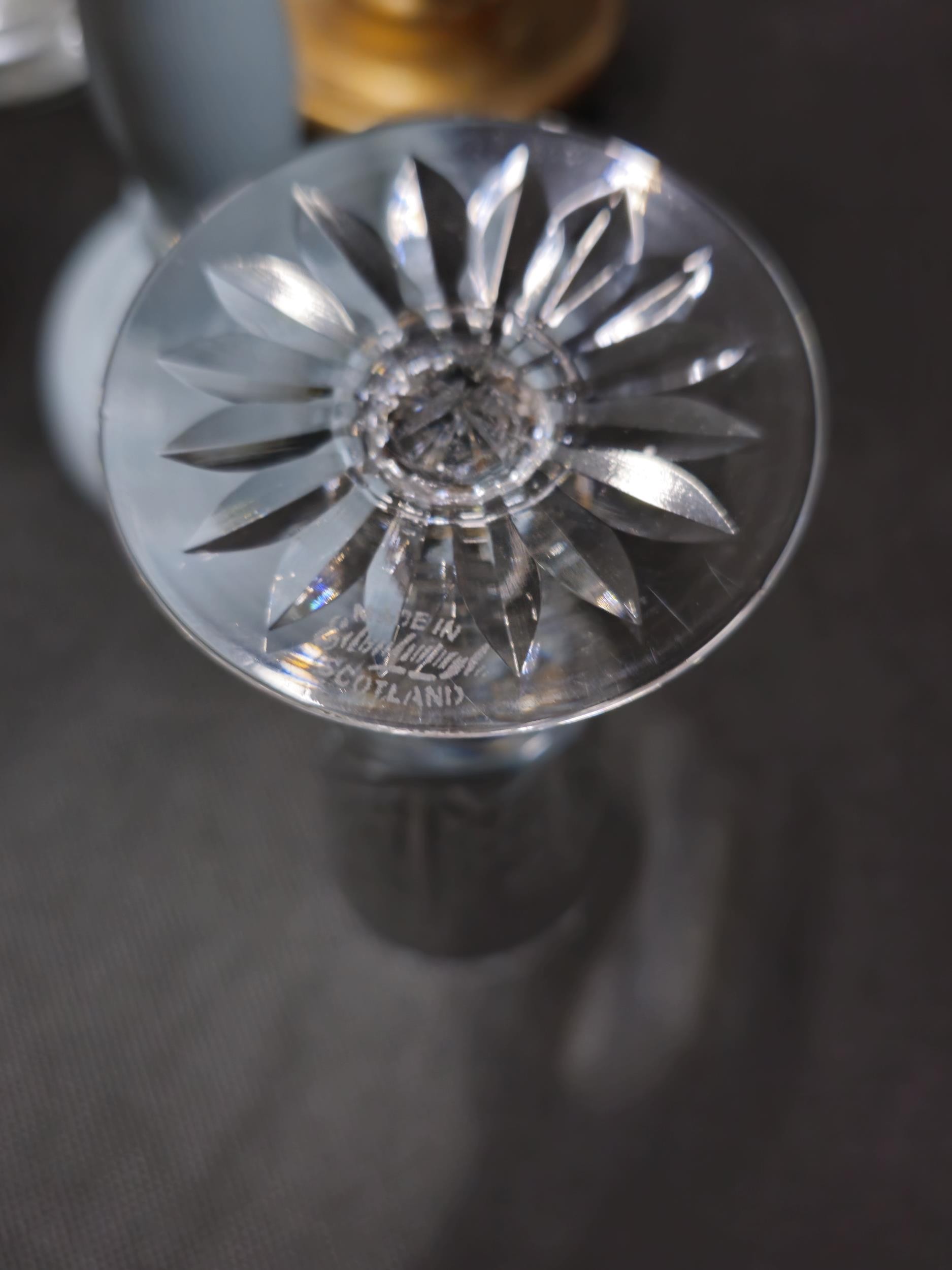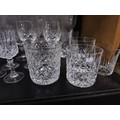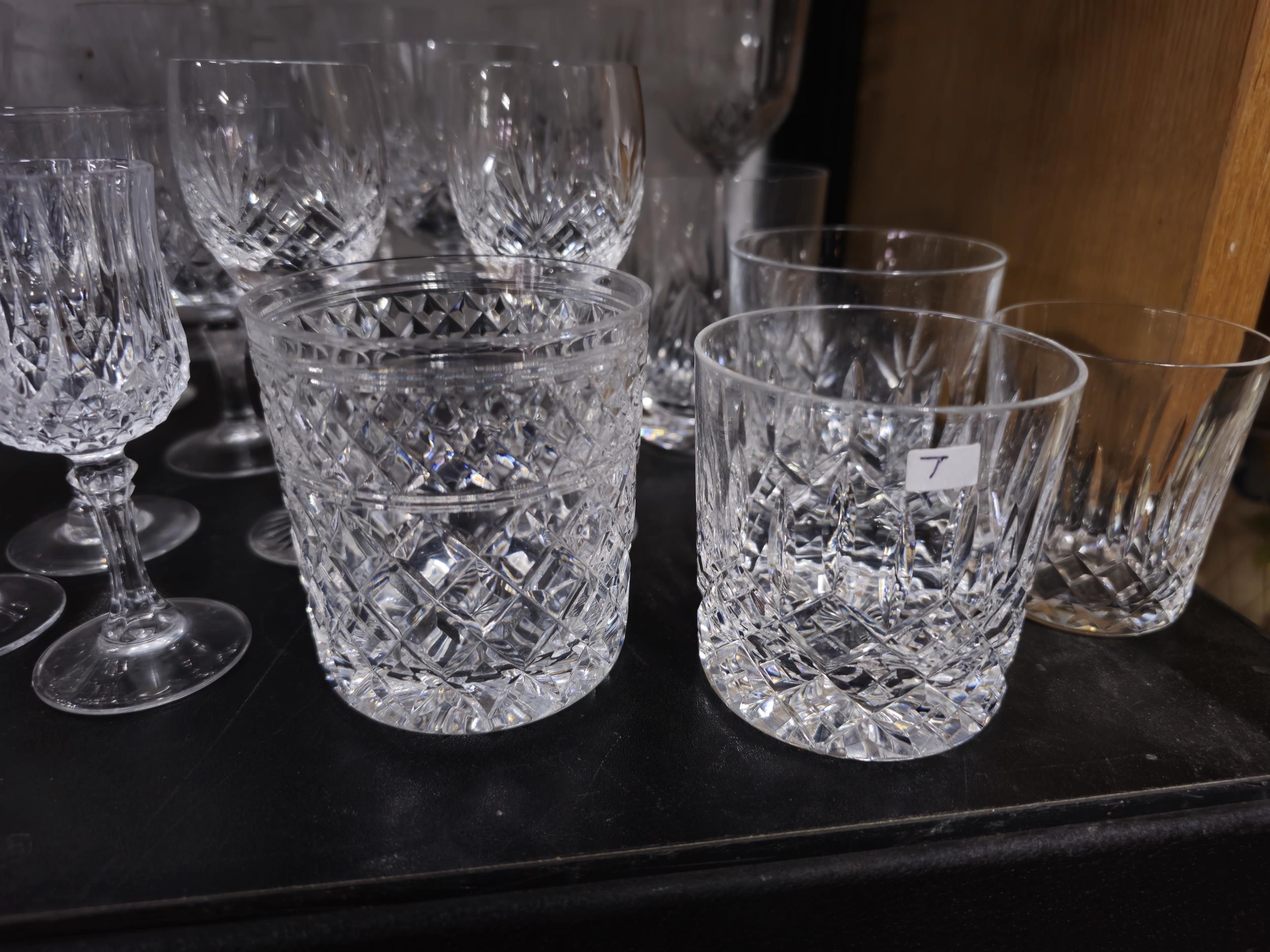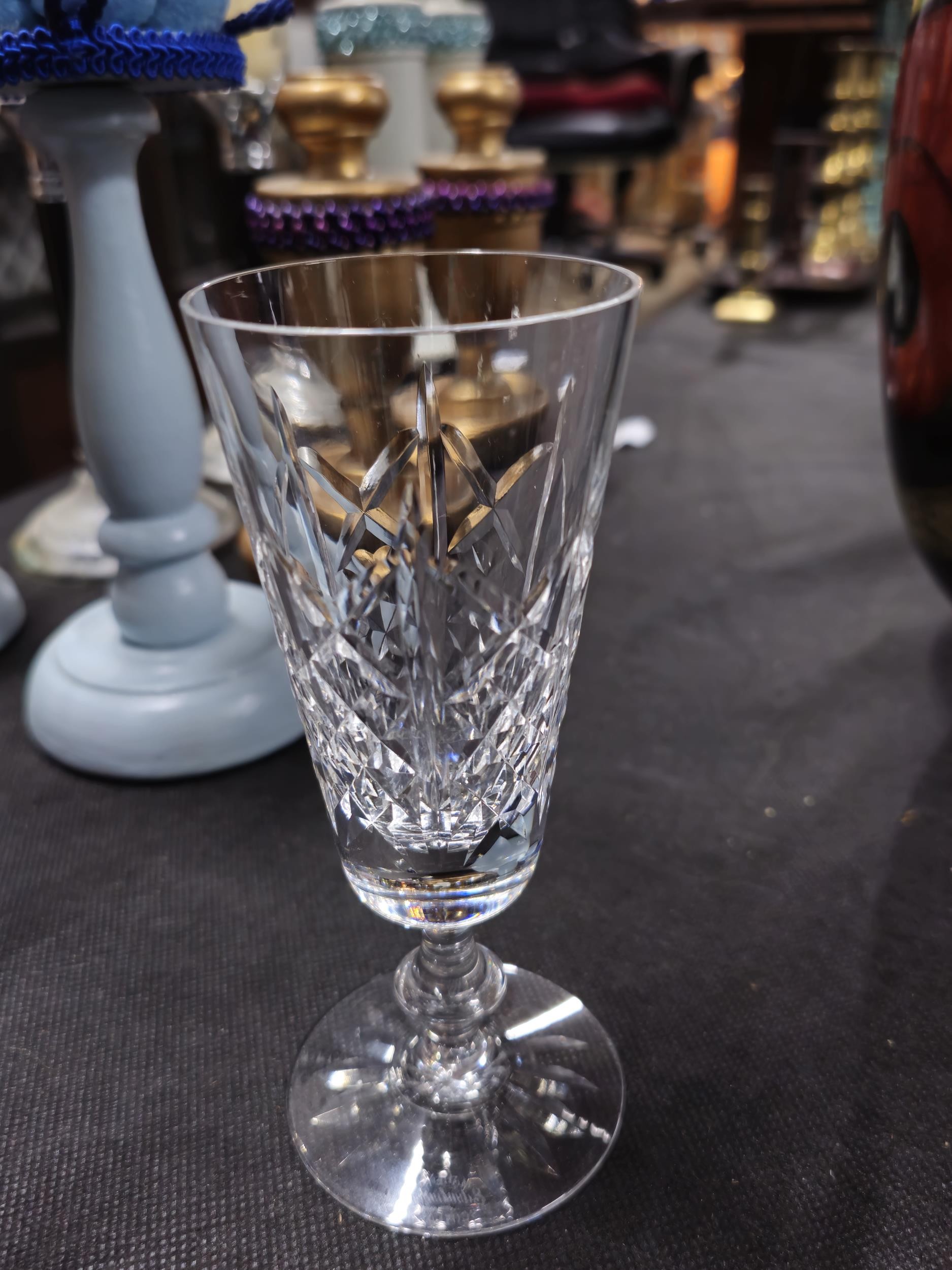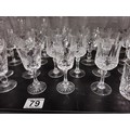 A large collection of assorted cut glass crystal drinking glasses to include a total of 58 glasses to include wine glasses, champagne glasses, sherry glasses and whiskey tumblers by various glass making brands to include Edinburgh Crystal, Stuart crystal and Tomas Webb glasses, all are in good order with varying designs