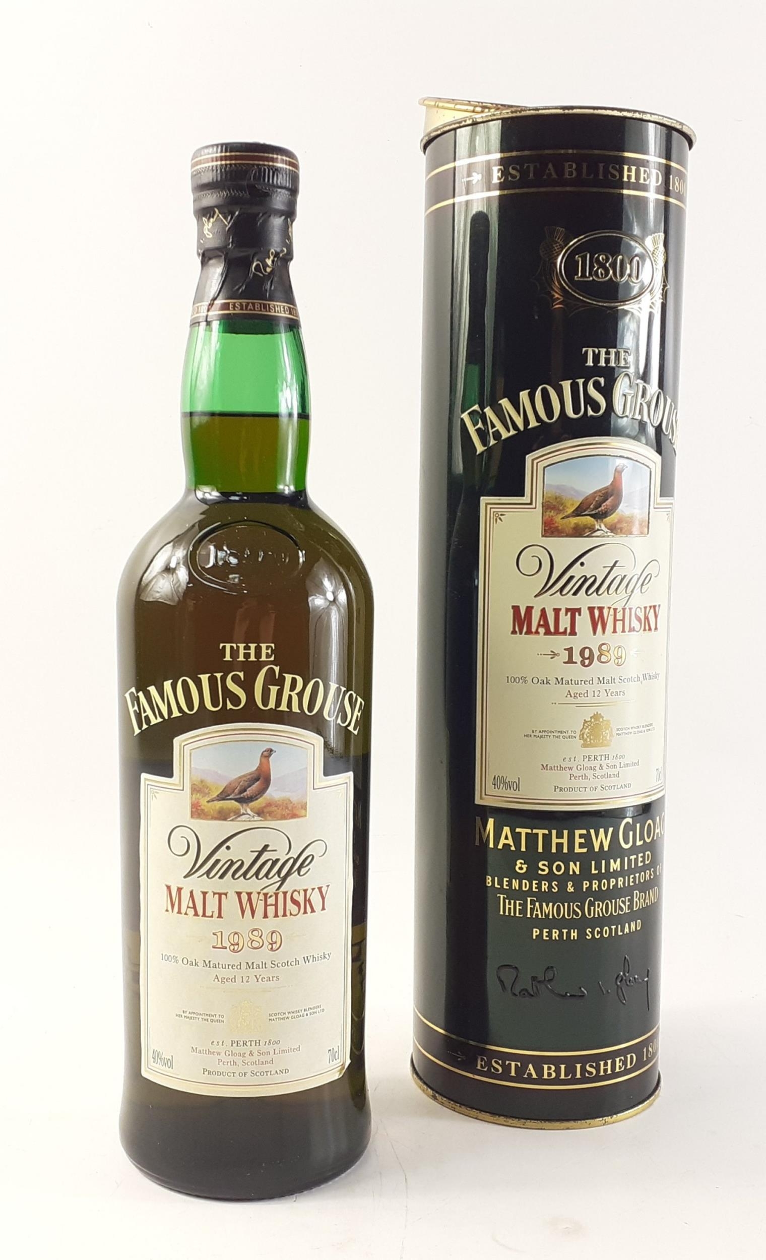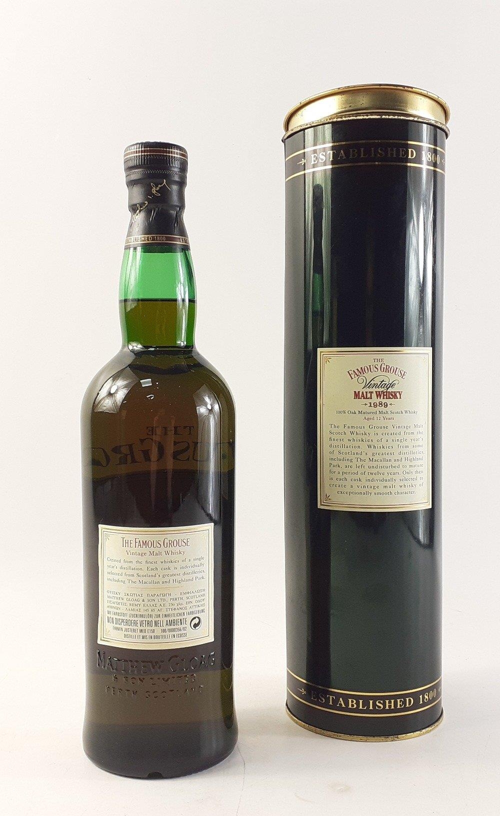 FAMOUS GROUSE Vintage Malt Whisky 1989 sealed bottle in tin.