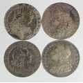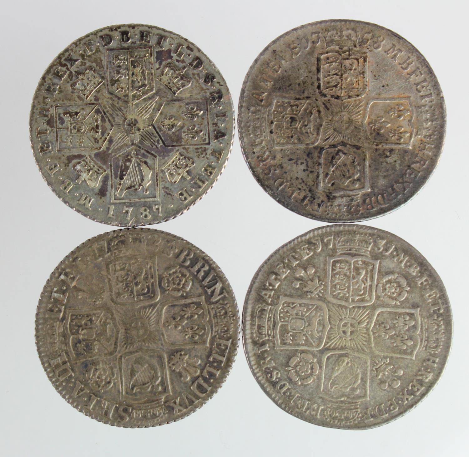 GB Shillings (4) early milled: 1721/0 roses & plumes, S.3645, nVF, 1731 roses & plumes, S.3698, VF, 1758 aVF, and 1787 no hearts, nVF