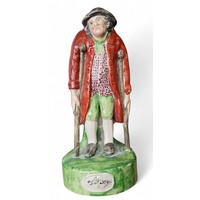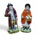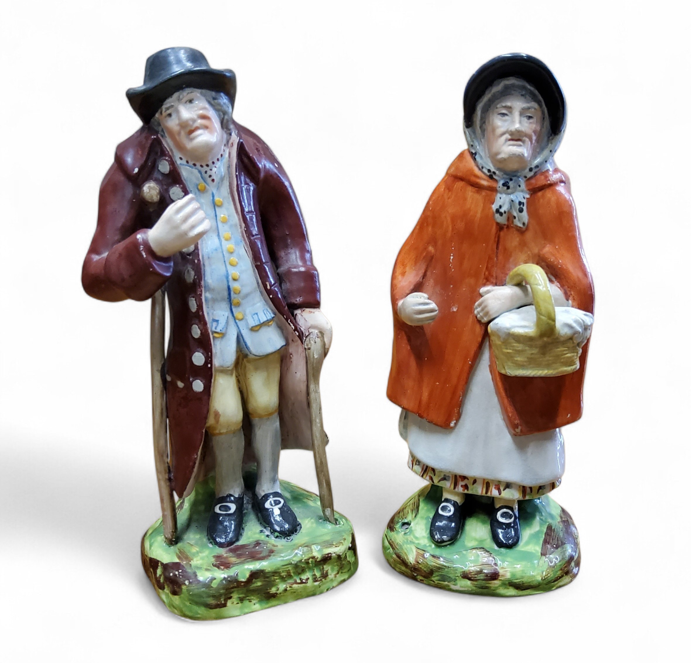 A pair of Staffordshire Pearlware figures, Old Age, modelled with two elderly figures, she with a basket, he with a walking stick, in colours, 17.5cm high, c.1840