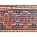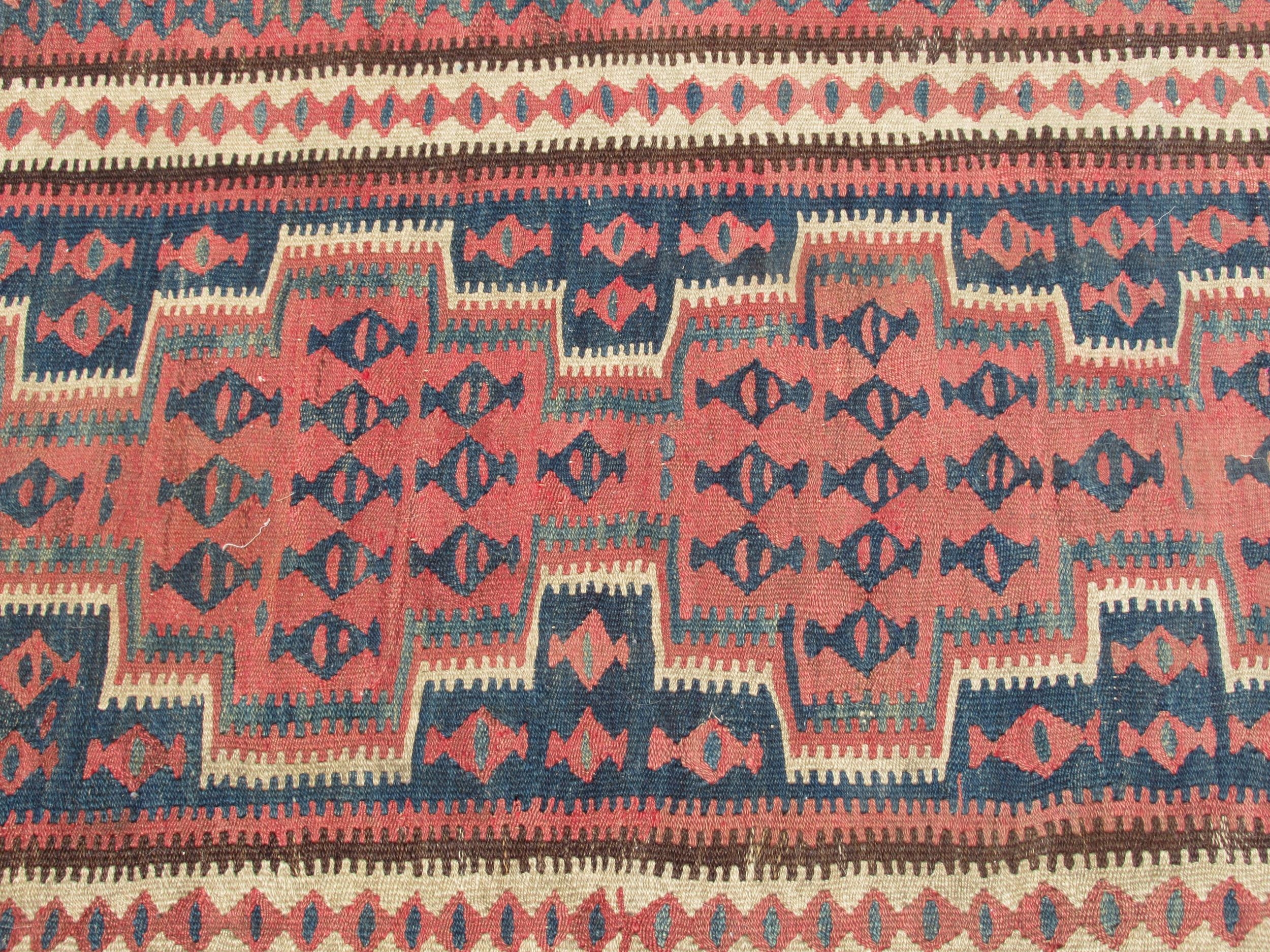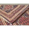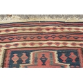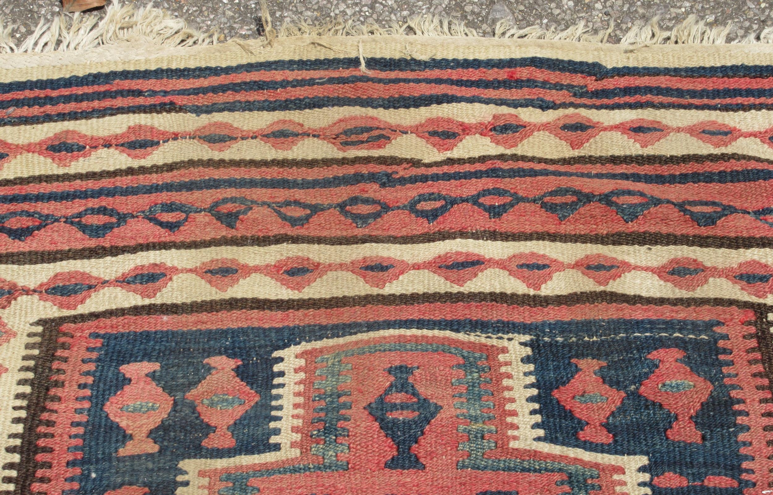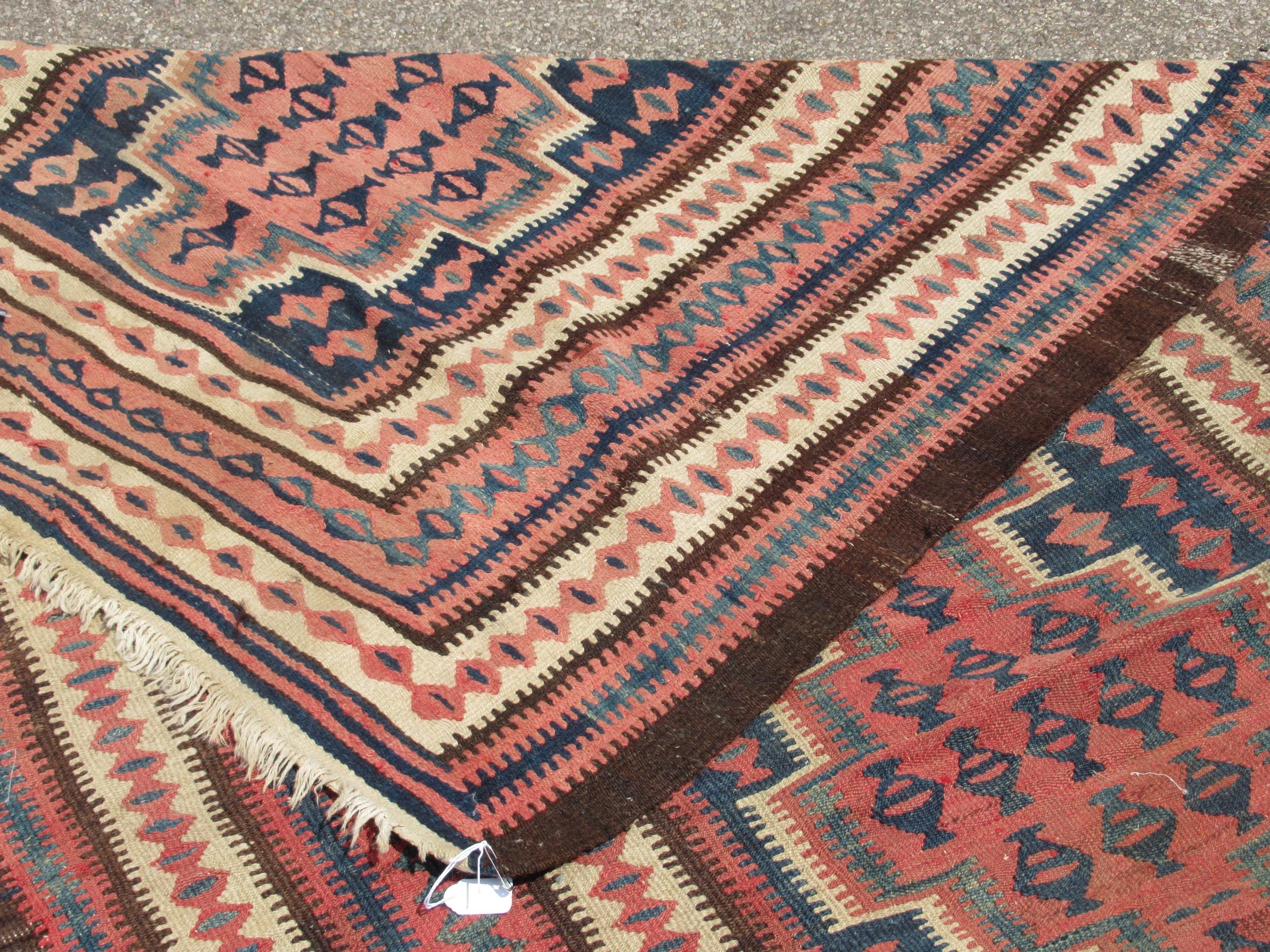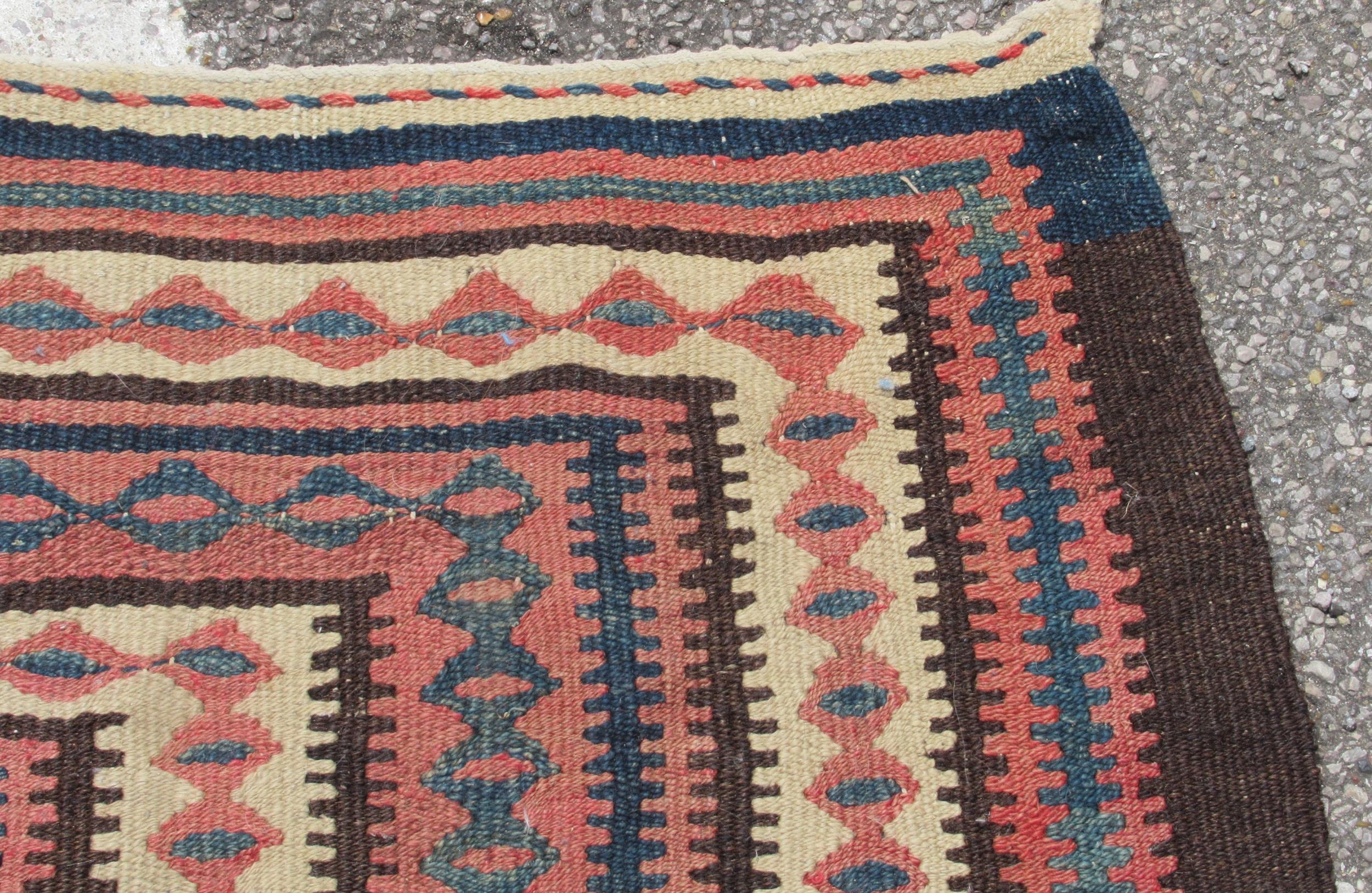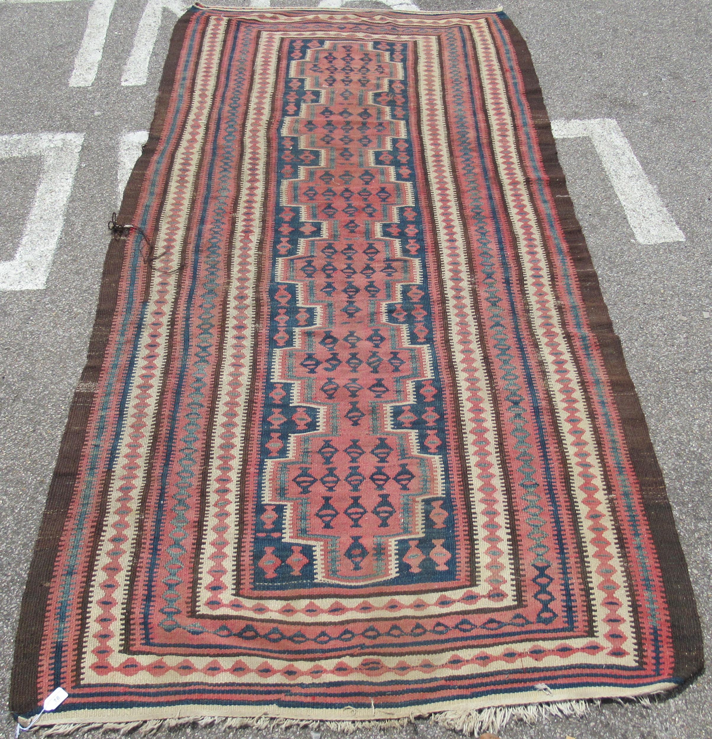 A Turkish Kelim rug, decorated with repeating geometric and other designs, on a brown ground 54" x 116"