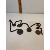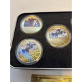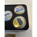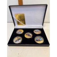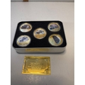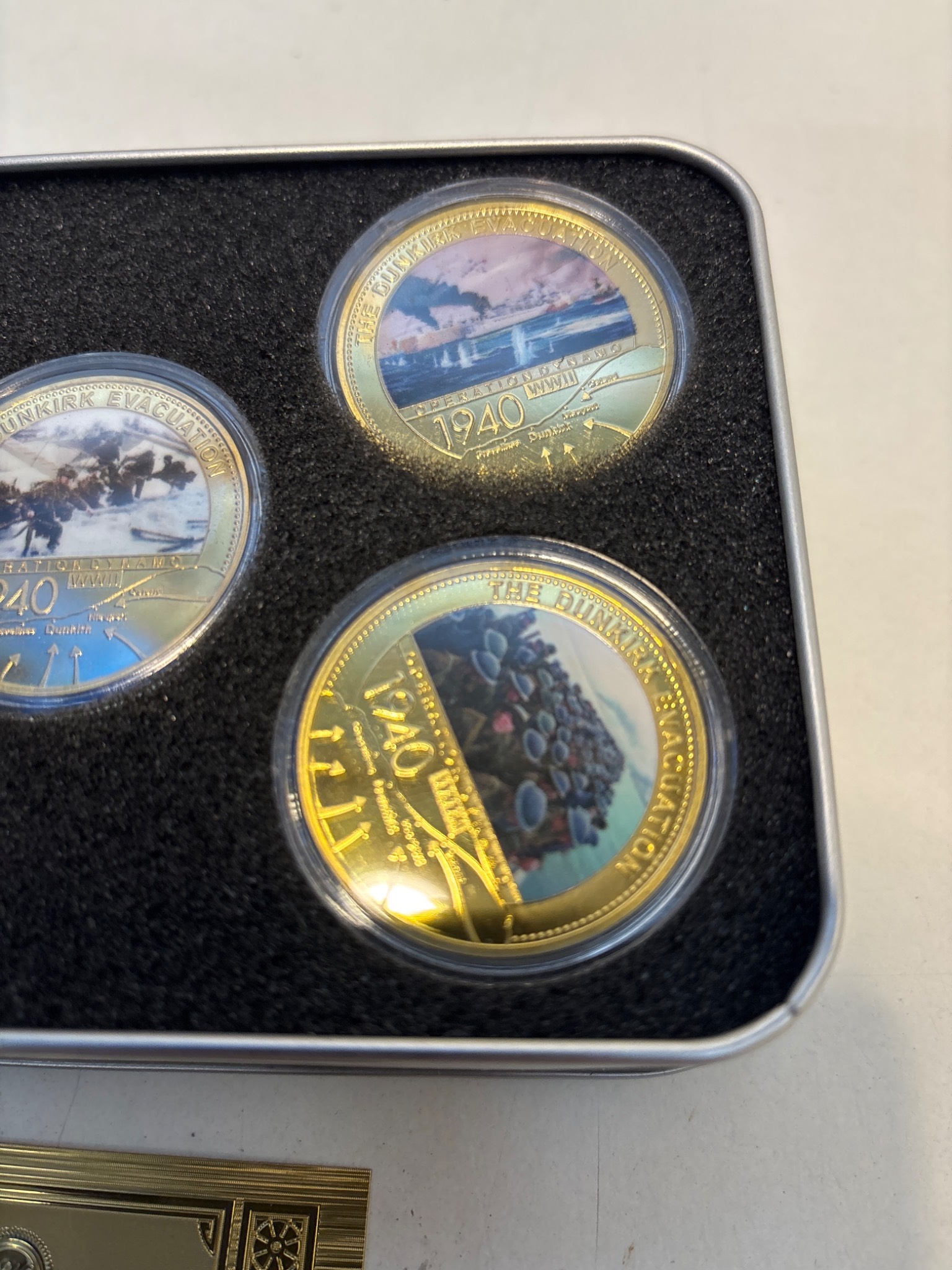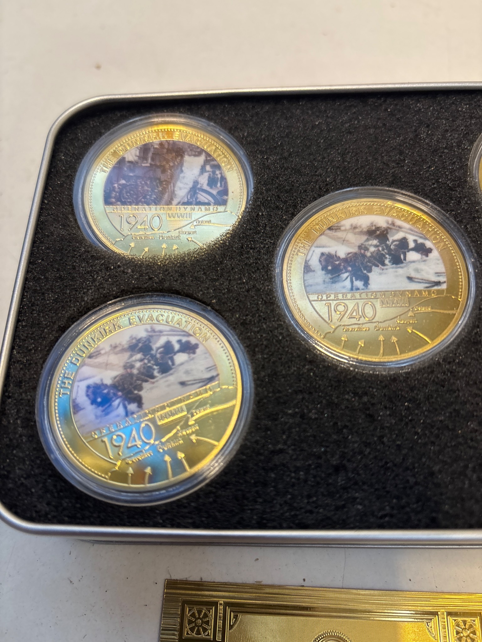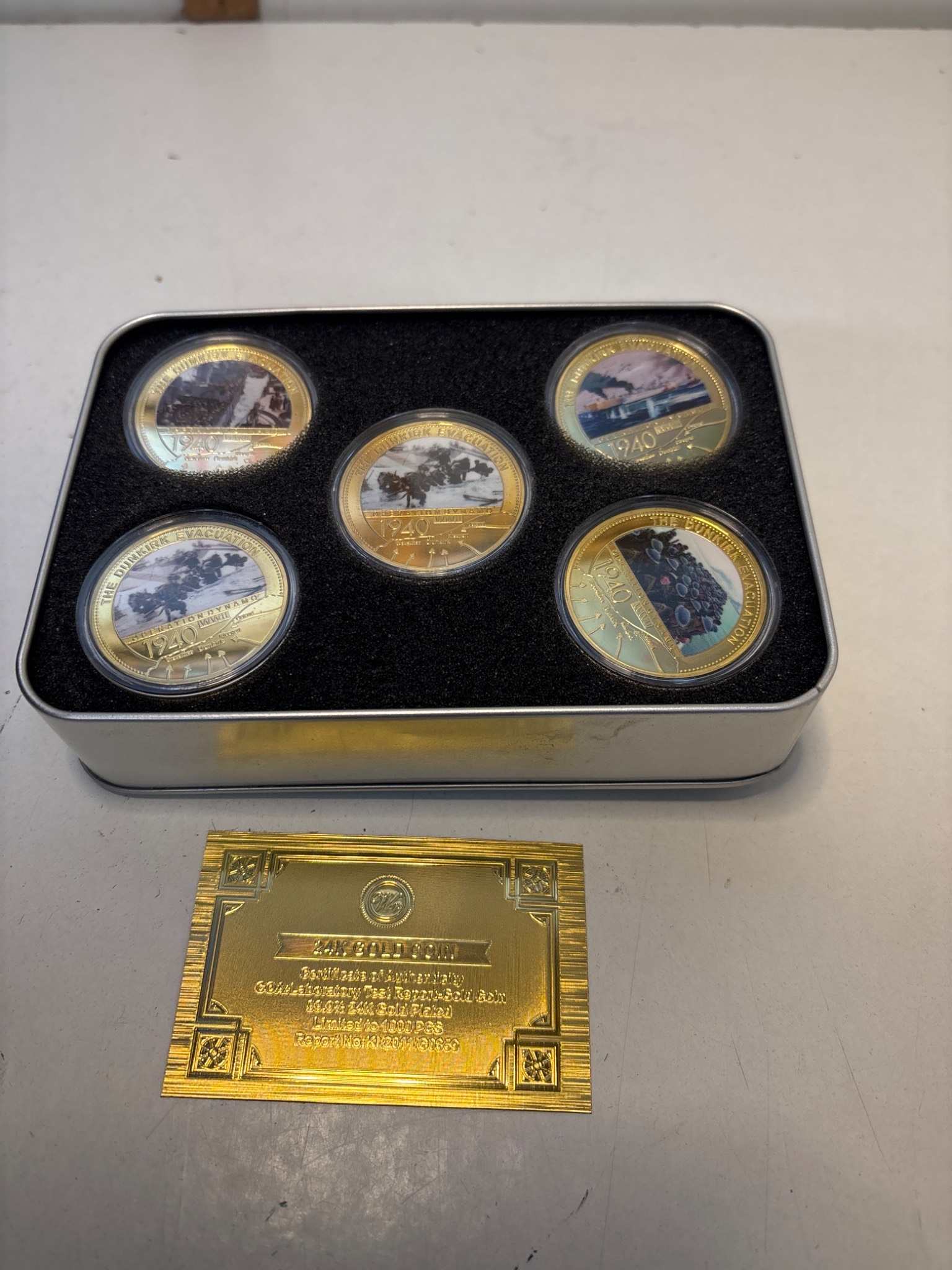Five commemorative gold-plated coins depicting scenes from 1940 with certificate, housed in a metal display case.