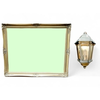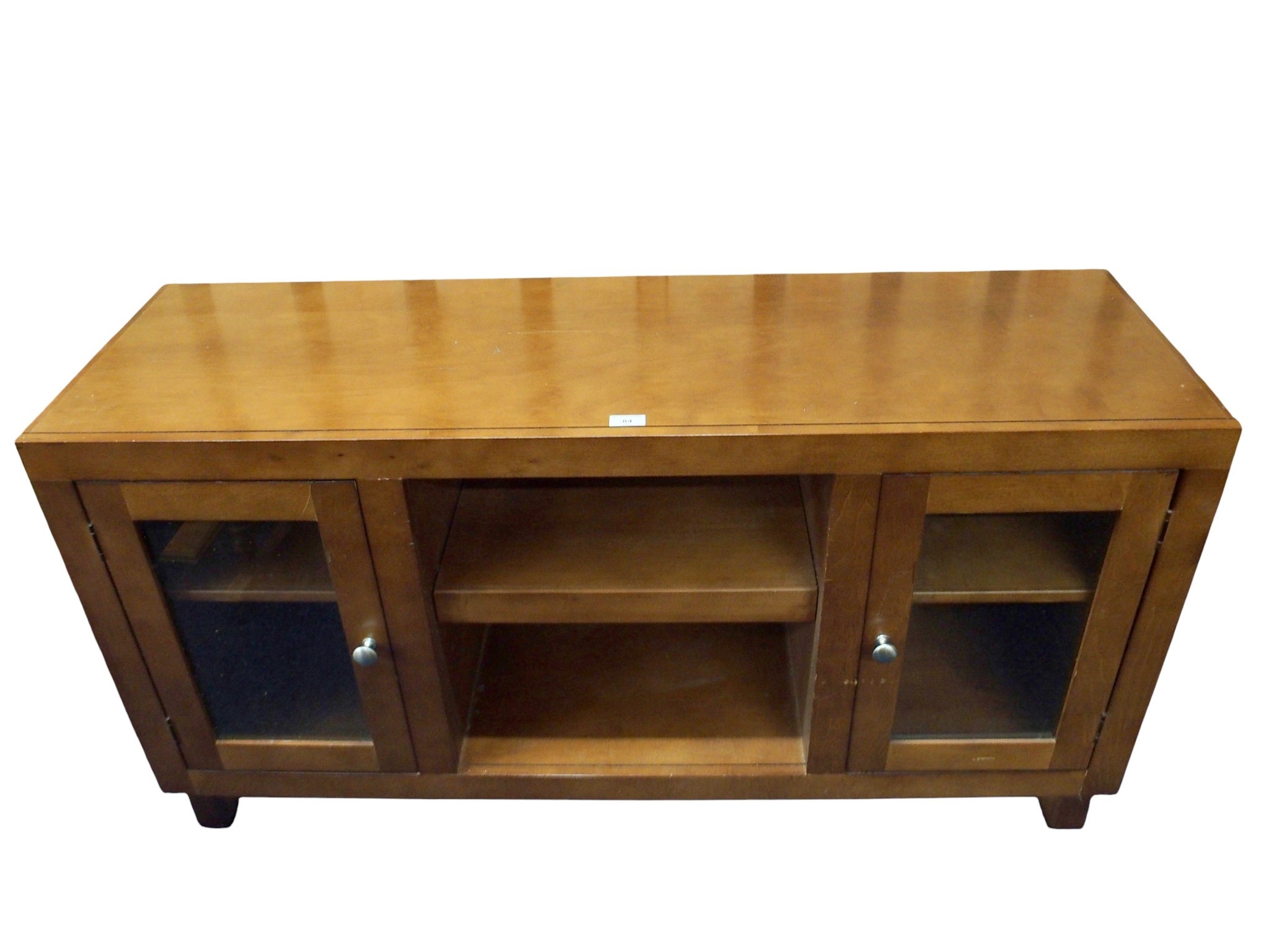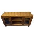 A contemporary media unit with central open compartment flanked by glazed doors on square supports, 69cm high x 133cm wide x 43cm deep