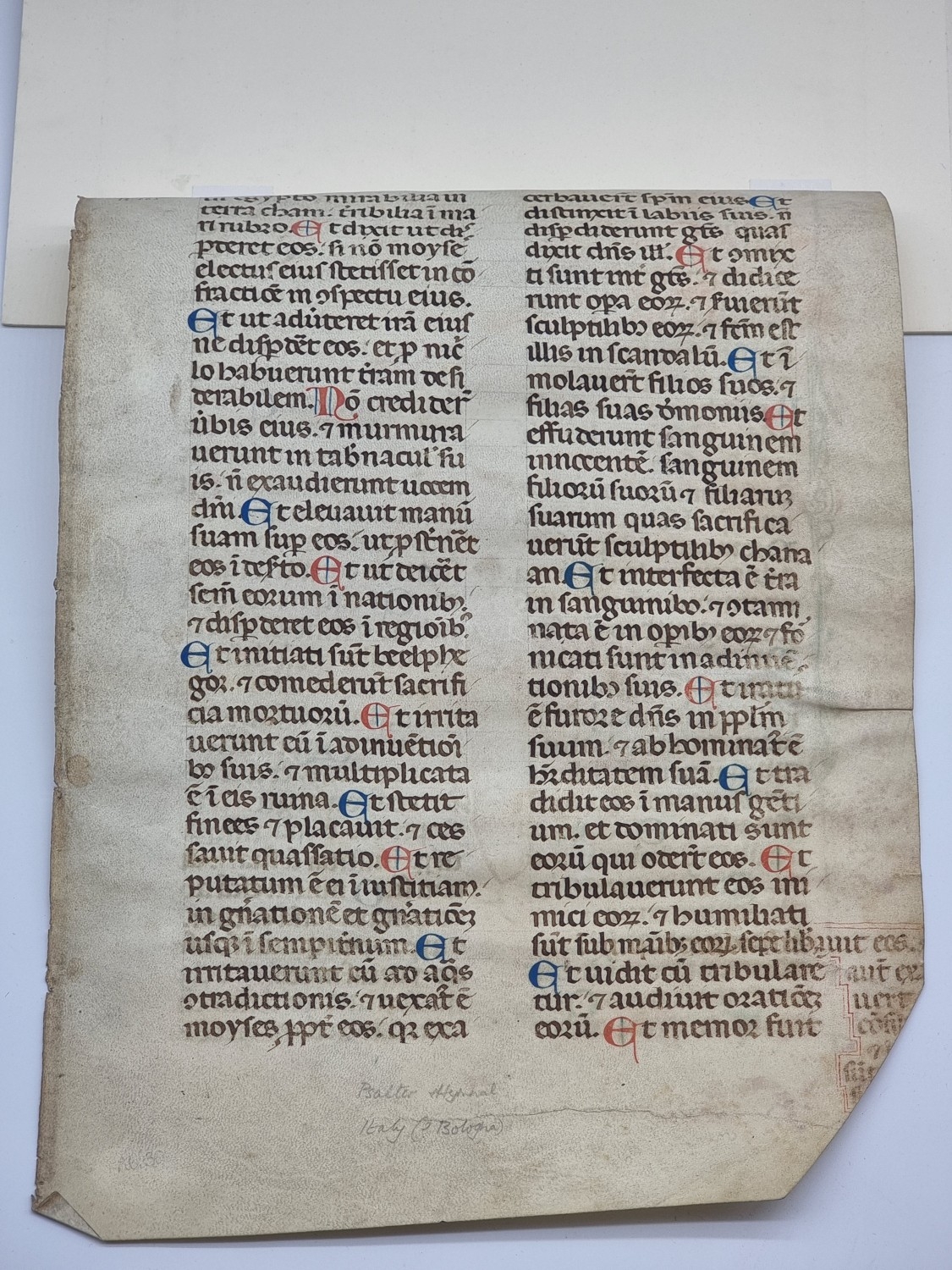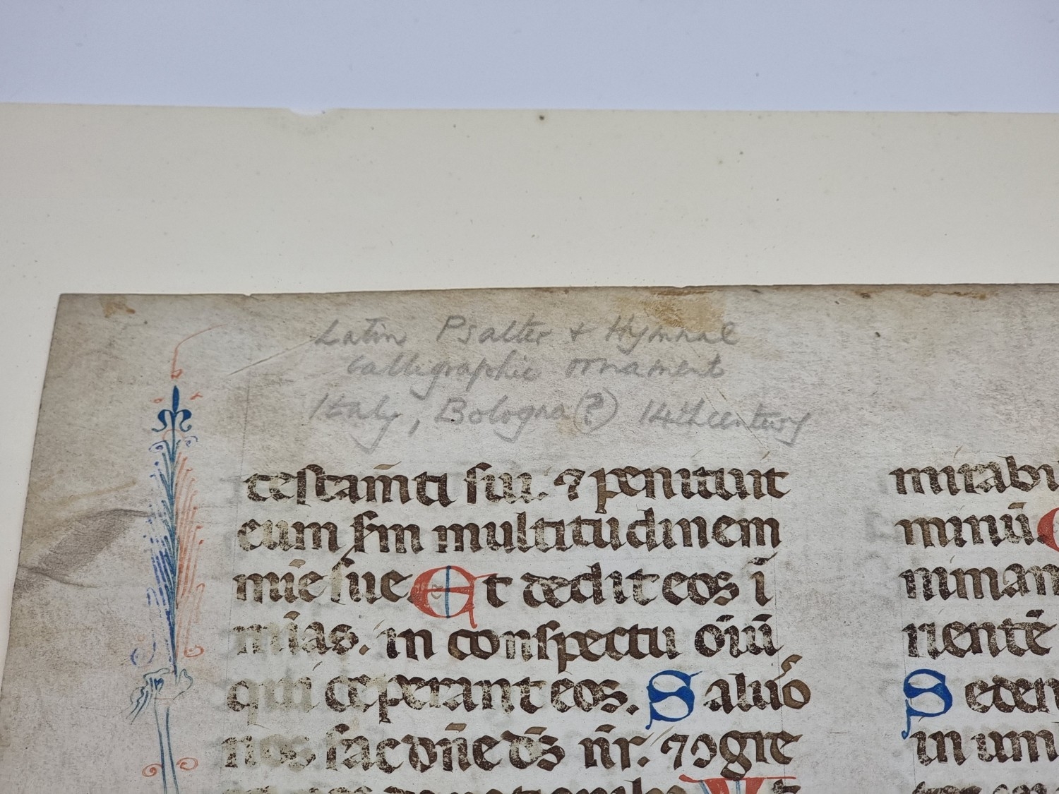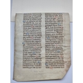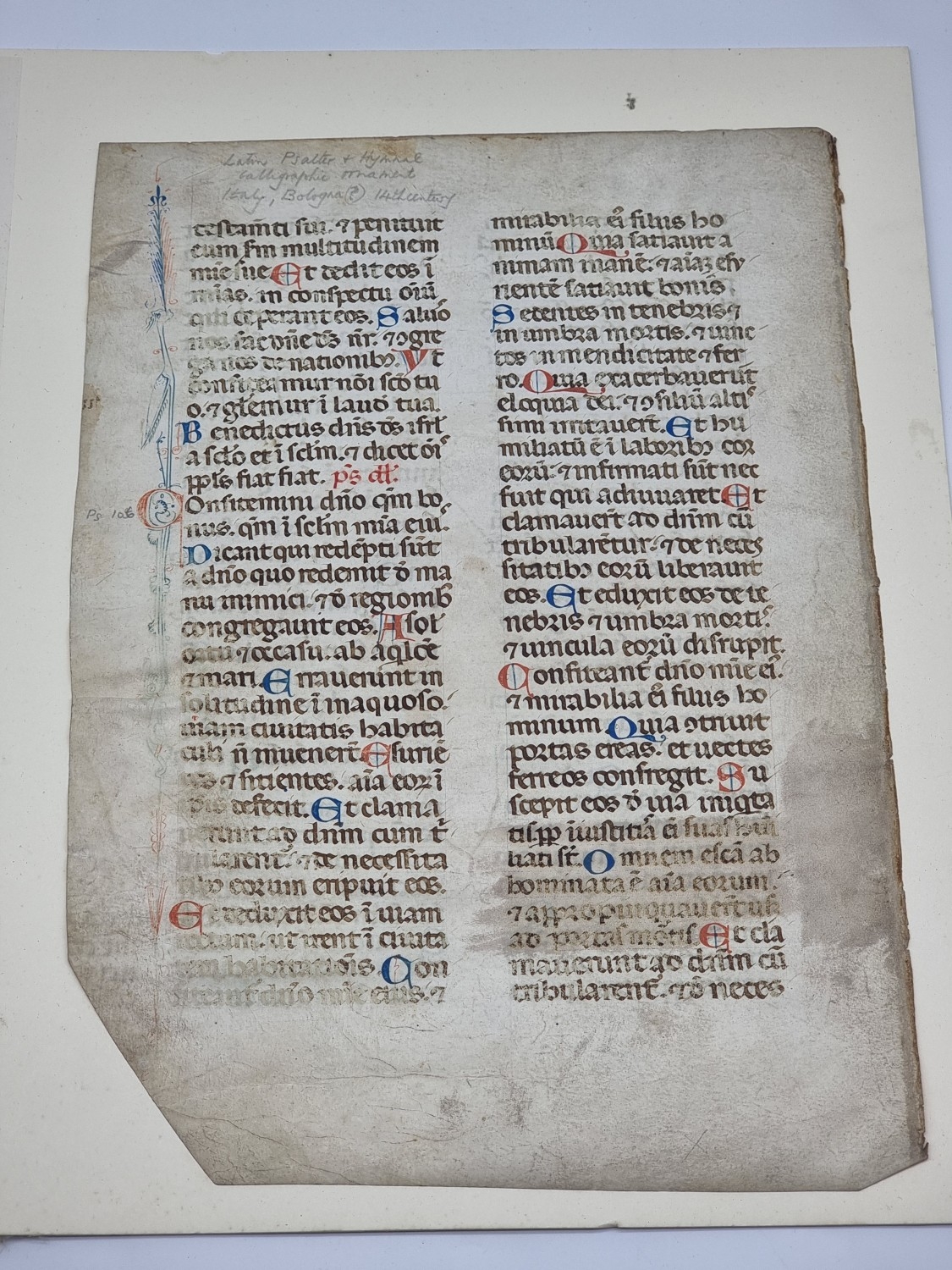 BOLOGNESE SCRIBE: single leaf on vellum from a liturgical psalter, Bologna, early 14th century: one full length marginal border to verso with calligraphic ornamentation, featuring a long narrow bird with grotesque head, numerous versal initials in red and blue, 32 lines of text in large rounded gothic script, in double column, leaf approx 33.5 x 23cm, some browning and fading. (1)