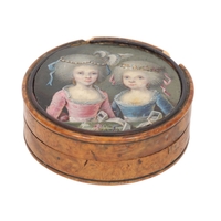 • Upper miniature: depicting a young female sitter shown bust-length, wearing a high-waisted dress of warm ochre tone with a white chemise front and a finely pleated ruff collar. Her hair is dressed high and encircled by a narrow jewelled band, consistent with early Empire fashion. The treatment of the face is delicate and idealised, with softly modelled flesh tones and restrained expression.