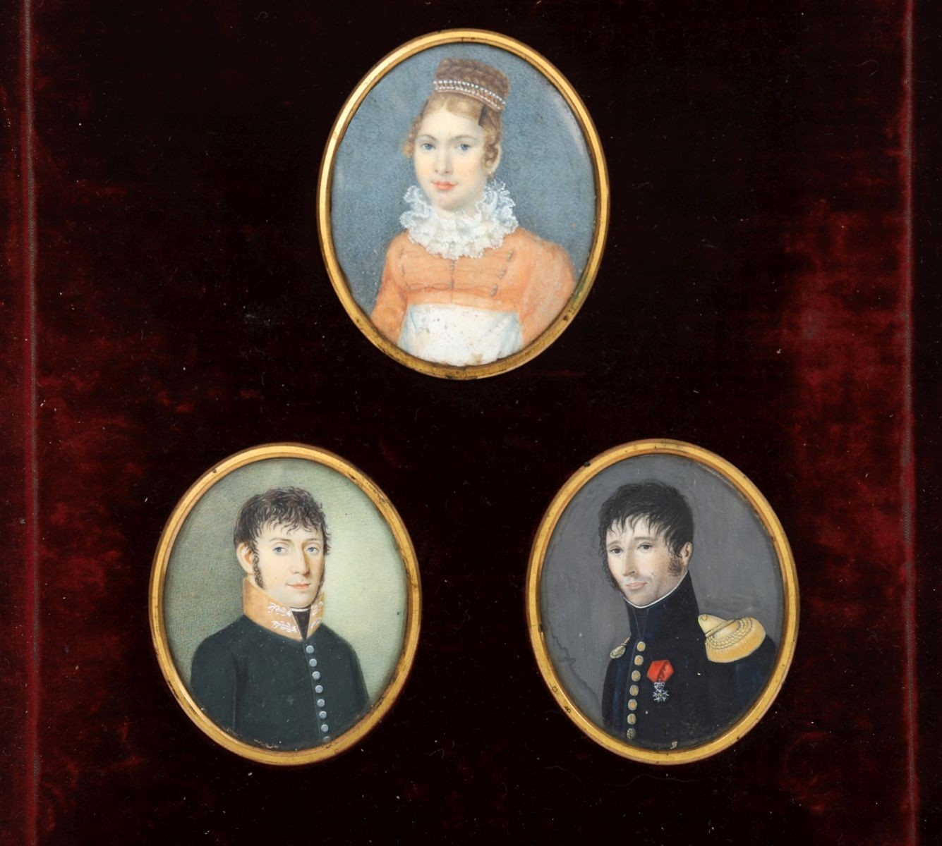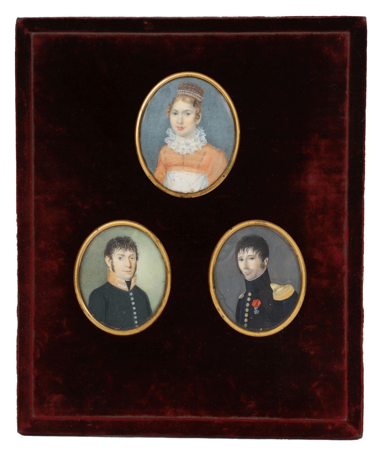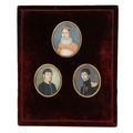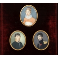 Comprising three oval portrait miniatures, each painted with fine attention to likeness and costume, and individually mounted in gilt frames, the three together presented on a crimson velvet-backed plaque.