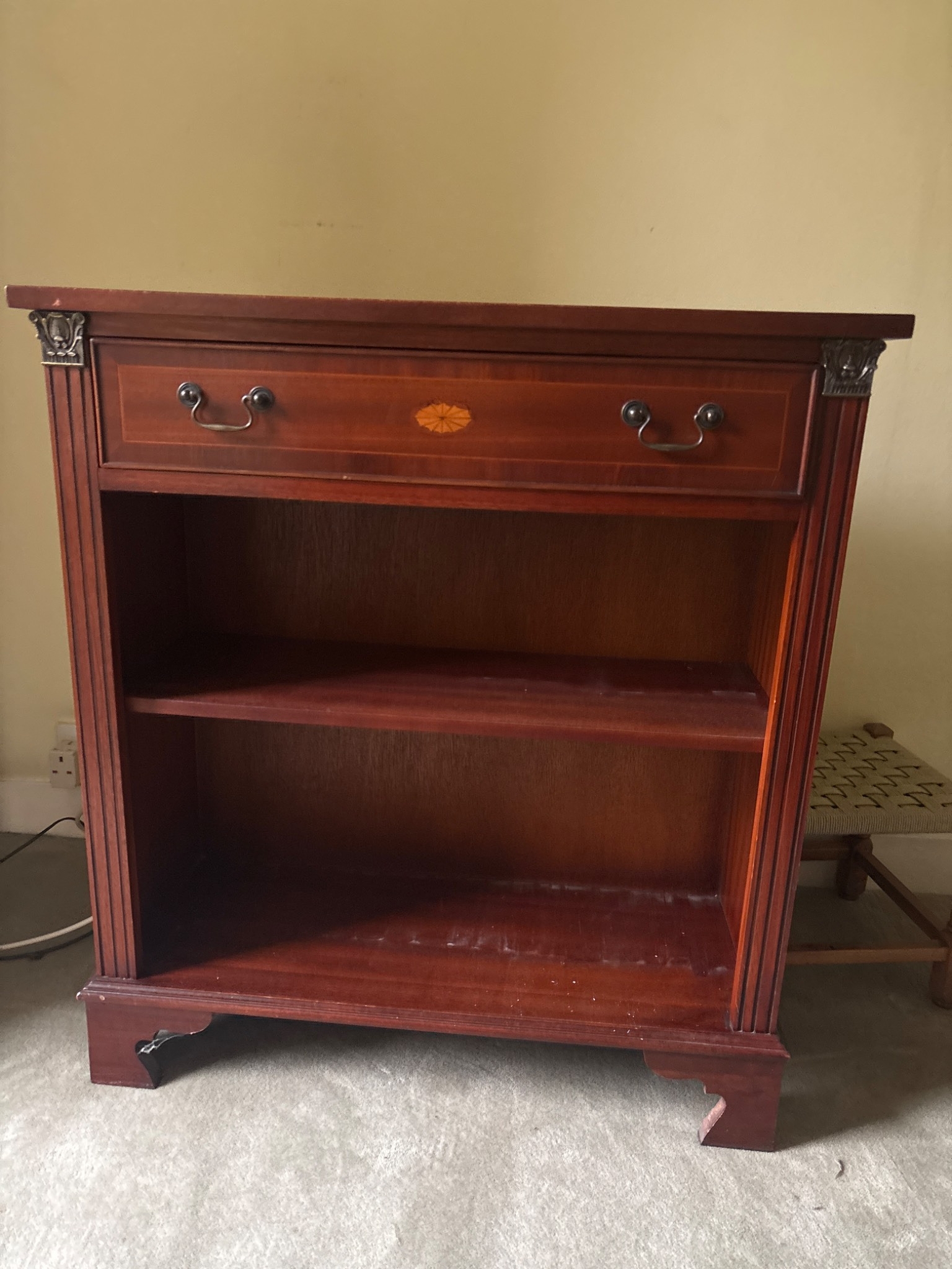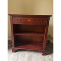 Wooden cabinet featuring one pull-out drawer with two metal handles and two open shelves below.