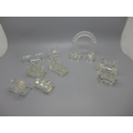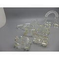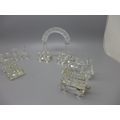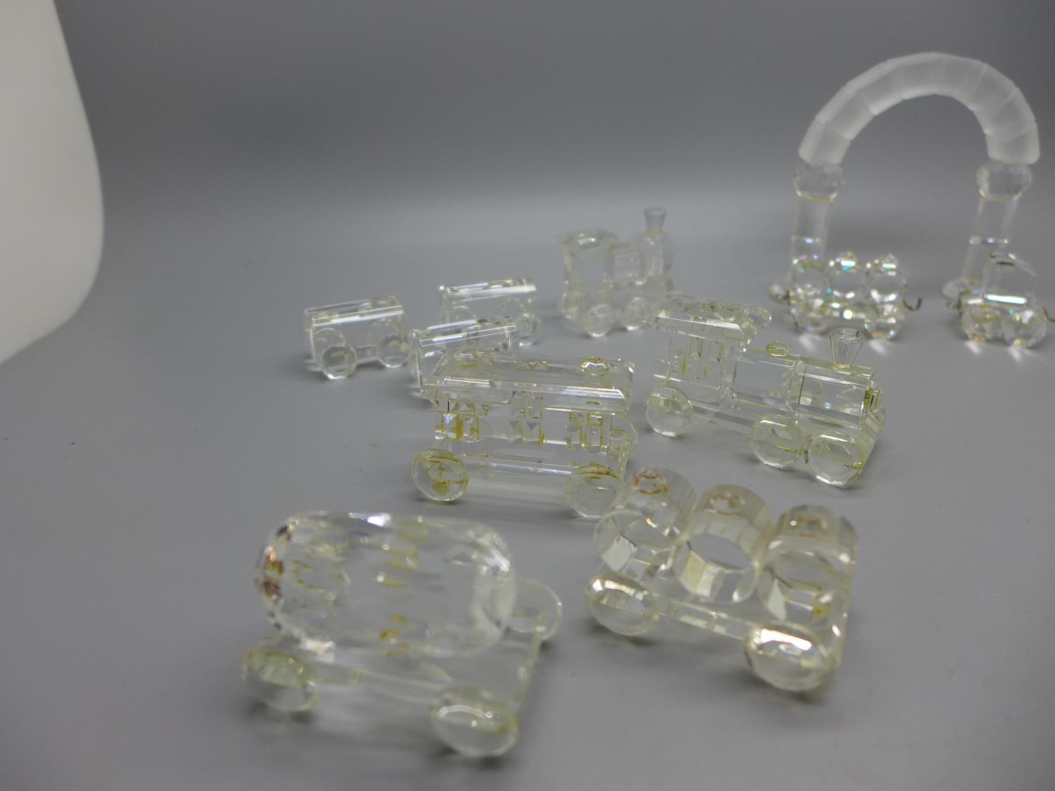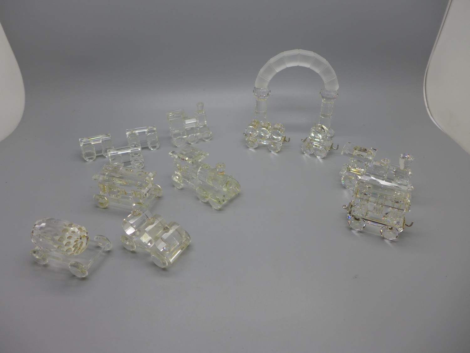 A Swarovski crystal model train with arch and other glass model trains, with two stands