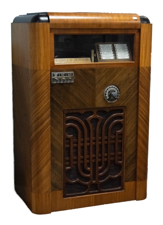GABEL'S JUNIOR STREAMLINE JUKEBOX, in Art Deco walnut wood case, made by Aumatic Machines, (c/r working; operated with American coins for one, two or five plays, 5 cents - 10 cent and 25 cent coins supplied)