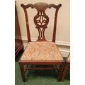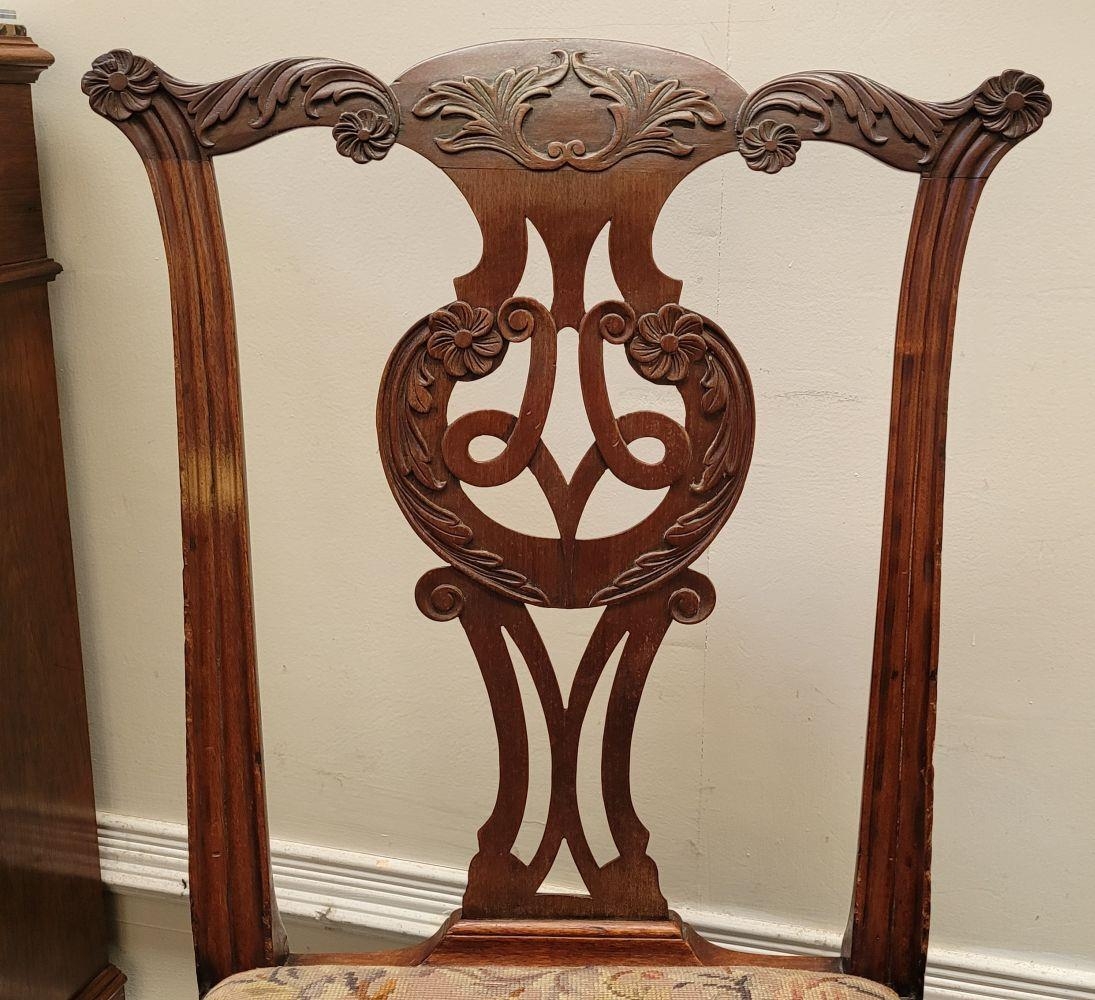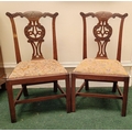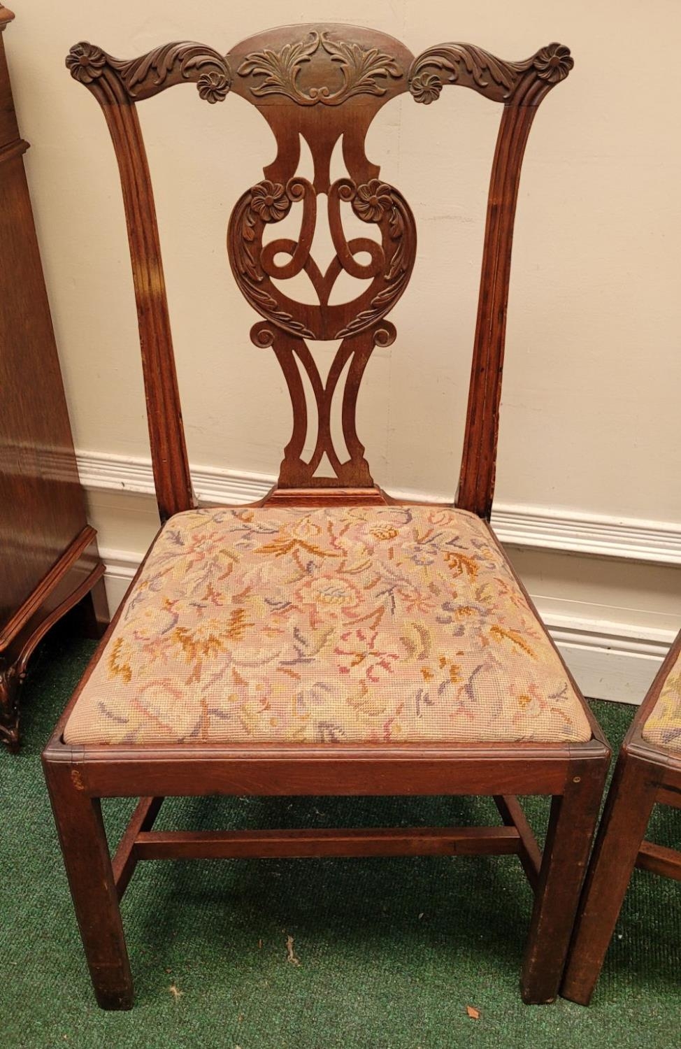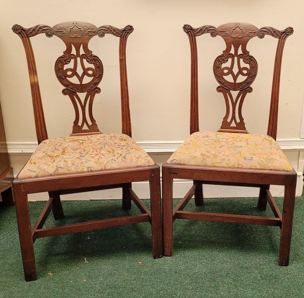 A PAIR OF IRISH GEORGIAN MAHOGANY CHAIRS, each with scrolling floral carved shoulders with pierced and carved splat back supports, lift out embroidered seats are raised on square leg united by a H stretcher. Condition: over all good condition, old fix to the underside of one as photographed. Dimensions: 96 x 55 x 45cm (H x W x D) 44cm height to seat.