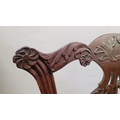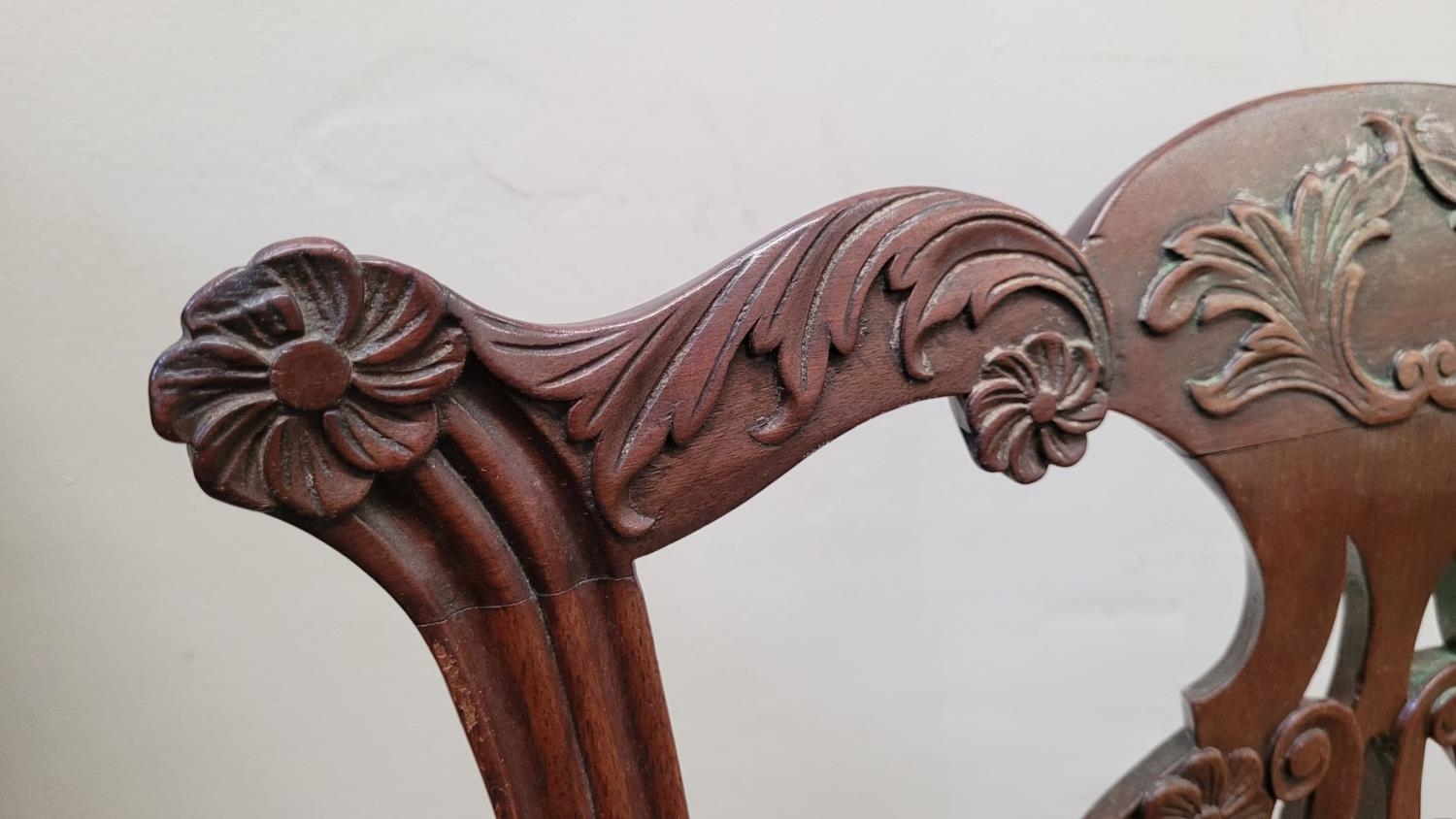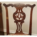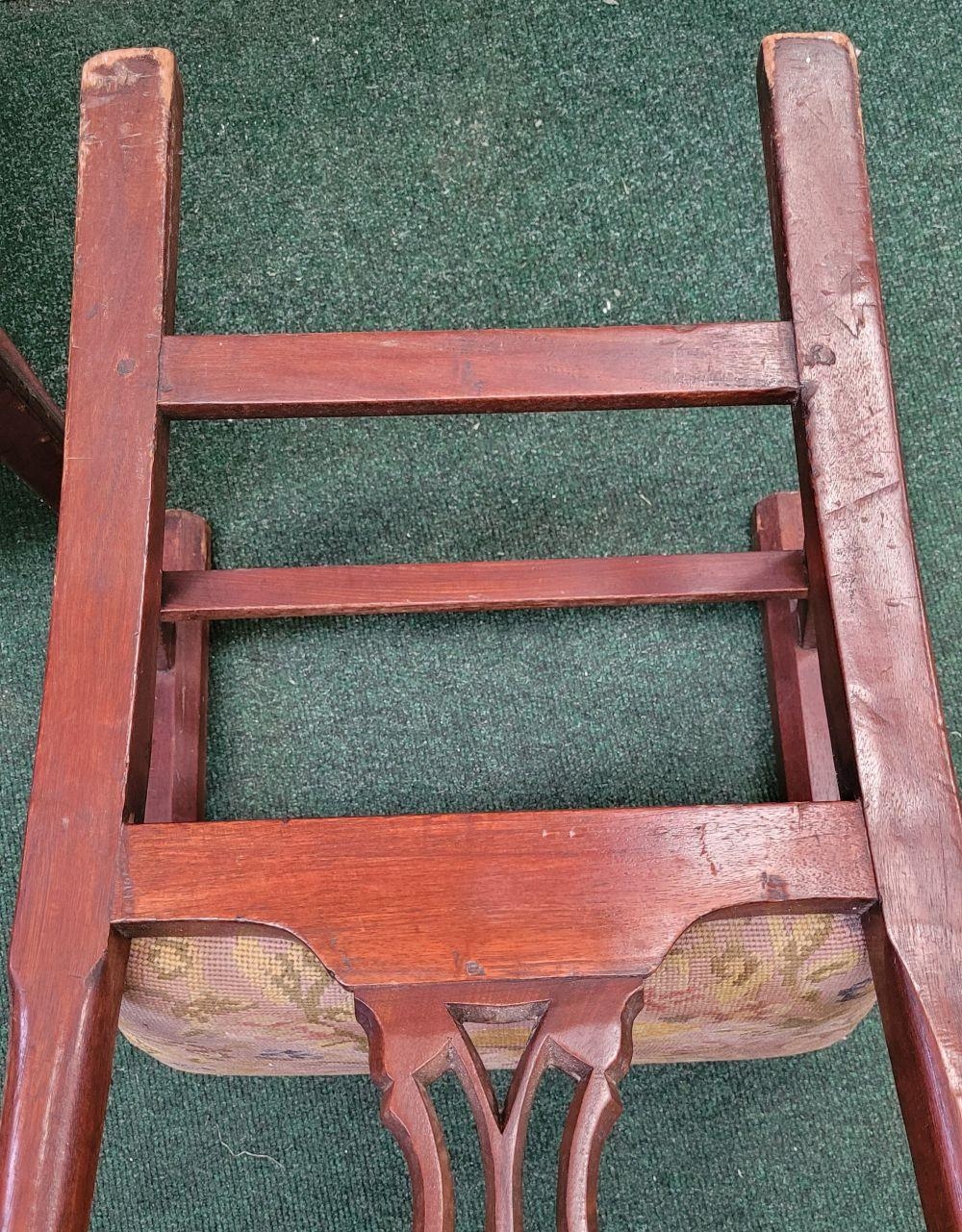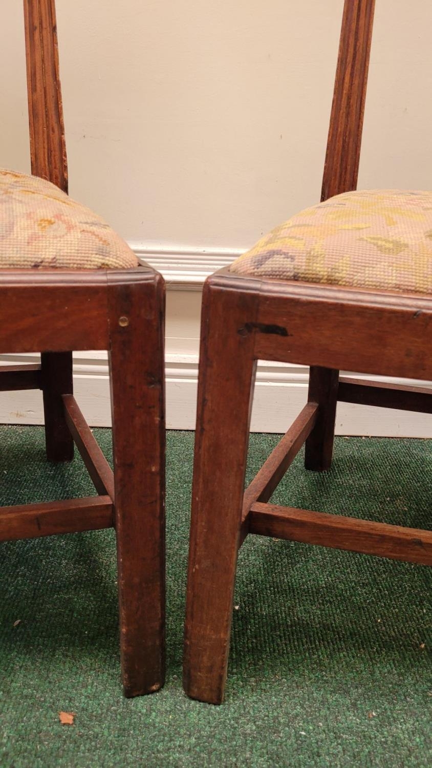 A PAIR OF IRISH GEORGIAN MAHOGANY CHAIRS, each with scrolling floral carved shoulders with pierced and carved splat back supports, lift out embroidered seats are raised on square leg united by a H stretcher. Condition: over all good condition, old fix to the underside of one as photographed. Dimensions: 96 x 55 x 45cm (H x W x D) 44cm height to seat.