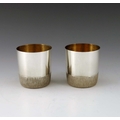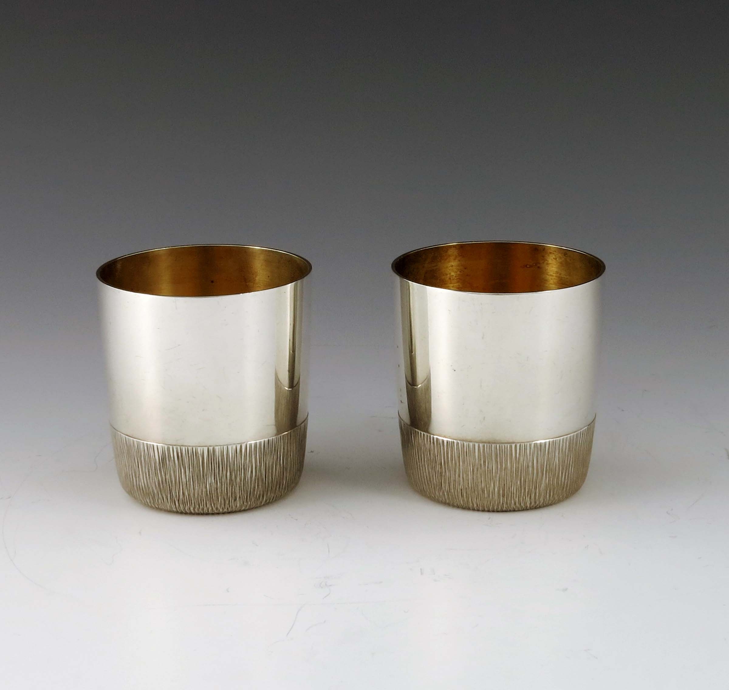 Gerald Benney, a pair of Modernist silver beakers, London 1984, bowed cylindrical form with bark textured band to the lower section, gilt interiors, in fitted box, 7cm high, 7.26ozt (2)