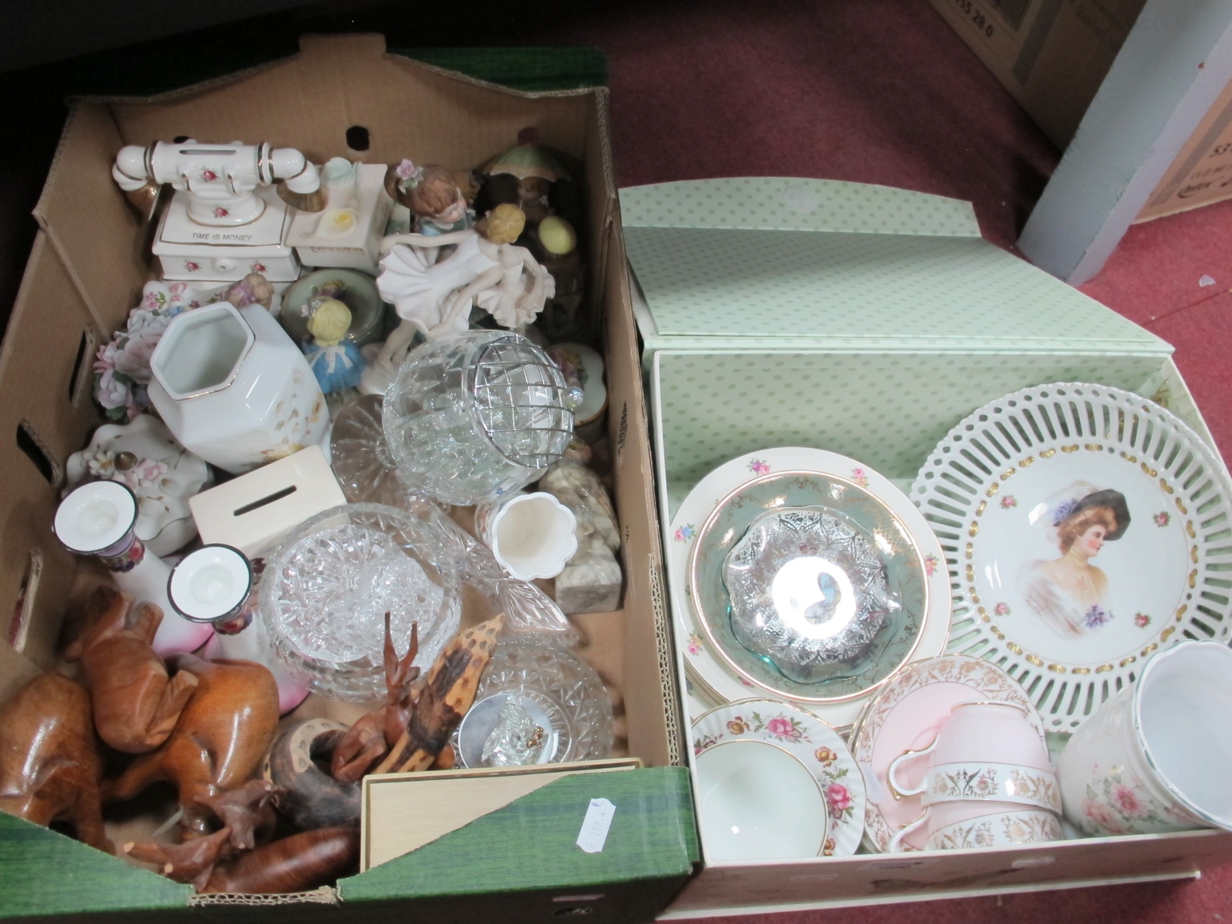 China and Wooden Ornaments, cut glassware, clock, continental pierced china bowl, other pottery:- Two Boxes