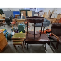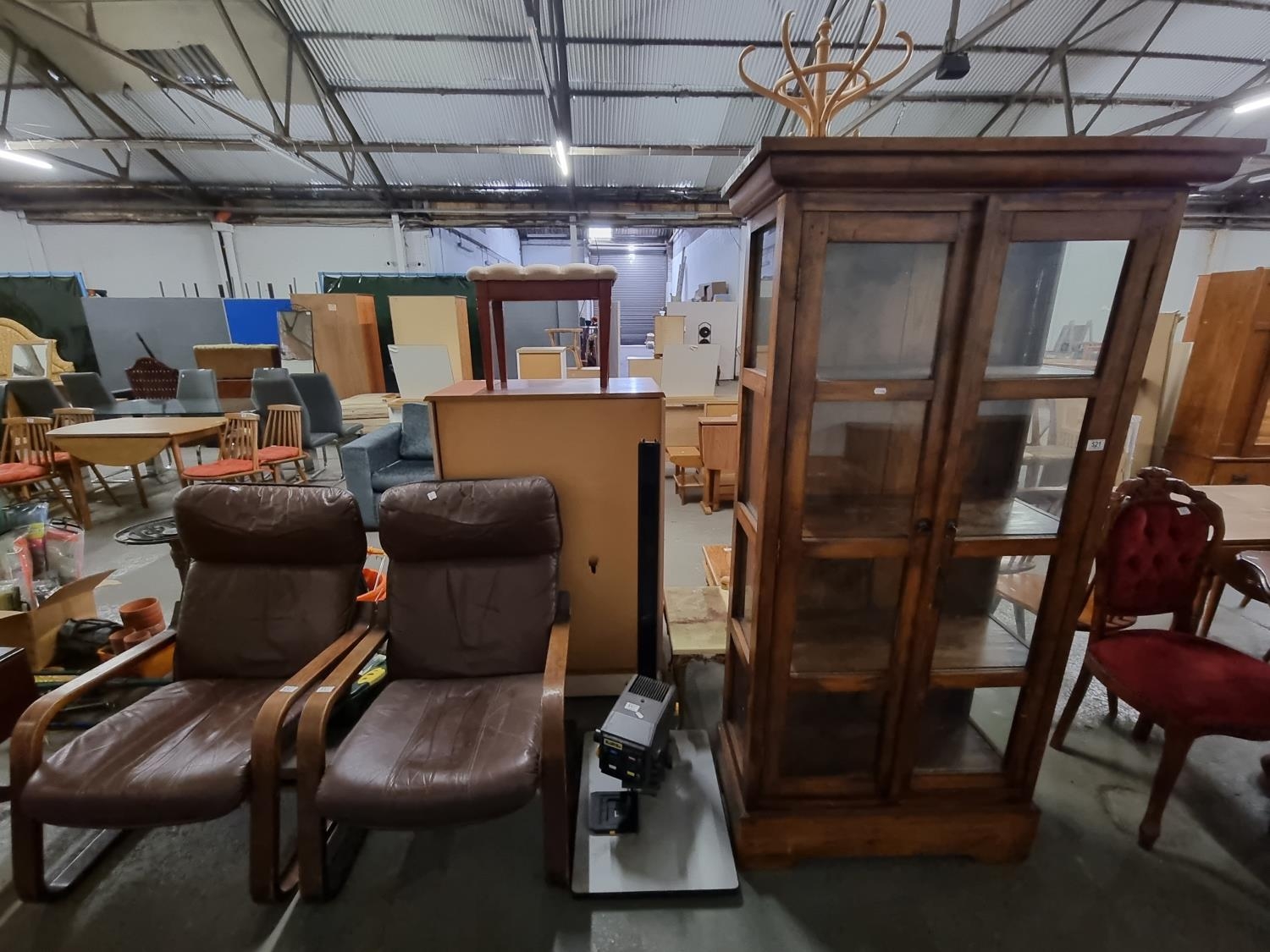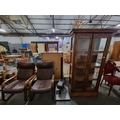 An oak display cabinet, photo enlarger, 2 leatherette chairs, etc