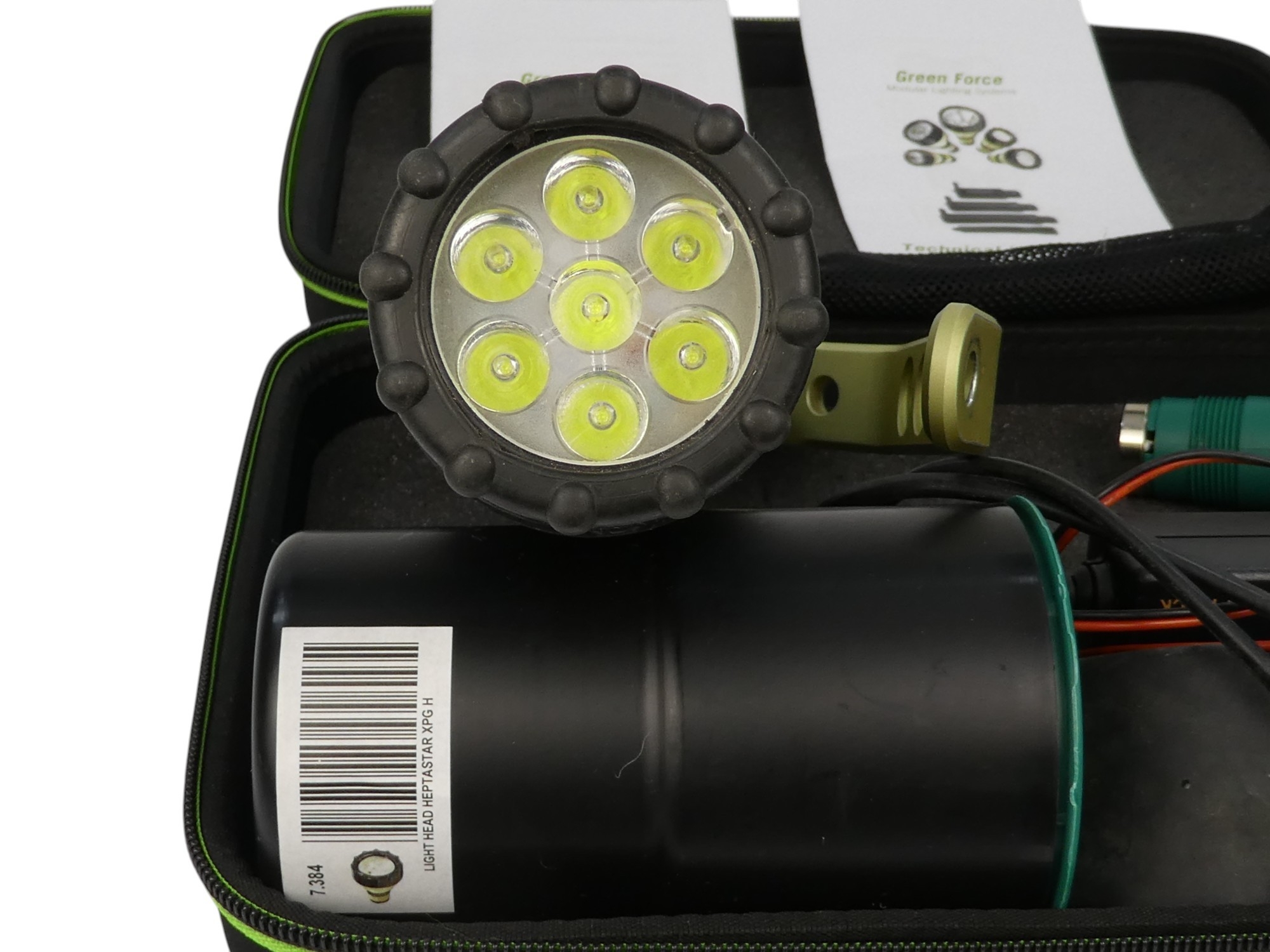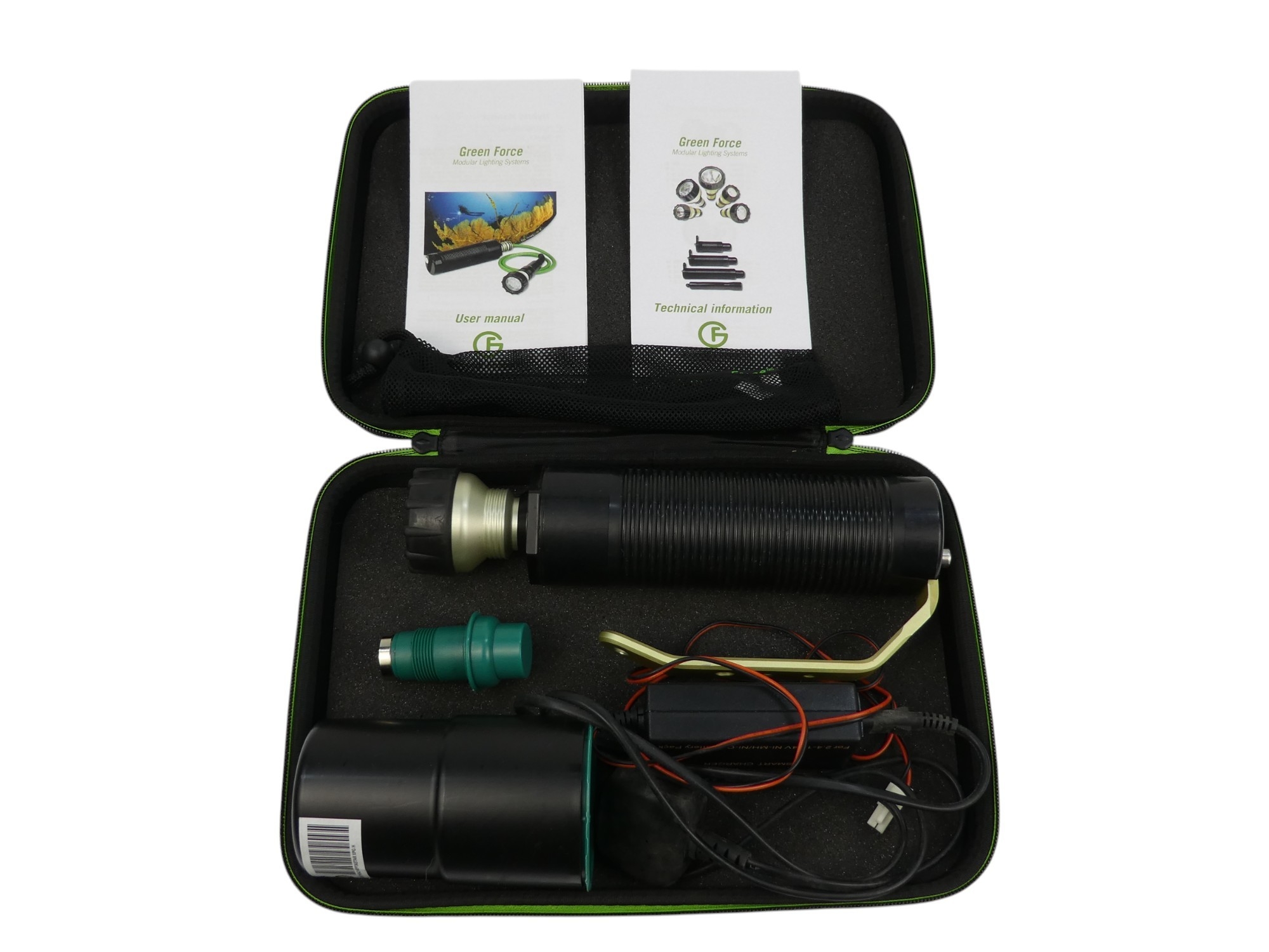 A Green Force modular waterproof diver's torch - with user manual and technical information manual, in branded case.