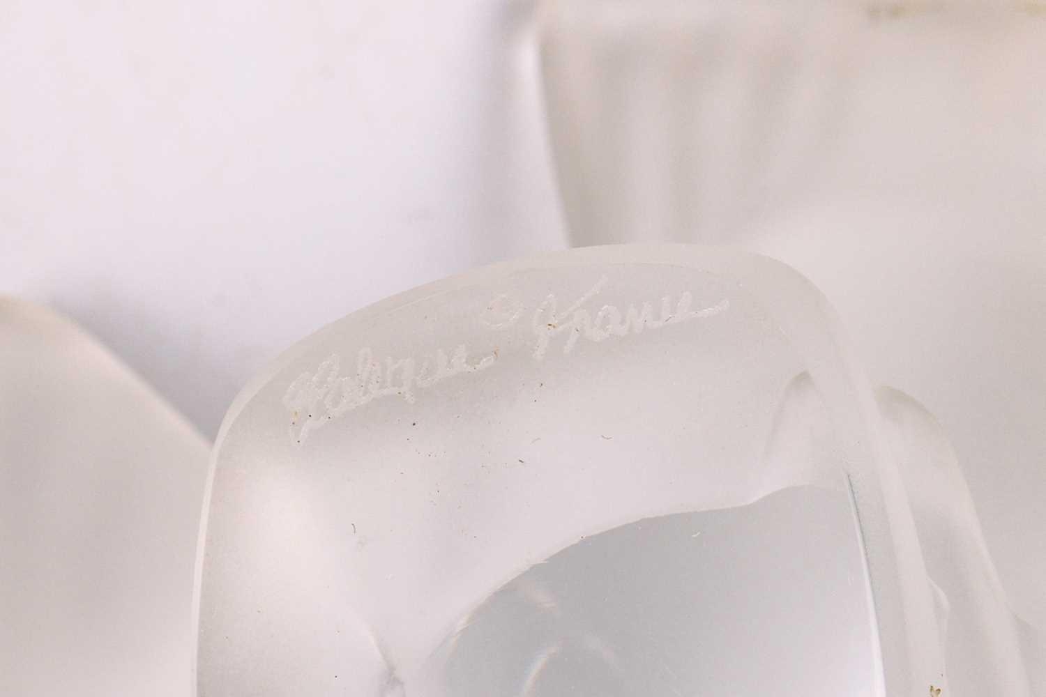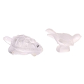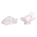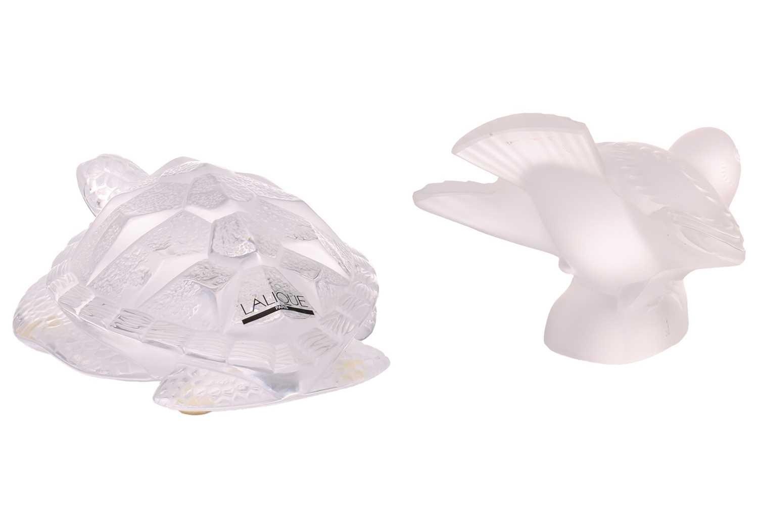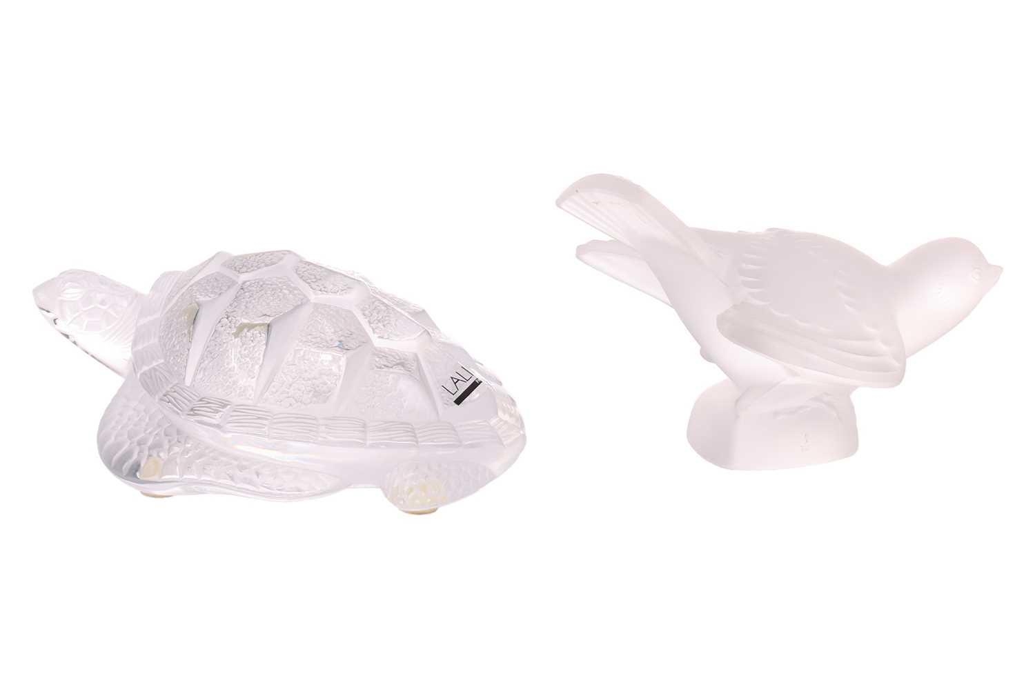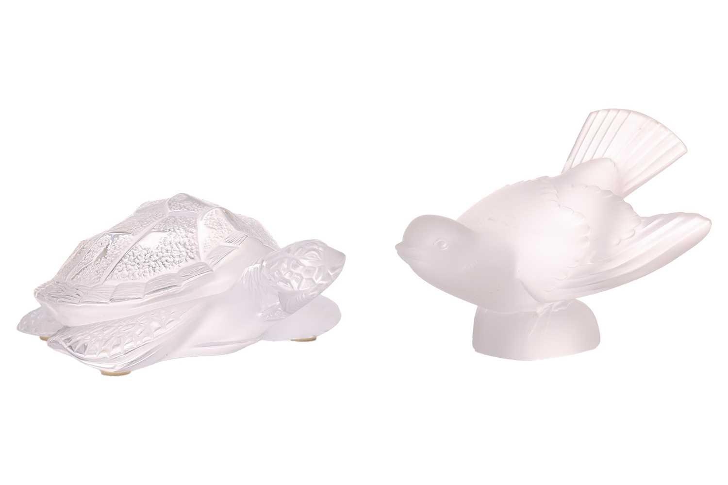 A contemporary Lalique frosted glass model of a tortoise, 14 cm wide, together with a similar frosted glass model of a bird, 13 cm wide, each with their original box. Qty: (2)