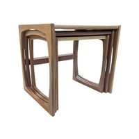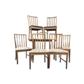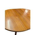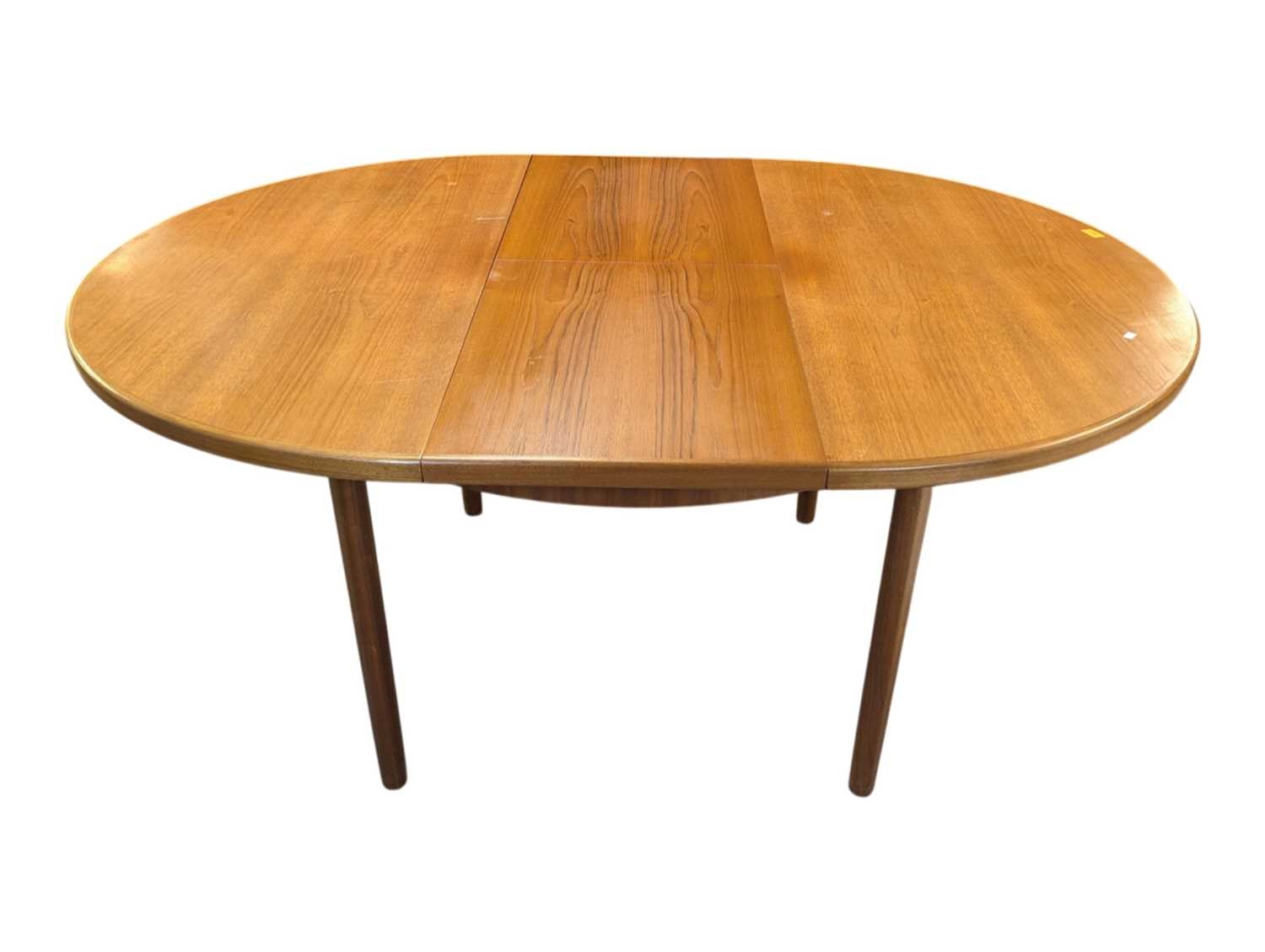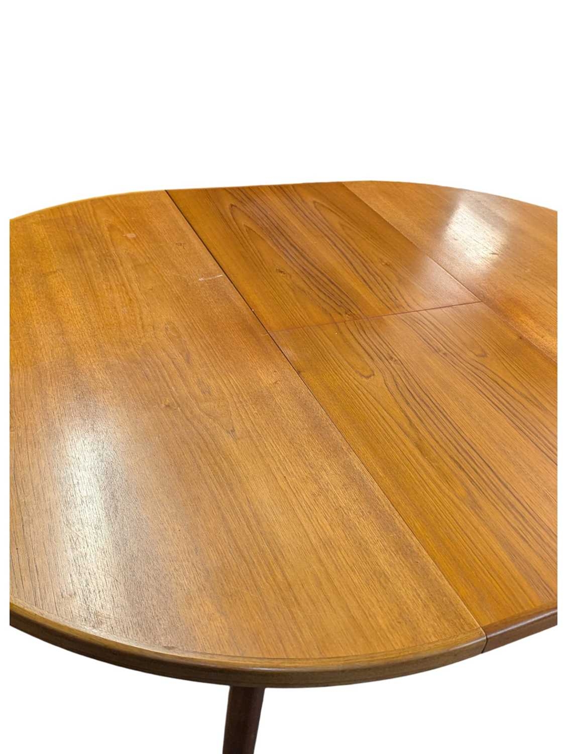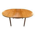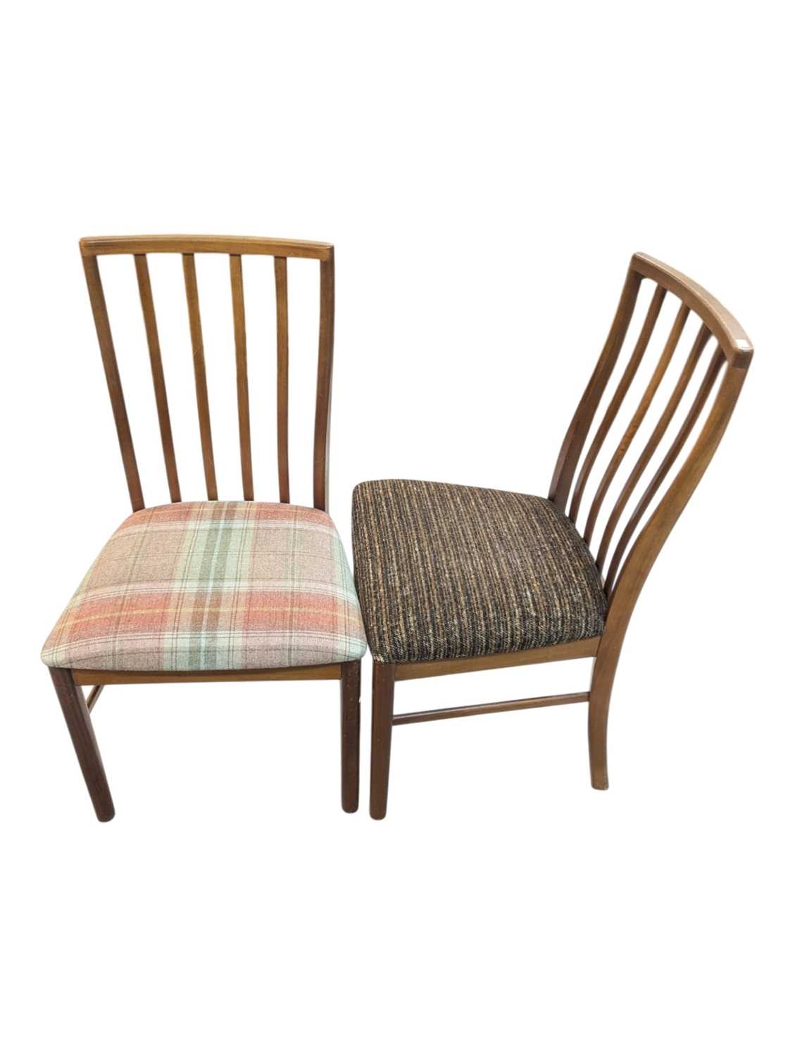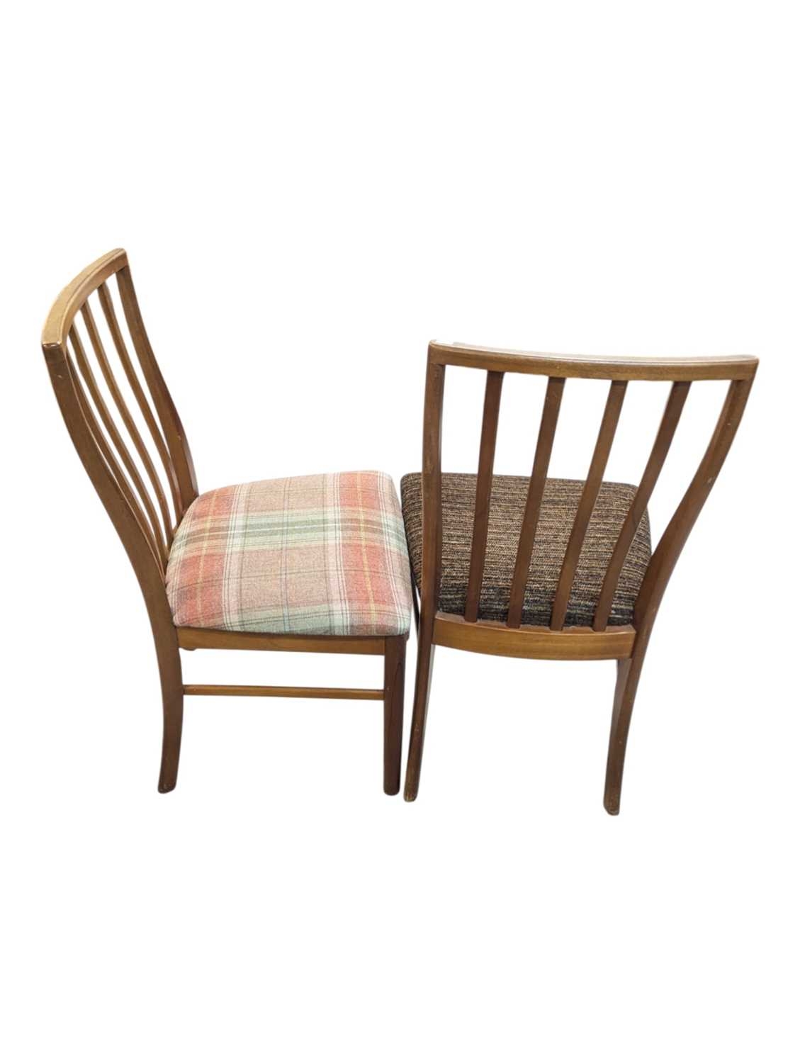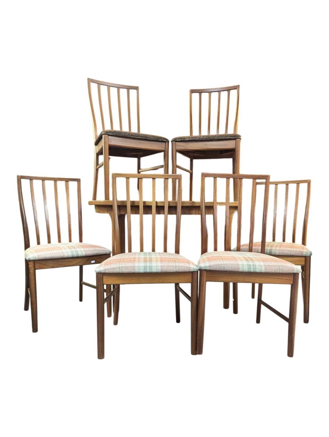 Mid century teak extending dining table along with a set of 4 curved spindle back chairs having tartan upholstered seat pads. Measures approx: 77x122x122/167 extended cm